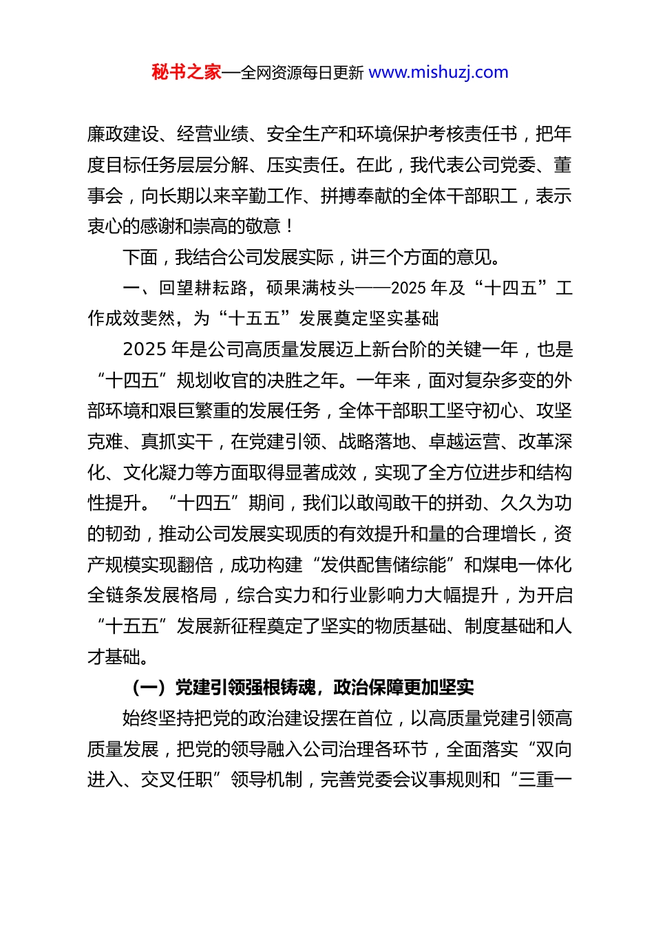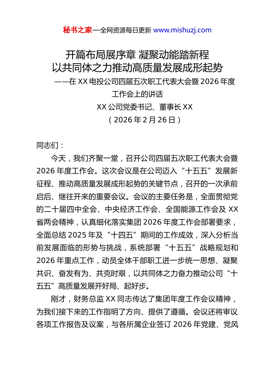 秘书之家—全网资源每日更新 www.mishuzj.com开篇布局展序章 凝聚动能踏新程以共同体之力推动高质量发展成形起势——在 XX 电投公司四届五次职工代表大会暨 2026 年度工作会上的讲话XX 公司党委书记、董事长 XX(2026 年 2 月 26 日)同志们:今天,我们齐聚一堂,召开公司四届五次职工代表大会暨2026 年度工作会。这次会议是在公司迈入“十五五”发展新征程、推动高质量发展成形起势的关键节点,召开的一次承前启后、继往开来的重要会议。会议的主要任务是,全面贯彻党的二十届四中全会、中央经济工作会、全国能源工作会及 XX省两会精神,认真细化落实集团 2026 年度工作会部署要求,全面总结 2025 年及“十四五”期间的工作成效,深入分析当前发展面临的形势与挑战,系统部署“十五五”战略规划和2026 年重点工作,动员全体干部职工进一步统一思想、凝聚共识、奋发有为、共克时艰,以共同体之力奋力推动公司“十五五”高质量发展开好局、起好步。刚才,财务总监 XX 同志传达了集团年度工作会议精神,为我们接下来的工作指明了方向、提供了遵循。会议还将审议各项工作报告及议案,与各所属企业签订 2026 年党建、党风秘书之家—全网资源每日更新 www.mishuzj.com廉政建设、经营业绩、安全生产和环境保护考核责任书,把年度目标任务层层分解、压实责任。在此,我代表公司党委、董事会,向长期以来辛勤工作、拼搏奉献的全体干部职工,表示衷心的感谢和崇高的敬意!下面,我结合公司发展实际,讲三个方面的意见。一、回望耕耘路,硕果满枝头——2025 年及“十四五”工作成效斐然,为“十五五”发展奠定坚实基础2025 年是公司高质量发展迈上新台阶的关键一年,也是“十四五”规划收官的决胜之年。一年来,面对复杂多变的外部环境和艰巨繁重的发展任务,全体干部职工坚守初心、攻坚克难、真抓实干,在党建引领、战略落地、卓越运营、改革深化、文化凝力等方面取得显著成效,实现了全方位进步和结构性提升。“十四五”期间,我们以敢闯敢干的拼劲、久久为功的韧劲,推动公司发展实现质的有效提升和量的合理增长,资产规模实现翻倍,成功构建“发供配售储综能”和煤电一体化全链条发展格局,综合实力和行业影响力大幅提升,为开启“十五五”发展新征程奠定了坚实的物质基础、制度基础和人才基础。(一)党建引领强根铸魂,政治保障更加坚实始终坚持把党的政治建设摆在首位,以高质量党建引领高质量发展,把党的领导融入公司治理各环节,全面落实“双向进入、交叉任职”领导机制,完善党委会议事规则和“三重一秘书之家—全网资源每日更新 www.mishuzj.com大”决策管理制度,切实发挥党委“把方向、管大局、保落实”的领导作用。深入学习贯彻习近平新时代中国特色社会主义思想,严格落实“第一议题”制度,通过党委理论学习中心组领学、党支部研学、班组践学等形式,推动理论学习走深走实,全体干部职工的政治判断力、政治领悟力、政治执行力持续提升。纵深推进全面从严治党,层层压实党建工作责任和党风廉政建设“两个责任”,构建常态化监督体系,开展专项巡察和廉政教育,营造了风清气正的政治生态。深化党建与生产经营深度融合,开展“党员先锋岗”“党员攻坚队”等创建活动,在重点项目建设、能源保供一线设立党建阵地,让党旗在发展一线高高飘扬,党组织的战斗堡垒作用和党员的先锋模范作用得到充分发挥。(二)战略落地步履铿锵,发展格局全面升级紧扣国家能源战略和集团发展部署,立足 XX 省能源发展实际,科学谋划公司发展路径,推动战略规划层层落地、步步见效。“十四五”期间,我们抢抓能源革命和新型电力系统建设机遇,持续优化产业布局,从单一的发电企业向综合能源服务商转型,成功构建起“发供配售储综能”一体化发展体系,煤电一体化全链条发展格局基本形成,实现了从“点上突破”到“面上开花”的发展跨越。资产规模较“十三五”末实现翻倍增长,电源结构持续优化,煤电清洁高效利用水平不断提升,新能源项目布局有序推进,储能、综合能源服务等新业态快速秘书之家—全网资源每日更新 www.mishuzj.com发展。“四基地三中心”发展框架逐...