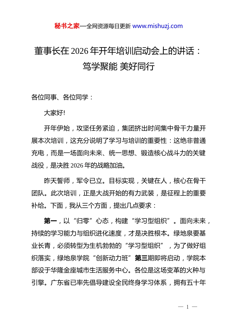 秘书之家—全网资源每日更新 www.mishuzj.com董事长在 2026 年开年培训启动会上的讲话:笃学聚能 美好同行各位同事、各位同学:大家好!开年伊始,攻坚任务紧迫,集团挤出时间集中骨干力量开展本次培训,这充分说明了学习与培训的重要性:这绝非普通充电,而是一场面向未来、统一思想、锻造核心战斗力的关键战役,是决胜 2026 年的战略加油。昨天誓师,军令已立。目标实现,关键在人,核心在骨干团队。此次培训,正是大战开始的有力武装,是征程上的重要补给。下面,我从三个方面,提出几点要求:第一,以“归零”心态,构建“学习型组织”。面向未来,持续的学习能力与组织进化速度,才是决胜根本。绿地泉要基业长青,必须转型为生机勃勃的“学习型组织”,为了做好组织落实,绿地泉学院“创新动力班”第三期即将启动,学院本部设于华隆金座城市生活服务中心。各位是这场变革的火种与引擎。广东省已率先倡导建设全民终身学习体系,拥有五十年— 1 —秘书之家—全网资源每日更新 www.mishuzj.com积淀的绿地泉,更应责无旁贷。我们要立即行动,构建覆盖全员的终身学习体系,并积极推进“文化+培训”成为未来的新增长曲线。各位骨干既要当好学习者,也要成为传播者,通过导师制、分享会等形式传递所学,在“教”的过程中深化理解,在“带”的过程中发现新才。让我们共同将绿地泉,打造成“人人皆学、处处能学、时时可学”的成长平台,让学习力真正成为我们的第一生产力!第二,主动拥抱 ai,开启“智能化”新篇章。拥抱人工智能等新质生产力,是关乎生存的必答题。ai 是“如虎添翼”的装备,旨在解放我们,更好的从事更具创造性和有温度的工作。对此,对大家有三个层面的要求:业务上,要成为“ai+场景”应用的先锋队。营销的同事,想想如何用 ai 更懂客户;工程的同事,琢磨如何让 ai 优化成本。每位骨干学习后,至少要形成一个“ai 赋能业务”的行动计划。管理上,要成为数据驱动决策的践行者,推动管理从“经验判断”转向“数据辅助决策”。学习上,要利用 ai 实现个人能力“加速进化”,使其成为汲取知识、解决问题的得力伙伴。第三,践行“员工第一”,让奋斗者受尊重、得成长。“员工第一”是凝聚人心、激发内驱力的根本。集团的发展,— 2 —秘书之家—全网资源每日更新 www.mishuzj.com主要依靠的是中高层和骨干团队,以及每一位奋战在一线的员工。首先,坚持“奋斗者第一”。集团将全力完善激励机制,让为攻坚克难、创新突破作出贡献的奋斗者,在物质上丰收、精神上光荣、平台上晋升。奖金要发得让人眼红,晋升要快得让人心动。让“以贡献论英雄”成为铁律。其次,提供“成就事业”的宽舞台。加大授权赋能,敢于给年轻人压担子、搭台子,帮助大家拓宽视野,实现个人价值与集团发展的同频共振。勇于解放思想,敢于打破常规。同时,传递“真诚关怀”的暖温度。各级管理者要走近员工,倾听心声,解决实际困难。一个被真心关爱的团队,才拥有强大的凝聚力与战斗力。各位同事、各位同学:干部与“骨干”意味着责任与标杆。你们的状态,决定了团队的状态;你们的高度,影响着集团的高度。希望大家珍惜接下来的每一分每一秒,以空杯心态汲取新知,以创业激情碰撞思想。将学习收获转化为攻坚克难的锐利武器,将思想统一凝聚成决战决胜的磅礴力量!让我们一起学习,聚能成长,美好同行。谢谢大家!— 3 —