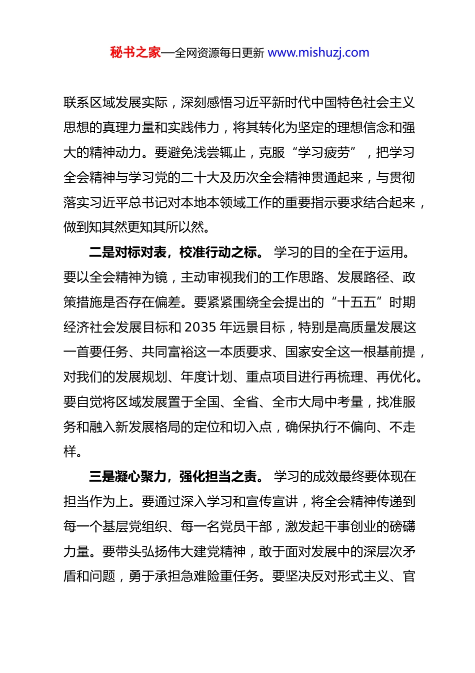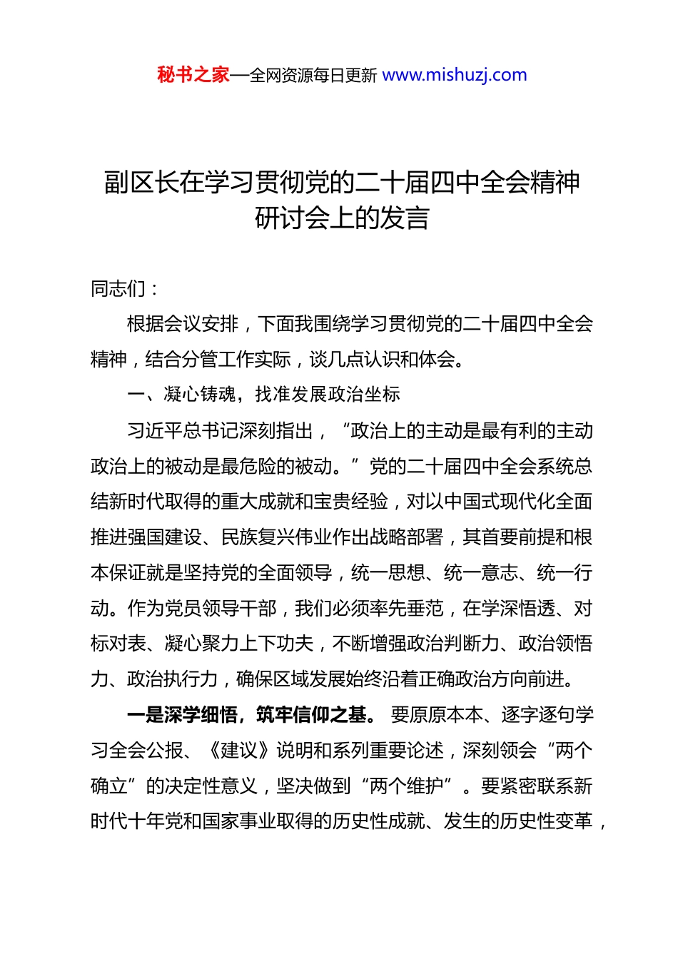 秘书之家—全网资源每日更新 www.mishuzj.com副区长在学习贯彻党的二十届四中全会精神研讨会上的发言同志们:根据会议安排,下面我围绕学习贯彻党的二十届四中全会精神,结合分管工作实际,谈几点认识和体会。一、凝心铸魂,找准发展政治坐标习近平总书记深刻指出,“政治上的主动是最有利的主动政治上的被动是最危险的被动。”党的二十届四中全会系统总结新时代取得的重大成就和宝贵经验,对以中国式现代化全面推进强国建设、民族复兴伟业作出战略部署,其首要前提和根本保证就是坚持党的全面领导,统一思想、统一意志、统一行动。作为党员领导干部,我们必须率先垂范,在学深悟透、对标对表、凝心聚力上下功夫,不断增强政治判断力、政治领悟力、政治执行力,确保区域发展始终沿着正确政治方向前进。一是深学细悟,筑牢信仰之基。 要原原本本、逐字逐句学习全会公报、《建议》说明和系列重要论述,深刻领会“两个确立”的决定性意义,坚决做到“两个维护”。要紧密联系新时代十年党和国家事业取得的历史性成就、发生的历史性变革,秘书之家—全网资源每日更新 www.mishuzj.com联系区域发展实际,深刻感悟习近平新时代中国特色社会主义思想的真理力量和实践伟力,将其转化为坚定的理想信念和强大的精神动力。要避免浅尝辄止,克服“学习疲劳”,把学习全会精神与学习党的二十大及历次全会精神贯通起来,与贯彻落实习近平总书记对本地本领域工作的重要指示要求结合起来,做到知其然更知其所以然。二是对标对表,校准行动之标。 学习的目的全在于运用。要以全会精神为镜,主动审视我们的工作思路、发展路径、政策措施是否存在偏差。要紧紧围绕全会提出的“十五五”时期经济社会发展目标和 2035 年远景目标,特别是高质量发展这一首要任务、共同富裕这一本质要求、国家安全这一根基前提,对我们的发展规划、年度计划、重点项目进行再梳理、再优化。要自觉将区域发展置于全国、全省、全市大局中考量,找准服务和融入新发展格局的定位和切入点,确保执行不偏向、不走样。三是凝心聚力,强化担当之责。 学习的成效最终要体现在担当作为上。要通过深入学习和宣传宣讲,将全会精神传递到每一个基层党组织、每一名党员干部,激发起干事创业的磅礴力量。要带头弘扬伟大建党精神,敢于面对发展中的深层次矛盾和问题,勇于承担急难险重任务。要坚决反对形式主义、官秘书之家—全网资源每日更新 www.mishuzj.com僚主义,以“时时放心不下”的责任感和积极担当作为的精气神,推动全会部署的各项任务在基层落地生根、开花结果,用实实在在的发展成效诠释对党的忠诚。二、强基赋能,夯实高质量发展支撑习近平总书记反复强调,“高质量发展是全面建设社会主义现代化国家的首要任务。”党的二十届四中全会审议通过的“十五五”规划《建议》,核心导向就是推动高质量发展取得新成效,并对建设现代化产业体系、增强创新能力、全面深化改革等作出重点部署。我们必须牢牢把握高质量发展这个硬道理,紧密结合区域资源禀赋和产业基础,在强产业、深改革、促创新上持续用力,为区域长远发展注入强劲动能。一是聚焦实体经济,激活产业发展内生动力。 要始终坚持把发展经济的着力点放在实体经济上,深刻理解“把制造业搞上去”的战略意义。要立足我区现有产业规模,一手抓传统产业转型升级,运用先进适用技术特别是数字化、智能化手段进行改造提升,推动产业向高端化、智能化、绿色化迈进;另一手抓新兴产业发展壮大,紧密对接国家战略性新兴产业布局,有选择地发展新材料、高端装备制造、生物医药等具有比较优势和发展潜力的产业,避免盲目跟风、一哄而上。要高度重视营商环境优化,把保护企业家合法权益、激发市场主体活力摆秘书之家—全网资源每日更新 www.mishuzj.com在突出位置,持续深化“放管服”改革,破除市场准入壁垒,打造稳定、公平、透明、可预期的发展环境,让国企敢干、民企敢闯、外企敢投。二是聚焦瓶颈制约,深化改革破解发展难题。 改革是发展的根本动力。要以落实全会关于“进一步全面深化改革取得新突破”的要求为契机,聚焦制约我区高质量发展的突出矛盾和体制机制障碍,拿出...