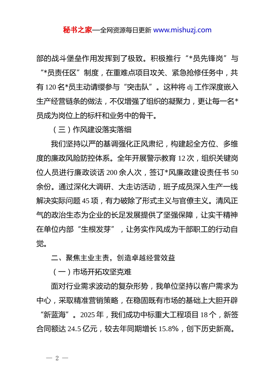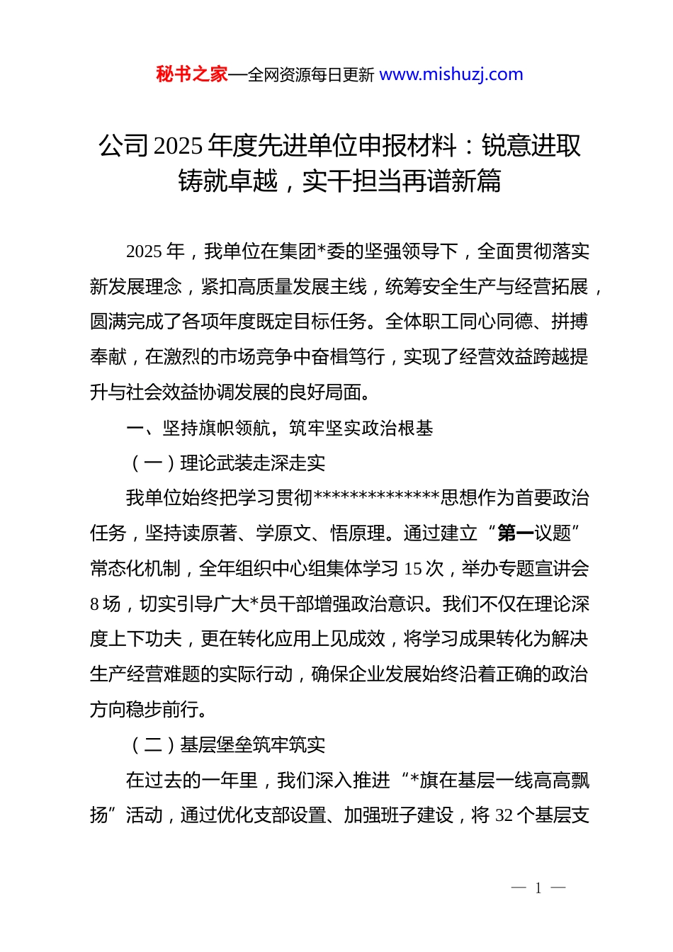 秘书之家—全网资源每日更新 www.mishuzj.com公司 2025 年度先进单位申报材料:锐意进取铸就卓越,实干担当再谱新篇2025 年,我单位在集团*委的坚强领导下,全面贯彻落实新发展理念,紧扣高质量发展主线,统筹安全生产与经营拓展,圆满完成了各项年度既定目标任务。全体职工同心同德、拼搏奉献,在激烈的市场竞争中奋楫笃行,实现了经营效益跨越提升与社会效益协调发展的良好局面。一、坚持旗帜领航,筑牢坚实政治根基(一)理论武装走深走实我单位始终把学习贯彻**************思想作为首要政治任务,坚持读原著、学原文、悟原理。通过建立“第一议题”常态化机制,全年组织中心组集体学习 15 次,举办专题宣讲会8 场,切实引导广大*员干部增强政治意识。我们不仅在理论深度上下功夫,更在转化应用上见成效,将学习成果转化为解决生产经营难题的实际行动,确保企业发展始终沿着正确的政治方向稳步前行。(二)基层堡垒筑牢筑实在过去的一年里,我们深入推进“*旗在基层一线高高飘扬”活动,通过优化支部设置、加强班子建设,将 32 个基层支— 1 —秘书之家—全网资源每日更新 www.mishuzj.com部的战斗堡垒作用发挥到了极致。积极推行“*员先锋岗”与“*员责任区”制度,在重难点项目攻关、紧急抢修任务中,共有 120 名*员主动请缨参与“突击队”。这种将 dj 工作深度嵌入生产经营链条的做法,不仅增强了组织的凝聚力,更让每一名*员成为岗位上的标杆和业务中的骨干。(三)作风建设落实落细我们坚持以严的基调强化正风肃纪,构建起全方位、多维度的廉政风险防控体系。全年开展警示教育 12 次,组织关键岗位人员进行廉政谈话 200 余人次,签订*风廉政建设责任书 50余份。通过深化大调研、大走访活动,班子成员深入生产一线解决实际问题 45 项,有力破除了形式主义与官僚主义。清风正气的政治生态为企业的长足发展提供了坚强保障,让实干精神在单位内部“生根发芽”,让务实作风成为干部职工的行动自觉。二、聚焦主业主责,创造卓越经营效益(一)市场开拓攻坚克难面对行业需求波动的复杂形势,我单位坚持以客户需求为中心,采取精准营销策略,在稳固既有市场的基础上大胆开辟“新蓝海”。2025 年,我们成功中标重大工程项目 18 个,新签合同额达 24.5 亿元,较去年同期增长 15.8%,创下历史新高。— 2 —秘书之家—全网资源每日更新 www.mishuzj.com特别是在省外市场的布局上,通过设立 3 个区域服务中心,实现了业务覆盖范围的快速扩张。营销团队不畏艰辛,深入市场一线调研 300 余天,凭着过硬的技术方案和真诚的服务态度赢得了客户的广泛认可。(二)项目建设提质增效在项目执行过程中,我们全面推行标准化管理,确保每一个工程都成为“精品工程”。通过引入先进的项目管理软件,实现了从设计、采购到施工的全流程数字化监控,关键工期节点完成率达到 100%。2025 年,我单位负责的 5 个省级重点建设项目均提前交付,其中 2 个项目荣获行业最高质量奖项。我们坚持安全第一、预防为主,全年实现安全生产零事故目标,累计安全工时突破 250 万小时,在全省行业安全大检查中多次获得通报表扬。(三)技术研发创新驱动我们始终视创新为第一动力,持续加大研发投入,2025 年研发费用占营业收入比重提升至 6.2%。依托企业技术中心,我们成功攻克了 3 项行业共性技术难题,获得国家专利授权 25 项,其中发明专利 8 项。通过开展“揭榜挂帅”机制,激发了科研人员的创新活力,多项科研成果已成功转化应用,为公司贡献了近 20%的新增利润。这种以技术引领市场的竞争优势,使我— 3 —秘书之家—全网资源每日更新 www.mishuzj.com们在同行业中保持了核心领先地位,为企业的高端化转型奠定了坚实技术支撑。三、深化改革创新,激发强劲内生动力(一)组织架构优化整合为提升行政运行效率,我单位在 2025 年深度推进了组织扁平化改革。通过撤并职能重叠部门、压缩中间管理层级,使决策链条大幅缩短,行政响应速度提升了 35%。我们推行岗位聘任制,打破了“排资论辈”的传统观念,让 15 名优秀年轻中层干部脱颖而出,走上了关键管...