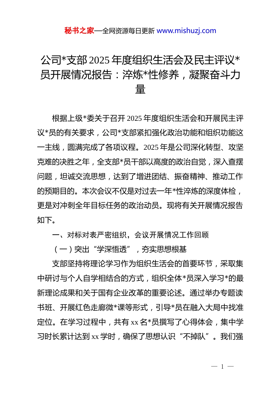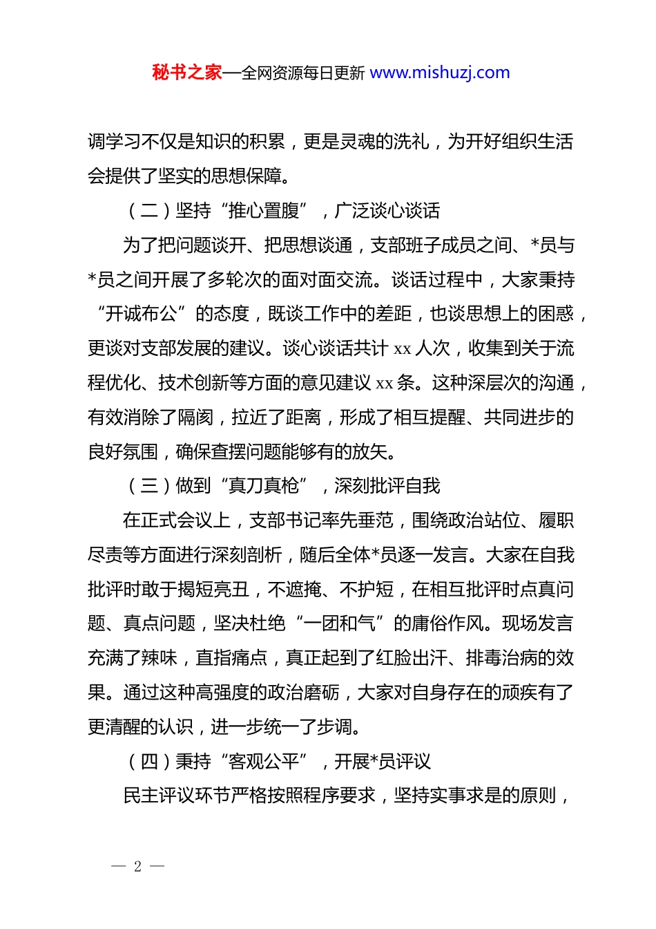 秘书之家—全网资源每日更新 www.mishuzj.com公司*支部 2025 年度组织生活会及民主评议*员开展情况报告:淬炼*性修养,凝聚奋斗力量根据上级*委关于召开 2025 年度组织生活会和开展民主评议*员的有关要求,公司*支部紧扣强化政治功能和组织功能这一主线,圆满完成了各项议程。2025 年是公司深化转型、攻坚克难的决胜之年,全支部*员干部以高度的政治自觉,深入查摆问题,坦诚交流思想,达到了增进团结、振奋精神、推动工作的预期目的。本次会议不仅是对过去一年*性淬炼的深度体检,更是对冲刺全年目标任务的政治动员。现将有关开展情况报告如下。一、对标对表严密组织,会议开展情况工作回顾(一)突出“学深悟透”,夯实思想根基支部坚持将理论学习作为组织生活会的首要环节,采取集中研讨与个人自学相结合的方式,组织全体*员深入学习*的最新理论成果和关于国有企业改革的重要论述。通过举办专题读书班、开展红色走廊微*课等形式,引导*员在融入大局中找准定位。在学习过程中,共有 xx 名*员撰写了心得体会,集中学习时长累计达到 xx 学时,确保了思想认识“不掉队”。我们强— 1 —秘书之家—全网资源每日更新 www.mishuzj.com调学习不仅是知识的积累,更是灵魂的洗礼,为开好组织生活会提供了坚实的思想保障。(二)坚持“推心置腹”,广泛谈心谈话为了把问题谈开、把思想谈通,支部班子成员之间、*员与*员之间开展了多轮次的面对面交流。谈话过程中,大家秉持“开诚布公”的态度,既谈工作中的差距,也谈思想上的困惑,更谈对支部发展的建议。谈心谈话共计 xx 人次,收集到关于流程优化、技术创新等方面的意见建议 xx 条。这种深层次的沟通,有效消除了隔阂,拉近了距离,形成了相互提醒、共同进步的良好氛围,确保查摆问题能够有的放矢。(三)做到“真刀真枪”,深刻批评自我在正式会议上,支部书记率先垂范,围绕政治站位、履职尽责等方面进行深刻剖析,随后全体*员逐一发言。大家在自我批评时敢于揭短亮丑,不遮掩、不护短,在相互批评时点真问题、真点问题,坚决杜绝“一团和气”的庸俗作风。现场发言充满了辣味,直指痛点,真正起到了红脸出汗、排毒治病的效果。通过这种高强度的政治磨砺,大家对自身存在的顽疾有了更清醒的认识,进一步统一了步调。(四)秉持“客观公平”,开展*员评议民主评议环节严格按照程序要求,坚持实事求是的原则,— 2 —秘书之家—全网资源每日更新 www.mishuzj.com从政治表现、执行纪律、发挥作用等五个维度对*员进行全方位评价。通过发放测评表,采取无记名方式进行差额评定,评选出优秀*员 xx 名,其余*员均为合格。评议结果不仅是一份“成绩单”,更是督促*员不断提升的动力源。会后,支部及时将评议结果进行公示,并与被评为优秀的同志进行勉励谈话,对表现平平的同志进行提醒谈话,确保评议工作真正发挥激励约束作用。二、直面差距深剖细找,当前面临的重点存在问题(一)理论转化“成效不显”,学用结合不够虽然支部在政治学习上下了不少功夫,但在如何将*的创新理论转化为解决生产经营难题的具体方案上,依然存在思考深度不足的问题。部分*员在面对市场波动和技术瓶颈时,习惯于套用老经验、老办法,缺乏“破茧成蝶”的创新勇气和实战本领。理论学习与业务实践之间还存在一定的脱节现象,导致在推动公司高质量发展的进程中,政治指导力未能充分转化为核心竞争力,学习的获得感和实效性有待进一步加强。(二)担当精神“后劲不足”,攻坚意识减退面对 2025 年繁重的改革任务和激烈的市场竞争,个别*员干部产生了松劲歇脚的心理,在急难险重任务面前存在畏难情绪。尤其是在冲刺年度关键指标时,有的同志满足于“守摊— 3 —秘书之家—全网资源每日更新 www.mishuzj.com子”,缺乏锐意进取、敢为人先的精气神。这种工作激情的衰减,直接表现为对新业务开拓的推诿和对工作标准的降低。如果在关键时刻不能保持昂扬的斗志,就很难在强手如林的行业竞争中占据主动权,支部的战斗堡垒作用也难以得到全方位体现。(三)作风建设“韧劲不够”,自我要求趋松虽然大环境持续向好,但部分*员在细节自律上仍有漏洞,形...