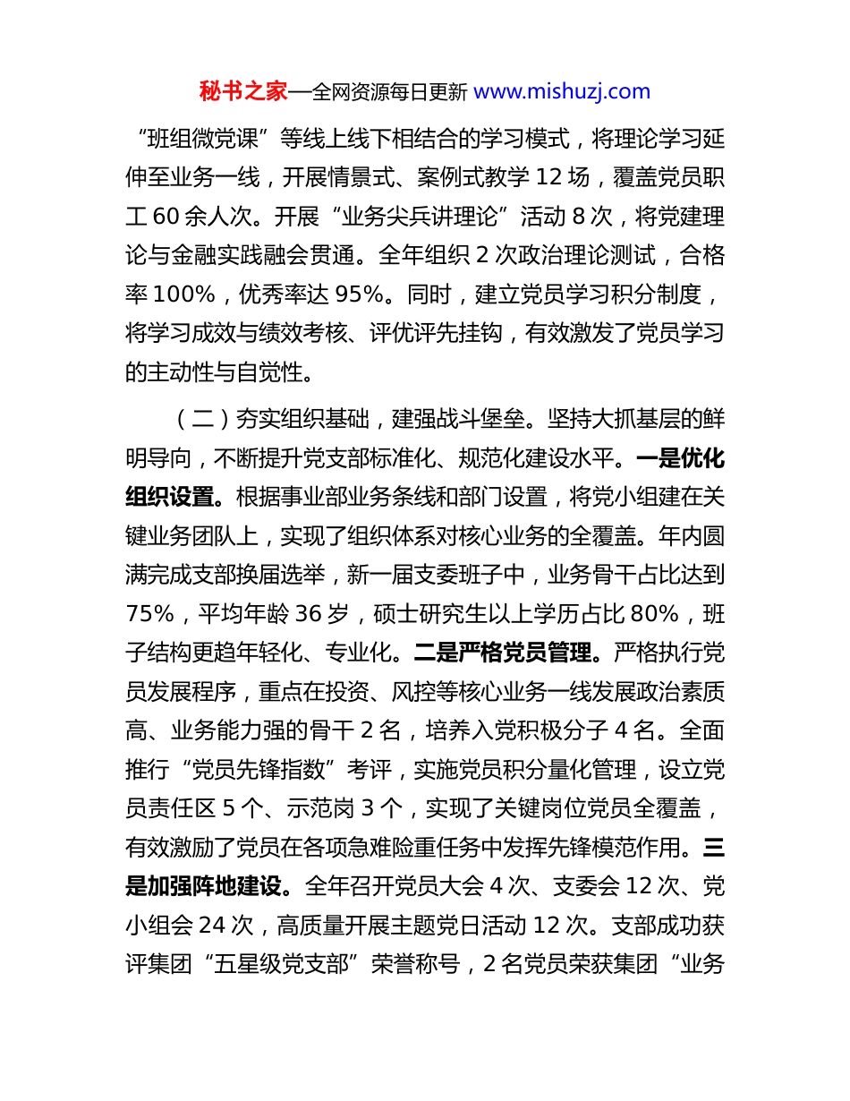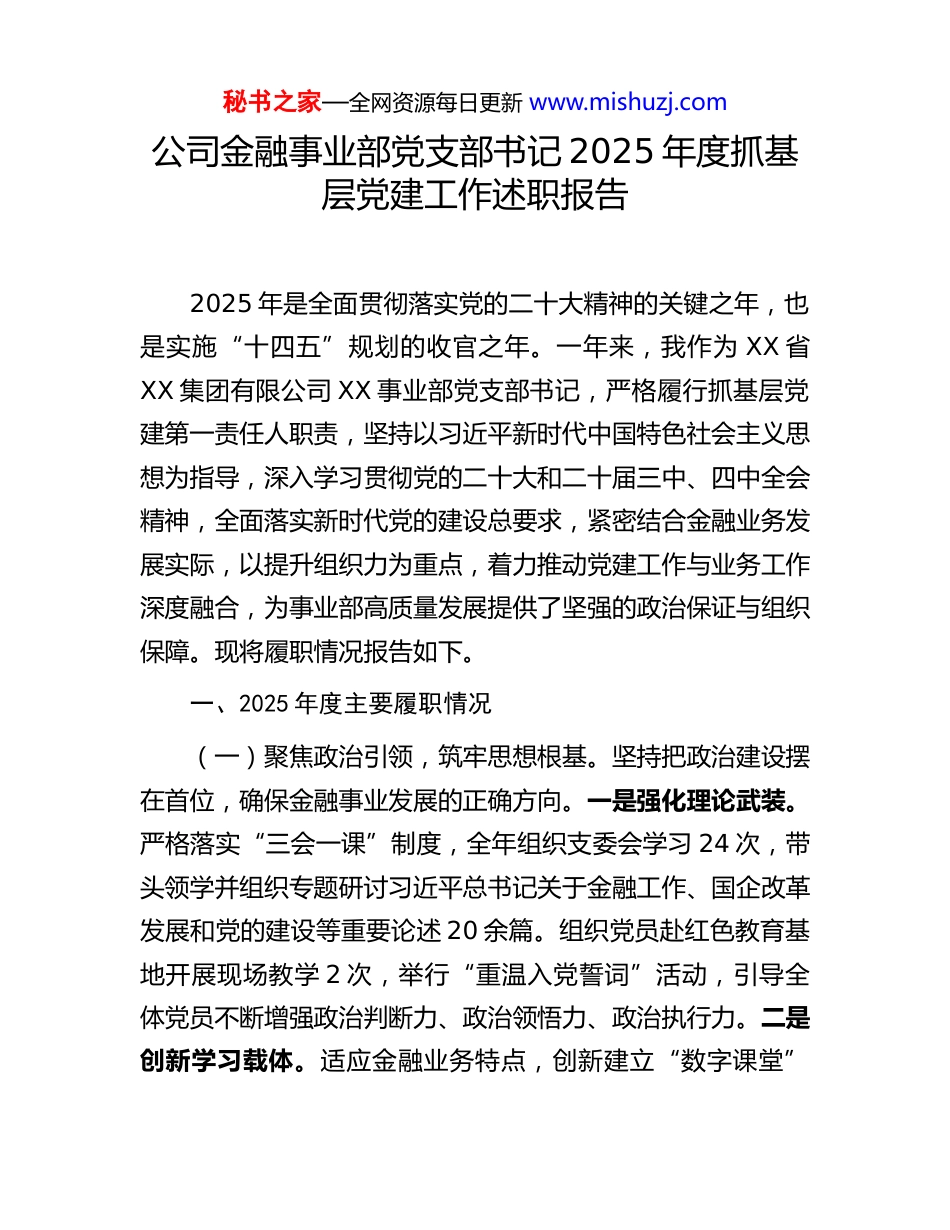 秘书之家—全网资源每日更新 www.mishuzj.com公司金融事业部党支部书记 2025 年度抓基层党建工作述职报告2025 年是全面贯彻落实党的二十大精神的关键之年,也是实施“十四五”规划的收官之年。一年来,我作为 XX 省XX 集团有限公司 XX 事业部党支部书记,严格履行抓基层党建第一责任人职责,坚持以习近平新时代中国特色社会主义思想为指导,深入学习贯彻党的二十大和二十届三中、四中全会精神,全面落实新时代党的建设总要求,紧密结合金融业务发展实际,以提升组织力为重点,着力推动党建工作与业务工作深度融合,为事业部高质量发展提供了坚强的政治保证与组织保障。现将履职情况报告如下。一、2025 年度主要履职情况(一)聚焦政治引领,筑牢思想根基。坚持把政治建设摆在首位,确保金融事业发展的正确方向。一是强化理论武装。严格落实“三会一课”制度,全年组织支委会学习 24 次,带头领学并组织专题研讨习近平总书记关于金融工作、国企改革发展和党的建设等重要论述 20 余篇。组织党员赴红色教育基地开展现场教学 2 次,举行“重温入党誓词”活动,引导全体党员不断增强政治判断力、政治领悟力、政治执行力。二是创新学习载体。适应金融业务特点,创新建立“数字课堂”秘书之家—全网资源每日更新 www.mishuzj.com“班组微党课”等线上线下相结合的学习模式,将理论学习延伸至业务一线,开展情景式、案例式教学 12 场,覆盖党员职工 60 余人次。开展“业务尖兵讲理论”活动 8 次,将党建理论与金融实践融会贯通。全年组织 2 次政治理论测试,合格率 100%,优秀率达 95%。同时,建立党员学习积分制度,将学习成效与绩效考核、评优评先挂钩,有效激发了党员学习的主动性与自觉性。(二)夯实组织基础,建强战斗堡垒。坚持大抓基层的鲜明导向,不断提升党支部标准化、规范化建设水平。一是优化组织设置。根据事业部业务条线和部门设置,将党小组建在关键业务团队上,实现了组织体系对核心业务的全覆盖。年内圆满完成支部换届选举,新一届支委班子中,业务骨干占比达到75%,平均年龄 36 岁,硕士研究生以上学历占比 80%,班子结构更趋年轻化、专业化。二是严格党员管理。严格执行党员发展程序,重点在投资、风控等核心业务一线发展政治素质高、业务能力强的骨干 2 名,培养入党积极分子 4 名。全面推行“党员先锋指数”考评,实施党员积分量化管理,设立党员责任区 5 个、示范岗 3 个,实现了关键岗位党员全覆盖,有效激励了党员在各项急难险重任务中发挥先锋模范作用。三是加强阵地建设。全年召开党员大会 4 次、支委会 12 次、党小组会 24 次,高质量开展主题党日活动 12 次。支部成功获评集团“五星级党支部”荣誉称号,2 名党员荣获集团“业务秘书之家—全网资源每日更新 www.mishuzj.com能手”称号。同时,升级改造党员活动室,购置专业书籍200 余册,不断完善硬件设施,为严肃规范开展组织生活提供了坚实保障。(三)深化党建融合,服务发展大局。坚持服务生产经营不偏离,以高质量党建引领高质量发展。一是创新融合机制。建立“党建+业务”双融双促机制,将党建工作要求深度嵌入项目投资、风险控制、客户服务等核心业务流程,制定并落实融合任务清单 32 项。组织开展“党员攻坚克难”活动,成立党员技术攻关小组 3 个,围绕金融科技创新、普惠金融服务等重点领域,成功解决业务难题 11 项,创造直接经济效益超百万元。二是搭建创效平台。持续开展“金点子”征集活动,全年收集涉及业务创新、管理优化的意见建议 40 余条,经论证采纳并实施 25 条,为事业部创造经济效益近 80 万元。深入实施“党员导师带徒”计划,15 名党员业务骨干与青年员工结成对子,成功培养出业务骨干 8 名,为事业部发展储备了后备力量。通过党建引领,事业部整体业务效率提升15%,风险控制精准度显著提高,客户满意度提升至 98%。(四)严抓作风建设,强化纪律保障。坚持把纪律和规矩挺在前面,持续营造风清气正的政治生态。一是深化纪律教育。持续巩固党纪学习教育成果,组织全体党员系统学习新修订的《中国共产党纪律处分条...