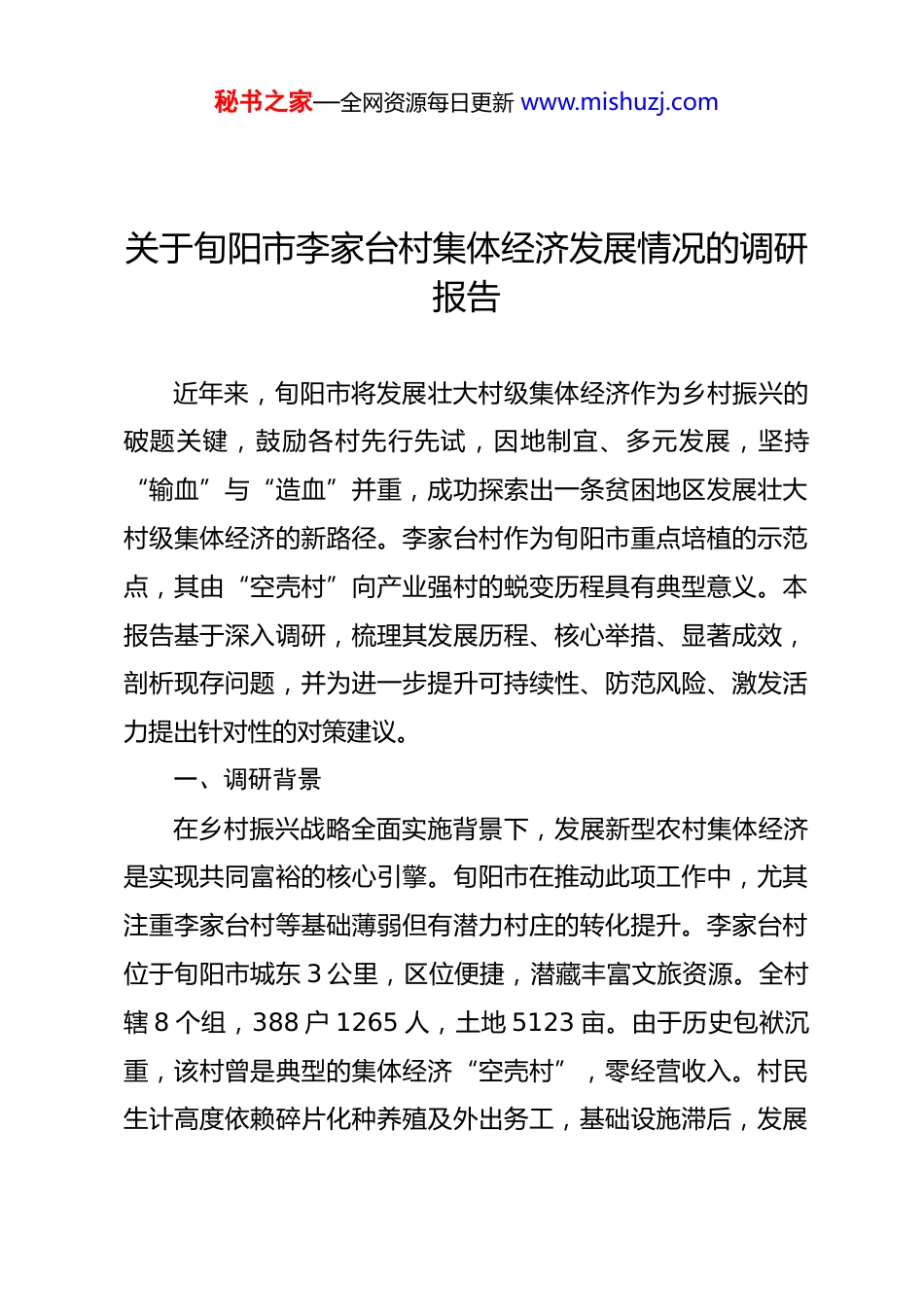 秘书之家—全网资源每日更新 www.mishuzj.com关于旬阳市李家台村集体经济发展情况的调研报告近年来,旬阳市将发展壮大村级集体经济作为乡村振兴的破题关键,鼓励各村先行先试,因地制宜、多元发展,坚持“输血”与“造血”并重,成功探索出一条贫困地区发展壮大村级集体经济的新路径。李家台村作为旬阳市重点培植的示范点,其由“空壳村”向产业强村的蜕变历程具有典型意义。本报告基于深入调研,梳理其发展历程、核心举措、显著成效,剖析现存问题,并为进一步提升可持续性、防范风险、激发活力提出针对性的对策建议。一、调研背景在乡村振兴战略全面实施背景下,发展新型农村集体经济是实现共同富裕的核心引擎。旬阳市在推动此项工作中,尤其注重李家台村等基础薄弱但有潜力村庄的转化提升。李家台村位于旬阳市城东 3 公里,区位便捷,潜藏丰富文旅资源。全村辖 8 个组,388 户 1265 人,土地 5123 亩。由于历史包袱沉重,该村曾是典型的集体经济“空壳村”,零经营收入。村民生计高度依赖碎片化种养殖及外出务工,基础设施滞后,发展秘书之家—全网资源每日更新 www.mishuzj.com动能孱弱。构成决定性转折点是在中核集团定点帮扶后,该村连续三任优秀驻村第一书记,注入发展亟需的外部资源、先进理念和专业力量。借此强大支撑,旬阳市精准发挥资金杠杆作用,以李家台村为农村综合改革试点村,积极探索集体经济发展新路径。在政企社三方合力下,李家台村迈进由贫困村向“产业兴、生态美、乡风淳、治理优、百姓富”的蜕变之路。二、实施现状(中核集团全程助力发展的轨迹)(一)基本情况与发展阶段2017 年以前:集体经济收入为零,无经营性资产,是深度薄弱村。2018 年(中核赋能起点):率先启动农村集体产权制度改革。在中核驻村干部强力推动与专业指导下,成立村级股份经济合作社(李家台村股份经济合作社)。整合流转闲置土地1200 亩入股农业企业,当年即获分红 27.11 万元,实现收入为“零”的突破。2019 年(中核强力注入):产业框架初步构建。以中核集团援建资金为种子基金(首期投入 300 万元),整合各类资金 612 万元,村集体成立运营公司及专业合作社,重点打造核心项目——规模化生态农业产业园(辣椒集约化育苗基地)。该基地于 2020 年为全市供苗,辐射带动发展辣椒 8000 亩,秘书之家—全网资源每日更新 www.mishuzj.com为集体经济贡献净收益 91 万元。同年,在中核技术指导与 80万元资金支持下,建成 140kW 分布式光伏电站,当年并网发电获收益 24 万元。2021—2022 年(中核持续支持):产业融合拓展升级。在前期中核培育的产业基础上,建成集采摘观光于一体的千亩精品水果园(涵盖柑橘 200 亩、特色水果 500 亩),发展农趣采摘项目,带动集体收益 90 余万元(其中柑橘园销售收入100 万元/年,特色水果及采摘门票等收入构成其余部分)。同时,创新组建“李家台产业联盟体”,整合合作社与企业优势资源。2023—2025 年(中核催化升级):深化文旅融合布局。借力中核提供的战略规划与关键资源对接(如规划设计建议、品牌推广渠道),重点布局“农趣采摘园”、“花溪民宿聚落”、“云顶观极台”三大板块,并加速建设“核李寻梦亲子营地”特色 IP。启动 3A 级景区申报工作,文旅产业成为集体经济增长新引擎。(二)成效显著的创新举措1.产权制度改革(中核助力启动)。模式与突破:在驻村干部直接协调下,李家台村在全县率先完成“资源变资产、资金变股金、农民变股东”的“三变”秘书之家—全网资源每日更新 www.mishuzj.com改革,成立股份经济合作社,彻底盘活沉睡资源。合作社建立土地集中流转→规模化经营机制,打破家庭碎片化经营困局。效益与数据:一是规模化经营提质增效。集中连片整合耕地 1200 亩,引入现代农业企业与某科技公司合作,规模发展特色蔬菜(主品:辣椒、西红柿)、优质水果(主品:柑橘、特色时令果)800 亩。亩均收益由改革前传统种植约 1500 元/年跃升至 5000 元/年以上,增速超 233%。其中特色蔬菜通过科技赋能,产量提升约 30%,优质果品市场溢价达 20%。二是村民增收渠道多元...