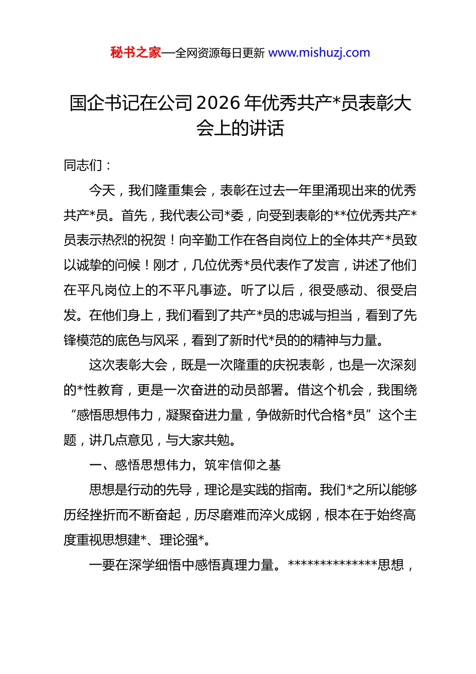 秘书之家—全网资源每日更新 www.mishuzj.com国企书记在公司 2026 年优秀共产*员表彰大会上的讲话同志们:今天,我们隆重集会,表彰在过去一年里涌现出来的优秀共产*员。首先,我代表公司*委,向受到表彰的**位优秀共产*员表示热烈的祝贺!向辛勤工作在各自岗位上的全体共产*员致以诚挚的问候!刚才,几位优秀*员代表作了发言,讲述了他们在平凡岗位上的不平凡事迹。听了以后,很受感动、很受启发。在他们身上,我们看到了共产*员的忠诚与担当,看到了先锋模范的底色与风采,看到了新时代*员的的精神与力量。这次表彰大会,既是一次隆重的庆祝表彰,也是一次深刻的*性教育,更是一次奋进的动员部署。借这个机会,我围绕“感悟思想伟力,凝聚奋进力量,争做新时代合格*员”这个主题,讲几点意见,与大家共勉。一、感悟思想伟力,筑牢信仰之基思想是行动的先导,理论是实践的指南。我们*之所以能够历经挫折而不断奋起,历尽磨难而淬火成钢,根本在于始终高度重视思想建*、理论强*。一要在深学细悟中感悟真理力量。**************思想,秘书之家—全网资源每日更新 www.mishuzj.com是当代中国马克思主义、二十一世纪马克思主义,是中华文化和中国精神的时代精华,是我们一切工作的根本遵循和行动指南。这一重要思想,系统回答了新时代坚持和发展什么样的中国特色社会主义、怎样坚持和发展中国特色社会主义等重大时代课题,闪耀着马克思主义的真理光芒。我们每一名*员都要把学习贯彻**************思想作为首要政治任务,坚持读原著、学原文、悟原理,深刻理解其核心要义、精神实质、丰富内涵、实践要求。要结合学习教育常态化长效化,从*的百年奋斗历程中感悟信仰的力量,从新时代伟大变革中感受思想的伟力。要通过持续深入的学习,不断增进对*的创新理论的政治认同、思想认同、理论认同、情感认同。二要在对标对表中筑牢忠诚之魂。对*忠诚,是共产*人首要的政治品质。******强调,对*忠诚,不是抽象的而是具体的,不是有条件的而是无条件的。我们每一名*员都要把对*忠诚刻进心里、融入血脉。要深刻领悟“两个确立”的决定性意义,增强“四个意识”、坚定“四个自信”、做到“两个维护”。要始终在思想上政治上行动上同以***同志为核心的*中央保持高度一致,*中央提倡的坚决响应、*中央决定的坚决执行、*中央禁止的坚决不做。要把对*忠诚体现到贯彻落实好*中央决策部署的实际行动上,体现到履职尽责做好本职工作的实秘书之家—全网资源每日更新 www.mishuzj.com际成效上,体现到日常言行的方方面面。三要在学以致用中提升履职本领。理论的价值在于指导实践。学习的目的在于运用。要把学习成果转化为坚定的理想信念,转化为推动工作的实际能力。要善于运用*的创新理论观察分析形势、研究解决问题,不断提高政治判断力、政治领悟力、政治执行力。当前行业深刻变革,市场形势复杂多变,对我们提出了新的更高要求。我们要从新思想中找方向、找方法、找答案,不断提高驾驭复杂局面、破解发展难题的能力。要学习蕴含其中的科学思想方法,坚持系统观念,统筹处理好规模与质量、当前与长远、发展与安全的关系。要坚持问题导向,聚焦市场拓展中的堵点难点,精准发力、攻坚克难。二、凝聚奋进力量,强化担当之责我们*之所以能够从小到大、由弱到强,带领人民不断从胜利走向胜利,靠的就是一代代共产*人的接续奋斗。新征程上,我们必须凝聚起团结奋斗的磅礴力量。一要在服务大局中展现担当。国有企业是中国特色社会主义的重要物质基础和政治基础。我们作为国有企业的*员,肩负着服务国家战略、推动企业发展的重要使命。要把个人追求融入*和人民的事业,把个人奋斗融入企业发展的洪流。当前,公司正处在转型升级、爬坡过坎的关键时期。市场拓展任务艰秘书之家—全网资源每日更新 www.mishuzj.com巨,项目履约责任重大,改革发展时不我待。每一名*员都要胸怀大局、着眼长远,把思想和行动统一到公司*委的决策部署上来,把智慧和力量凝聚到完成年度目标任务上来。要自觉服从组织安排,主动承担急难险重任务,在服务大局中展现共产*员的责任担当。二要在攻坚克难中彰显作为。这些年,公司之所以...