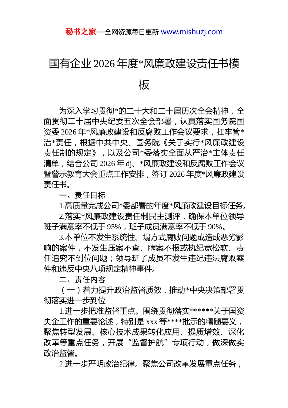 秘书之家—全网资源每日更新 www.mishuzj.com国有企业 2026 年度*风廉政建设责任书模板为深入学习贯彻*的二十大和二十届历次全会精神,全面贯彻二十届中央纪委五次全会部署,认真落实国务院国资委 2026 年*风廉政建设和反腐败工作会议要求,扛牢管*治*责任,根据中共中央、国务院《关于实行*风廉政建设责任制的规定》,以及公司*委落实全面从严治*主体责任清单,结合公司 2026 年 dj、*风廉政建设和反腐败工作会议暨警示教育大会重点工作安排,签订 2026 年度*风廉政建设责任书。一、责任目标1.高质量完成公司*委部署的年度*风廉政建设目标任务。2.落实*风廉政建设责任制民主测评,确保本单位领导班子满意率不低于 95%,班子成员满意率不低于 90%。3.本单位不发生系统性、塌方式腐败问题或造成恶劣影响的案件,不发生压案不查、瞒案不报或执纪宽松软、责任追究不到位问题;领导班子成员不发生违纪违法腐败案件和违反中央八项规定精神事件。二、责任内容(一)着力提升政治监督质效,推动*中央决策部署贯彻落实进一步到位1.进一步把准监督重点。围绕贯彻落实******关于国资央企工作的重要论述,特别是 xxx 等****批示的精髓要义,聚焦转型发展、核心技术成果转化应用、提质增效、深化改革等重点任务,开展“监督护航”专项行动,做深做实政治监督。2.进一步严明政治纪律。聚焦公司改革发展重点任务,秘书之家—全网资源每日更新 www.mishuzj.com结合公司巡视、干部考核等督导检查反馈情况,对新官不理旧账、弄虚作假、盲目铺摊子上项目等问题严肃追责。督促各级领导干部树立和践行正确政绩观,牢牢把握抓经营创效益这一主线,千方百计强经营、提效益、防风险,确保完成全年目标任务。(二)着力提升纪律教育质效,推动风清气正干事创业氛围营造进一步到位3.从严从实纠治“四风”顽疾。持续狠刹享乐主义、奢靡之风,深化整治违规吃喝、违规收送礼品礼金、违规收送“土特产”等突出问题,速查严处顶风违纪行为,持续整治形式主义、官僚主义,切实为基层减负。4.常态长效推进作风建设。巩固拓展深入贯彻中央八项规定精神学习教育成果,完善作风建设长效机制,强化对*员领导干部作风情况的监督,对易发多发的“节日病”紧盯不放、寸步不让。5.分层分类抓好 dj 教育。把纪律教育贯穿*员干部成长全周期、融入组织管理全过程,特别是加大对新提拔干部年轻干部和关键岗位干部的教育力度,常态化开展警示教育,深化开展*风廉政承诺践诺。(三)着力健全完善各类监督制度机制,推动权力规范运行进一步到位6.健全完善权力制约机制。严格执行民主集中制,突出*组织实质性把关,分层分类厘清各治理主体权责边界,以清单化、具体化举措,推动*组织有形嵌入治理架构、有效发挥功能作用。加强对决策制度执行情况的监督检查,严格落实《中央企业违规经营投资责任追究实施办法》,严防违规决策、任性用权。7.持续加强干部管理监督。深入落实关于加强对“一把手”和领导班子监督的意见,严格执行“三重一大”决策监督、述责述廉、廉政谈话等制度,加强对权力集中、资金密集、资源富集领域的岗位干部重点监督,强化经商办秘书之家—全网资源每日更新 www.mishuzj.com企业、离职后从业和亲属在系统内从业等管理,坚决纠正选人用人上的不正之风。(四)着力提升风腐同查同治质效,推动从严监督执纪进一步到位8.动真碰硬强化震慑。突出权力集中、资金密集、资源富集领域,持续深化风腐同查同治,着重查处“关键少数”、年轻干部腐败,严肃查处靠企吃企、利益输送等违纪违法行为和风腐问题。9.加大一体推进力度。健全完善*内监督与各类监督贯通协调机制,以“全链条”协作促进一体化防治。深入开展“铲除行动”,坚决铲除腐败滋生的土壤和条件。严格落实新修订的国有企业领导人员廉洁从业规定,深化“干净 xx”廉洁文化建设。10.注重数智赋能提效。持续深化数智监督系统运用,通过数据穿透分析预警识别、精准发现问题线索,进一步提升主动监督、精准监督能力,不断提高反腐败穿透力。(五)着力提升政治巡视质效,推动巡视巡察利剑作用发挥进一步到位11.提升精准发现问题的震慑力。对标上...