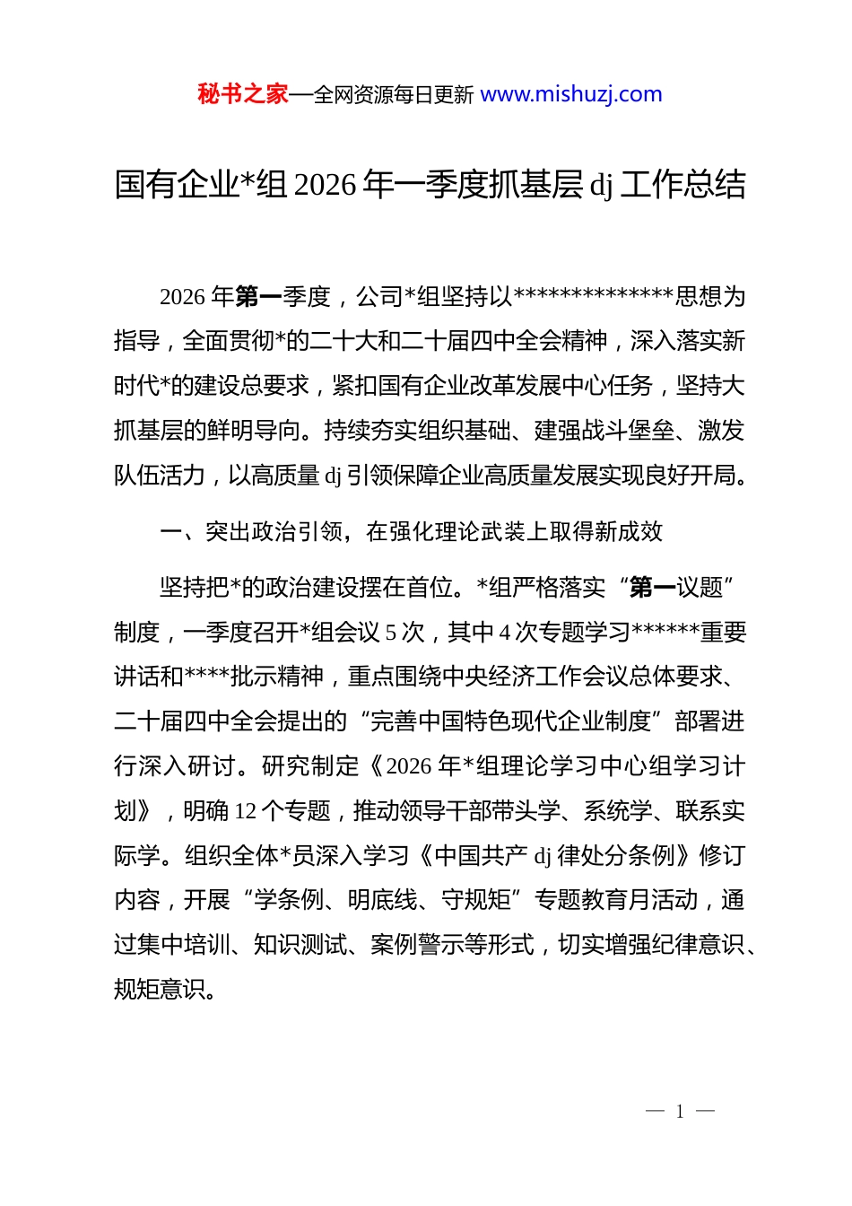 秘书之家—全网资源每日更新 www.mishuzj.com国有企业*组 2026 年一季度抓基层 dj 工作总结2026 年第一季度,公司*组坚持以**************思想为指导,全面贯彻*的二十大和二十届四中全会精神,深入落实新时代*的建设总要求,紧扣国有企业改革发展中心任务,坚持大抓基层的鲜明导向。持续夯实组织基础、建强战斗堡垒、激发队伍活力,以高质量 dj 引领保障企业高质量发展实现良好开局。一、突出政治引领,在强化理论武装上取得新成效坚持把*的政治建设摆在首位。*组严格落实“第一议题”制度,一季度召开*组会议 5 次,其中 4 次专题学习******重要讲话和****批示精神,重点围绕中央经济工作会议总体要求、二十届四中全会提出的“完善中国特色现代企业制度”部署进行深入研讨。研究制定《2026 年*组理论学习中心组学习计划》,明确 12 个专题,推动领导干部带头学、系统学、联系实际学。组织全体*员深入学习《中国共产 dj 律处分条例》修订内容,开展“学条例、明底线、守规矩”专题教育月活动,通过集中培训、知识测试、案例警示等形式,切实增强纪律意识、规矩意识。— 1 —秘书之家—全网资源每日更新 www.mishuzj.com深化*的创新理论宣传教育。结合企业实际,开展“新思想进车间、到班组”宣讲行动,组建由劳模*员、技术骨干组成的“红色轻骑兵”宣讲队,深入生产一线开展微*课 37 场次,用职工群众听得懂、能领会的语言讲透政策、凝聚共识。充分利用企业内刊、微信公众号、电子屏等载体,开设“奋进 2026”专栏,宣传贯彻*中央重大决策部署和企业发展战略目标,引导广大*员干部职工深刻领悟“两个确立”的决定性意义,坚决做到“两个维护”。二、夯实组织基础,在提升基层组织力上迈出新步伐持续推进*支部标准化规范化建设。对照《国有企业基层*组织工作条例》,组织开展一季度 dj 自查评估,重点检查“三会一课”、主题*日、组织生活会等制度执行情况,发现问题12 项,均已建立台账并限期整改。优化调整基层*组织设置,针对新成立的智能制造项目部,及时组建临时*支部,确保项目建设推进到哪里、*组织就覆盖到哪里。选优配强支部班子,完成 2 个任期届满*支部换届选举工作,选拔政治素质好、业务能力强的年轻干部进入支委班子。着力增强*组织政治功能和组织功能。深化“一支部一品牌”创建活动,各*支部结合岗位特点和业务实际,打造具有辨— 2 —秘书之家—全网资源每日更新 www.mishuzj.com识度的 dj 品牌。如机加车间*支部推行“*员先锋岗+质量控制点”模式,设立*员责任区 8 个,一季度产品一次交检合格率同比提高 2.3 个百分点;销售公司*支部实施“红色引擎·市场攻坚”行动,*员带头走访客户 56 家,促成订单金额超 1.2 亿元。在急难险重任务中充分发挥*组织战斗堡垒作用,面对年初极端天气导致物流中断的突发情况,运输分公司*支部迅速启动应急预案,*员突击队连续奋战 72 小时,保障了重点合同按时交付。三、聚焦中心任务,在推动融合发展上展现新作为推动 dj 与生产经营深度融合。坚持把服务企业改革发展作为 dj 工作的出发点和落脚点,围绕一季度“开门红”目标任务,组织开展“*旗在一线飘扬”主题实践活动。设立*员技术攻关小组 15 个,聚焦工艺优化、节能降耗等课题开展联合攻关,其中由焊接工艺*支部牵头的“铝合金薄板高效焊接技术研究”项目取得阶段性突破,预计年均可节约成本 800 万元以上。开展“金点子”征集活动,鼓励*员围绕提质增效建言献策,共收集合理化建议 213 条,采纳实施 67 条,创造直接经济效益约 350万元。加强干部人才队伍建设。坚持*管干部、*管人才原则,一季度完成中层管理人员年度考核评价工作,将 dj 工作履职情况— 3 —秘书之家—全网资源每日更新 www.mishuzj.com纳入重要考评指标。加大青年人才培养力度,实施“青苗成长计划”,遴选 30 名优秀青年*员纳入后备人才库,安排到重点项目、关键岗位轮岗锻炼。举办“工匠讲堂”系列培训 4 期,邀请国家级技能大师授课,参训*员职工达 420 人次,有效提升了专业素养和实操能力。四、严明纪律作风,在涵养政治生态...
