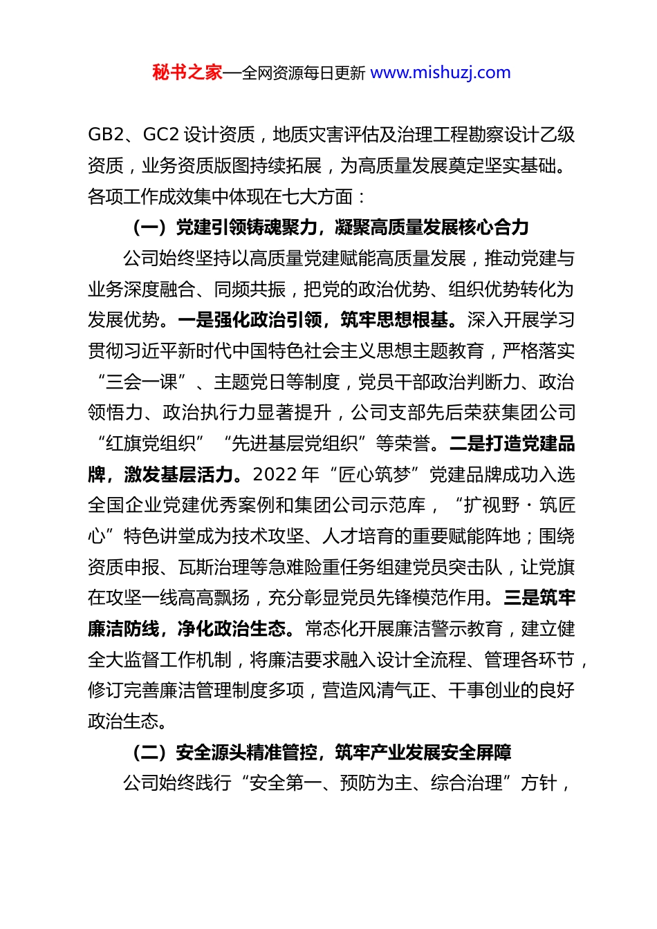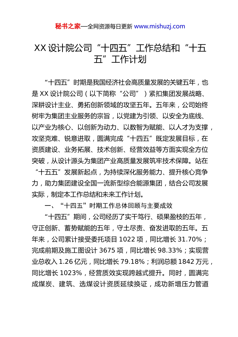 秘书之家—全网资源每日更新 www.mishuzj.comXX 设计院公司“十四五”工作总结和“十五五”工作计划“十四五”时期是我国经济社会高质量发展的关键五年,也是 XX 设计院公司(以下简称“公司”)紧扣集团发展战略、深耕设计主业、勇拓创新领域的攻坚五年。五年来,公司始终树牢为集团主业服务的宗旨,以党建为引领、以安全为底线、以产业为核心、以创新为动力、以数智为赋能、以人才为支撑,攻坚克难、锐意进取,圆满完成“十四五”既定发展目标,在资质建设、业务拓展、技术创新、经营效益等方面实现全方位突破,从设计源头为集团产业高质量发展筑牢技术保障。站在“十五五”发展新起点,为持续深化服务能力、提升核心竞争力,助力集团建设全国一流新型综合能源集团,结合公司发展实际,制定本工作总结和未来工作计划。一、“十四五”时期工作总体回顾与主要成效“十四五”期间,公司经历了实干笃行、硕果盈枝的五年,守正创新、蓄势赋能的五年,守土尽责、奋发进取的五年。五年来,公司累计接受委托项目 1022 项,同比增长 31.70%;完成前期及施工图设计 3675 项,同比增长 98.33%;实现营业总收入 1.26 亿元,同比增长 79.18%;利润总额 1842 万元,同比增长 1023%,经营质效实现跨越式提升。同时,圆满完成煤炭、建筑、选煤设计资质延续换证,成功新增压力管道秘书之家—全网资源每日更新 www.mishuzj.comGB2、GC2 设计资质,地质灾害评估及治理工程勘察设计乙级资质,业务资质版图持续拓展,为高质量发展奠定坚实基础。各项工作成效集中体现在七大方面:(一)党建引领铸魂聚力,凝聚高质量发展核心合力公司始终坚持以高质量党建赋能高质量发展,推动党建与业务深度融合、同频共振,把党的政治优势、组织优势转化为发展优势。一是强化政治引领,筑牢思想根基。深入开展学习贯彻习近平新时代中国特色社会主义思想主题教育,严格落实“三会一课”、主题党日等制度,党员干部政治判断力、政治领悟力、政治执行力显著提升,公司支部先后荣获集团公司“红旗党组织”“先进基层党组织”等荣誉。二是打造党建品牌,激发基层活力。2022 年“匠心筑梦”党建品牌成功入选全国企业党建优秀案例和集团公司示范库,“扩视野・筑匠心”特色讲堂成为技术攻坚、人才培育的重要赋能阵地;围绕资质申报、瓦斯治理等急难险重任务组建党员突击队,让党旗在攻坚一线高高飘扬,充分彰显党员先锋模范作用。三是筑牢廉洁防线,净化政治生态。常态化开展廉洁警示教育,建立健全大监督工作机制,将廉洁要求融入设计全流程、管理各环节,修订完善廉洁管理制度多项,营造风清气正、干事创业的良好政治生态。(二)安全源头精准管控,筑牢产业发展安全屏障公司始终践行“安全第一、预防为主、综合治理”方针,秘书之家—全网资源每日更新 www.mishuzj.com认真落实集团“六位一体”安全支撑体系建设要求,从设计源头防范化解关联安全风险。一是强化源头管控,夯实设计质量基石。严格执行三级校审制度,对系统设计、方案论证、图纸审核实施全流程闭环管理,确保设计方案与现场实际高度契合;强化设计质量监管,实现本土矿井设计服务季度监管全覆盖,设计质量合格率保持 100%。二是攻坚灾害治理,突破深部安全瓶颈。直面煤炭开采“四高一大”灾害挑战,完成张集矿、顾桥矿等 20 余口地面瓦斯治理井工程设计,推动集团“地面替代井下”瓦斯治理战略规模化应用;在朱集东矿首次设计应用 L 型井抽采技术,实现保护层卸压瓦斯高效治理,为深部煤炭安全开采破解技术难题。三是优化系统设计,构筑立体防护体系。持续优化矿井通风、防火、排水等核心系统设计,完成唐家会矿地面灌浆系统升级改造,谢桥、潘二等煤矿注氮、灌浆系统改造设计,创新应用自动化控制方案,矿井火灾综合防治能力得到显著增强,为集团矿井安全生产提供坚实设计支撑。(三)深耕产业发展布局,注入提质增效强劲动能公司深度融入集团战略布局,聚焦煤炭、煤电、清洁能源三大产业,精准发力、多点突破,设计服务能力和产业支撑作用持续提升。一是精准对接政策,全力争取资金支持。紧盯国家及安徽省产业政策导向,成功争...