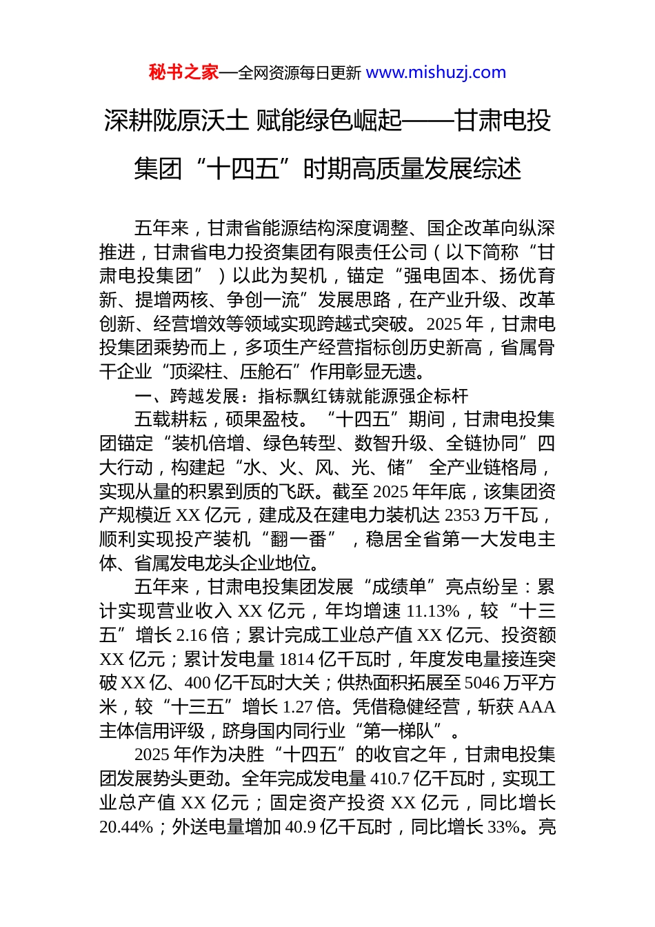 秘书之家—全网资源每日更新 www.mishuzj.com深耕陇原沃土 赋能绿色崛起——甘肃电投集团“十四五”时期高质量发展综述五年来,甘肃省能源结构深度调整、国企改革向纵深推进,甘肃省电力投资集团有限责任公司(以下简称“甘肃电投集团”)以此为契机,锚定“强电固本、扬优育新、提增两核、争创一流”发展思路,在产业升级、改革创新、经营增效等领域实现跨越式突破。2025 年,甘肃电投集团乘势而上,多项生产经营指标创历史新高,省属骨干企业“顶梁柱、压舱石”作用彰显无遗。一、跨越发展:指标飘红铸就能源强企标杆五载耕耘,硕果盈枝。“十四五”期间,甘肃电投集团锚定“装机倍增、绿色转型、数智升级、全链协同”四大行动,构建起“水、火、风、光、储” 全产业链格局,实现从量的积累到质的飞跃。截至 2025 年年底,该集团资产规模近 XX 亿元,建成及在建电力装机达 2353 万千瓦,顺利实现投产装机“翻一番”,稳居全省第一大发电主体、省属发电龙头企业地位。五年来,甘肃电投集团发展“成绩单”亮点纷呈:累计实现营业收入 XX 亿元,年均增速 11.13%,较“十三五”增长 2.16 倍;累计完成工业总产值 XX 亿元、投资额XX 亿元;累计发电量 1814 亿千瓦时,年度发电量接连突破 XX 亿、400 亿千瓦时大关;供热面积拓展至 5046 万平方米,较“十三五”增长 1.27 倍。凭借稳健经营,斩获 AAA主体信用评级,跻身国内同行业“第一梯队”。2025 年作为决胜“十四五”的收官之年,甘肃电投集团发展势头更劲。全年完成发电量 410.7 亿千瓦时,实现工业总产值 XX 亿元;固定资产投资 XX 亿元,同比增长20.44%;外送电量增加 40.9 亿千瓦时,同比增长 33%。亮秘书之家—全网资源每日更新 www.mishuzj.com眼业绩助力该集团斩获全省工业经济稳增长突出贡献奖等殊荣,在 2025 年度“中国能源企业 500 强”榜单中位列第234 位,较 2024 年跃升 13 位,综合竞争力稳步提升。二、创新驱动:项目攻坚与改革深化双向发力甘肃电投集团以重大项目建设为抓手,以国企改革深化提升为引擎,为高质量发展蓄势赋能。2025 年,总投资 XX 亿元的常乐、张掖电厂扩建项目 4台 100 万千瓦超超临界燃煤机组,仅用 85 天连续高质量投产,刷新全国百万千瓦级火电机组连续投产纪录,4 台机组全部一次通过 168 小时试运行,张掖电厂两台机组实现一月内双投。新能源项目建设蹄疾步稳,全国首创的庆阳“绿电聚合”试点项目开工, 绿电聚合新能源直供数据中心项目关键节点顺利完成;武威腾格里沙漠新能源大基地建设有序推进,多个风光项目加速落地,绿色转型步伐铿锵。改革创新纵深推进,激活发展内生动力。作为全省国有资本投资公司改革试点单位,甘肃电投集团全面完成 66项改革攻坚任务,形成 70 个典型经验案例。发挥电力产业和数据信息产业链链主企业作用,加快“电算融合”发展,全国首创燃料数智化全链条管理系统投运,电力交易辅助决策系统、5G+智慧电厂等数智化项目落地见效,为新质生产力发展贡献“电投方案”。三、党建引领:文化铸魂彰显国企责任担当党建领航,文化聚力。甘肃电投集团坚持党建与生产经营深度融合,以“党建链”赋能“产业链”,统筹“水、火、风、光、储”多能互补保障供电,依托“金张武”热电联产守护 200 万群众温暖过冬,通过陇投燃气保供外输天然气 3800 多万立方米,彰显国企担当。“十四五”期间,甘肃电投集团经营业绩、领导班子考评、党建责任制考核连续五年获评优秀,斩获全国文明单位、省长金融奖、首届“甘肃社会责任企业”等多项荣秘书之家—全网资源每日更新 www.mishuzj.com誉。该集团重塑“电投心”文化体系,革新标识、理念、行为三大系统,斩获“全国企业文化成果”二等奖,为2025 年甘肃省唯一获此殊荣的省属国企。甘肃电投集团本部通过“全国文明单位”复查,九甸峡公司首次获评第七届“全国文明单位”。征程万里风正劲,重任千钧再出发。甘肃电投集团党委书记、董事长蒲培文表示:“站在‘十五五’新起点,我们将秉持稳中求进总基调,锚定高质量发展首要任务,力争到 2030 年资产规模突破 2000 亿元、装机超 3000 万千瓦,打造‘五型’现代一流国有资本投资公司,为中国式现代化甘肃实践贡献电投力量。”