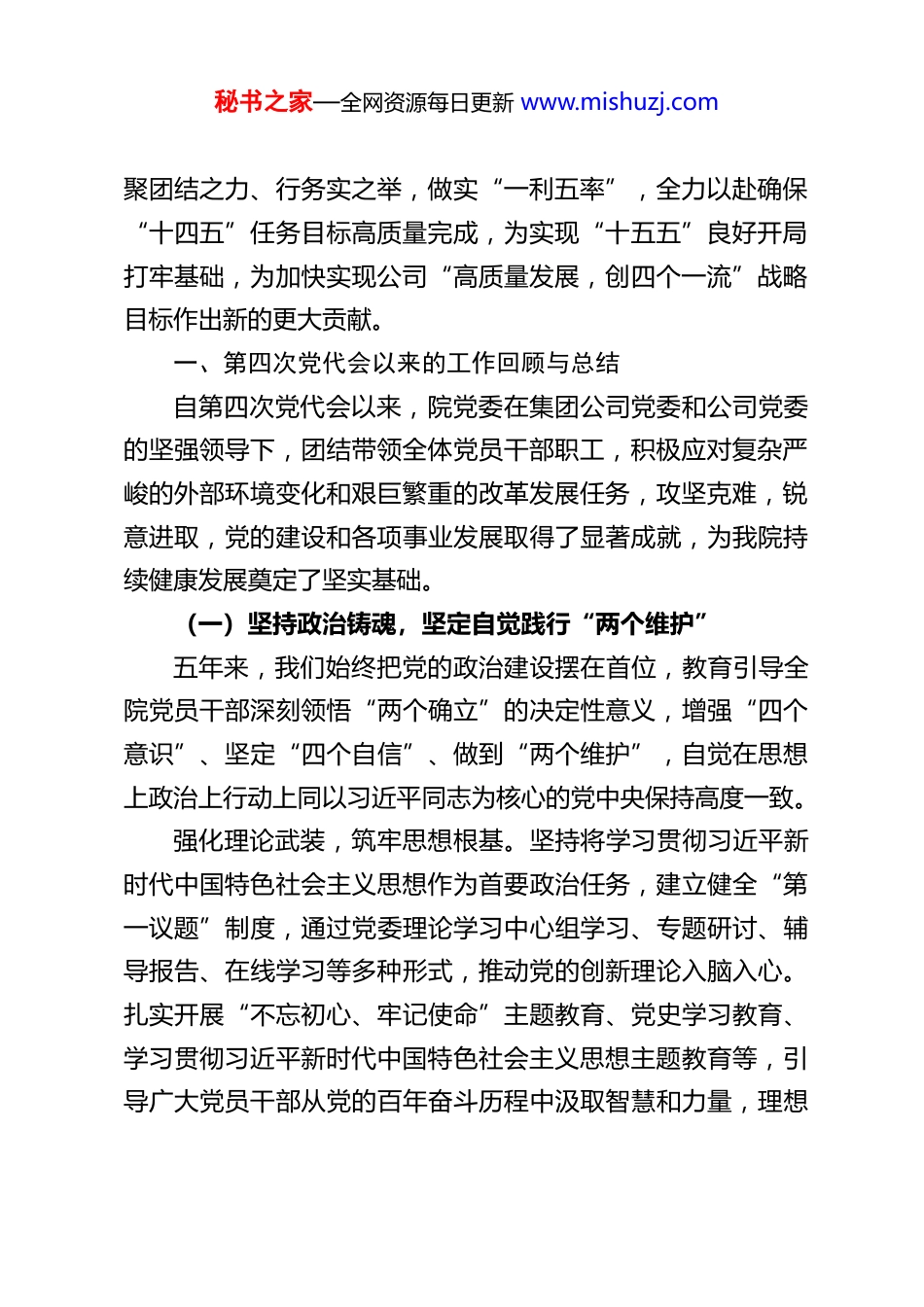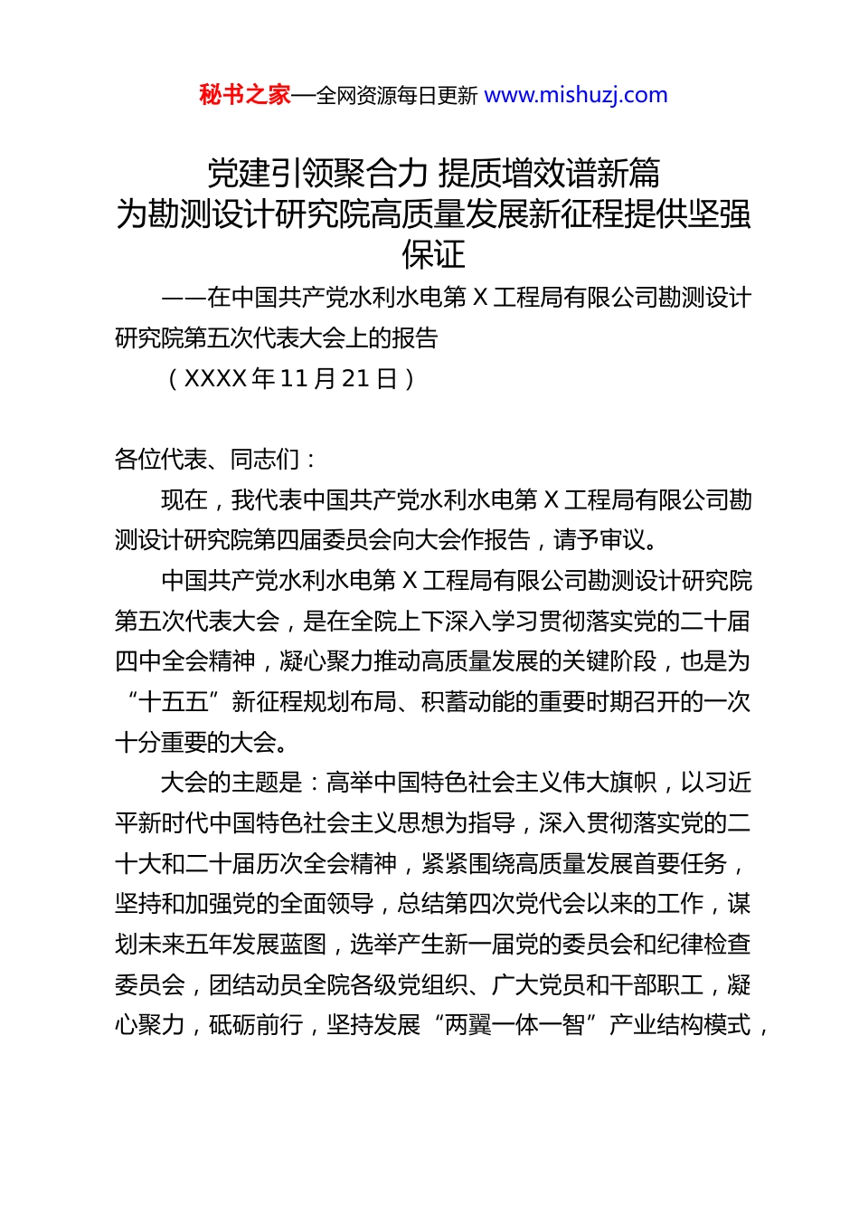 秘书之家—全网资源每日更新 www.mishuzj.com党建引领聚合力 提质增效谱新篇为勘测设计研究院高质量发展新征程提供坚强保证——在中国共产党水利水电第 X 工程局有限公司勘测设计研究院第五次代表大会上的报告(XXXX 年 11 月 21 日)各位代表、同志们:现在,我代表中国共产党水利水电第 X 工程局有限公司勘测设计研究院第四届委员会向大会作报告,请予审议。中国共产党水利水电第 X 工程局有限公司勘测设计研究院第五次代表大会,是在全院上下深入学习贯彻落实党的二十届四中全会精神,凝心聚力推动高质量发展的关键阶段,也是为“十五五”新征程规划布局、积蓄动能的重要时期召开的一次十分重要的大会。大会的主题是:高举中国特色社会主义伟大旗帜,以习近平新时代中国特色社会主义思想为指导,深入贯彻落实党的二十大和二十届历次全会精神,紧紧围绕高质量发展首要任务,坚持和加强党的全面领导,总结第四次党代会以来的工作,谋划未来五年发展蓝图,选举产生新一届党的委员会和纪律检查委员会,团结动员全院各级党组织、广大党员和干部职工,凝心聚力,砥砺前行,坚持发展“两翼一体一智”产业结构模式,秘书之家—全网资源每日更新 www.mishuzj.com聚团结之力、行务实之举,做实“一利五率”,全力以赴确保“十四五”任务目标高质量完成,为实现“十五五”良好开局打牢基础,为加快实现公司“高质量发展,创四个一流”战略目标作出新的更大贡献。一、第四次党代会以来的工作回顾与总结自第四次党代会以来,院党委在集团公司党委和公司党委的坚强领导下,团结带领全体党员干部职工,积极应对复杂严峻的外部环境变化和艰巨繁重的改革发展任务,攻坚克难,锐意进取,党的建设和各项事业发展取得了显著成就,为我院持续健康发展奠定了坚实基础。(一)坚持政治铸魂,坚定自觉践行“两个维护”五年来,我们始终把党的政治建设摆在首位,教育引导全院党员干部深刻领悟“两个确立”的决定性意义,增强“四个意识”、坚定“四个自信”、做到“两个维护”,自觉在思想上政治上行动上同以习近平同志为核心的党中央保持高度一致。强化理论武装,筑牢思想根基。坚持将学习贯彻习近平新时代中国特色社会主义思想作为首要政治任务,建立健全“第一议题”制度,通过党委理论学习中心组学习、专题研讨、辅导报告、在线学习等多种形式,推动党的创新理论入脑入心。扎实开展“不忘初心、牢记使命”主题教育、党史学习教育、学习贯彻习近平新时代中国特色社会主义思想主题教育等,引导广大党员干部从党的百年奋斗历程中汲取智慧和力量,理想秘书之家—全网资源每日更新 www.mishuzj.com信念更加坚定,党性修养持续提升。严守政治纪律,确保政令畅通。坚决贯彻落实党中央各项决策部署,以及上级党委的工作要求,确保执行不偏向、不变通、不走样。严格执行重大事项请示报告制度,不断提高各级领导干部的政治判断力、政治领悟力、政治执行力。加强意识形态阵地建设和管理,牢牢掌握意识形态工作领导权。服务“国之大者”,彰显国企担当。自觉将我院发展融入国家发展大局,主动服务国家重大战略,在重大水利水电工程、水资源配置、水生态保护与治理、国家水网建设等领域勇挑重担,贡献智慧和力量。积极履行社会责任,在抢险救灾、技术帮扶、乡村振兴等方面展现了央企的使命担当。(二)聚焦主责主业,深化改革增强发展动能五年来,我们始终坚持发展是第一要务,完整、准确、全面贯彻新发展理念,着力推动质量变革、效率变革、动力变革,发展质量和效益稳步提升。市场开拓成效显著。面对激烈的市场竞争,我们坚持“巩固传统市场、拓展新兴领域、优化业务结构”的策略,深耕水利水电核心业务,大力拓展市政、环境、新能源、智慧水利等新兴业务,市场布局不断优化,合同额、营业收入等关键指标稳步增长,发展基础更加牢固。深化改革纵深推进。按照上级部署,积极稳妥推进各项改革任务。优化内部组织结构,完善市场化经营机制,深化三项秘书之家—全网资源每日更新 www.mishuzj.com制度改革,激发企业内部活力。加强合规管理体系建设,风险防控能力不断增强。项目管理提质增效。全面推...