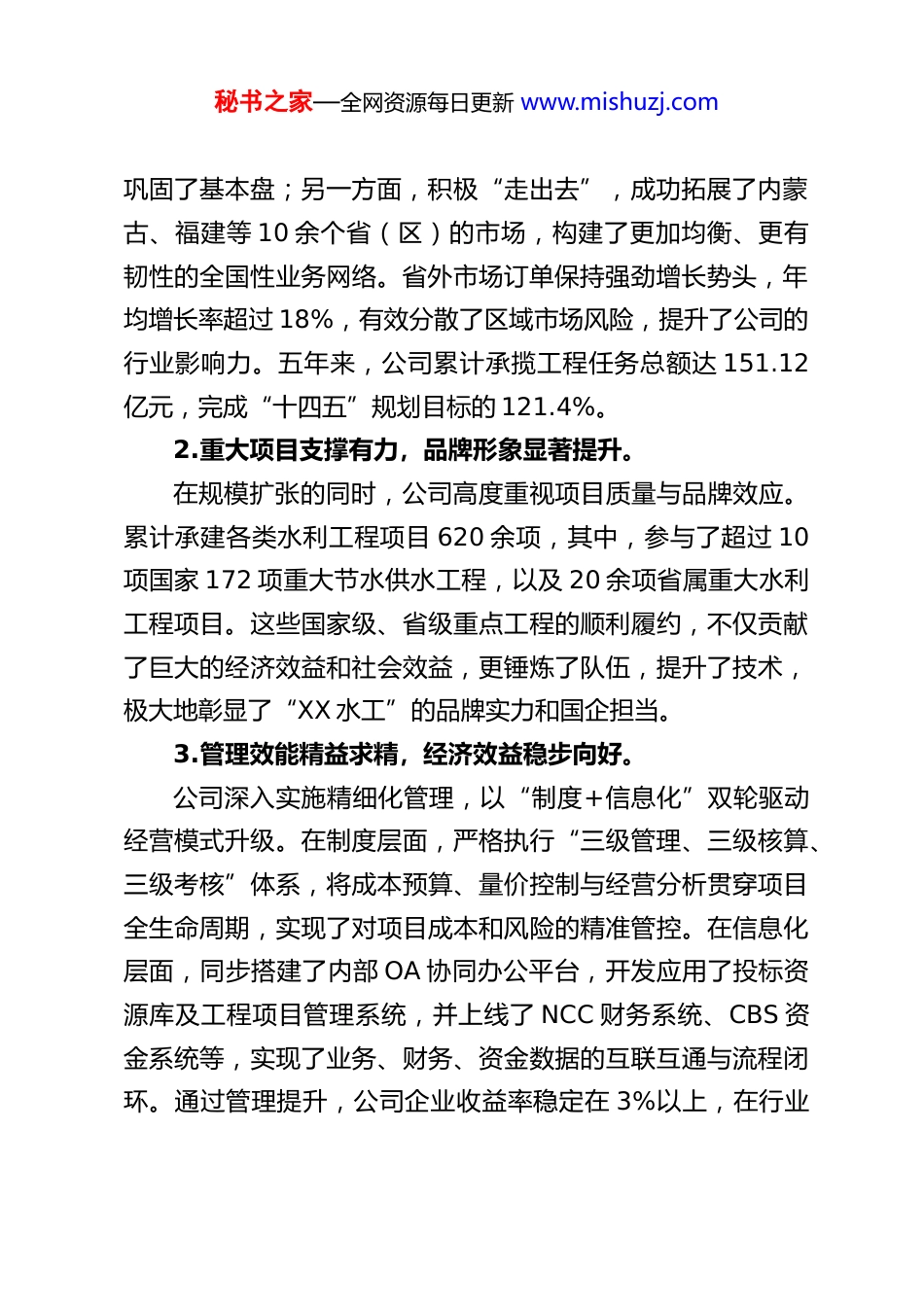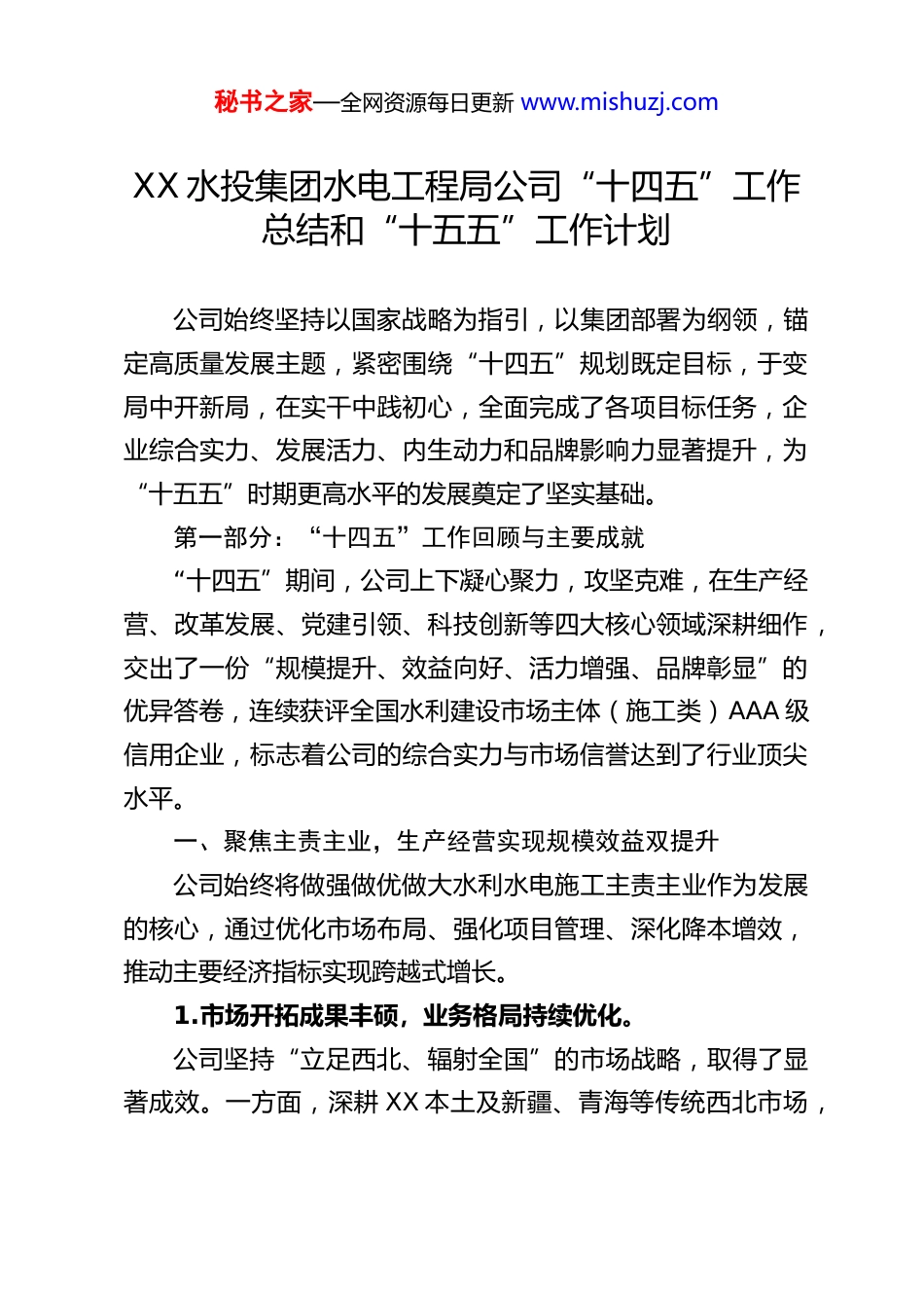 秘书之家—全网资源每日更新 www.mishuzj.comXX 水投集团水电工程局公司“十四五”工作总结和“十五五”工作计划公司始终坚持以国家战略为指引,以集团部署为纲领,锚定高质量发展主题,紧密围绕“十四五”规划既定目标,于变局中开新局,在实干中践初心,全面完成了各项目标任务,企业综合实力、发展活力、内生动力和品牌影响力显著提升,为“十五五”时期更高水平的发展奠定了坚实基础。第一部分:“十四五”工作回顾与主要成就“十四五”期间,公司上下凝心聚力,攻坚克难,在生产经营、改革发展、党建引领、科技创新等四大核心领域深耕细作,交出了一份“规模提升、效益向好、活力增强、品牌彰显”的优异答卷,连续获评全国水利建设市场主体(施工类)AAA 级信用企业,标志着公司的综合实力与市场信誉达到了行业顶尖水平。一、聚焦主责主业,生产经营实现规模效益双提升公司始终将做强做优做大水利水电施工主责主业作为发展的核心,通过优化市场布局、强化项目管理、深化降本增效,推动主要经济指标实现跨越式增长。1.市场开拓成果丰硕,业务格局持续优化。公司坚持“立足西北、辐射全国”的市场战略,取得了显著成效。一方面,深耕 XX 本土及新疆、青海等传统西北市场,秘书之家—全网资源每日更新 www.mishuzj.com巩固了基本盘;另一方面,积极“走出去”,成功拓展了内蒙古、福建等 10 余个省(区)的市场,构建了更加均衡、更有韧性的全国性业务网络。省外市场订单保持强劲增长势头,年均增长率超过 18%,有效分散了区域市场风险,提升了公司的行业影响力。五年来,公司累计承揽工程任务总额达 151.12亿元,完成“十四五”规划目标的 121.4%。2.重大项目支撑有力,品牌形象显著提升。在规模扩张的同时,公司高度重视项目质量与品牌效应。累计承建各类水利工程项目 620 余项,其中,参与了超过 10项国家 172 项重大节水供水工程,以及 20 余项省属重大水利工程项目。这些国家级、省级重点工程的顺利履约,不仅贡献了巨大的经济效益和社会效益,更锤炼了队伍,提升了技术,极大地彰显了“XX 水工”的品牌实力和国企担当。3.管理效能精益求精,经济效益稳步向好。公司深入实施精细化管理,以“制度+信息化”双轮驱动经营模式升级。在制度层面,严格执行“三级管理、三级核算、三级考核”体系,将成本预算、量价控制与经营分析贯穿项目全生命周期,实现了对项目成本和风险的精准管控。在信息化层面,同步搭建了内部 OA 协同办公平台,开发应用了投标资源库及工程项目管理系统,并上线了 NCC 财务系统、CBS 资金系统等,实现了业务、财务、资金数据的互联互通与流程闭环。通过管理提升,公司企业收益率稳定在 3%以上,在行业秘书之家—全网资源每日更新 www.mishuzj.com竞争激烈的背景下保持了健康的盈利水平。五年来,累计实现营业收入 134.54 亿元,完成计划的 114.7%;利润总额年均增速高达 40.7%,超额完成计划目标的 128.3%;全员劳动生产率人均提高 11.97 万元,体现了高质量发展的高效率特征。二、深化改革创新,企业发展内生动力持续激活公司以国企改革三年行动及深化提升行动为契机,勇于破除体制机制障碍,在资质升级、业务结构调整、公司治理和激励机制等方面取得了一系列突破性进展。1.资质体系实现历史性跨越,业务结构更加多元。“十四五”期间,公司资质建设取得里程碑式成果,成功荣膺水利水电工程施工总承包特级资质,这是国内水利施工领域的最高资质,是公司核心竞争力的最硬核证明。同时,市政公用工程、机电工程施工总承包资质成功晋升为一级,并新增了电力工程总承包二级等 14 项资质,测绘资质也升至甲级。依托强大的综合资质优势,公司积极拓展电力、市政等非水利业务板块,五年来非水利类订单占总承揽任务比重已达到 25%,有效增强了抵御行业周期性波动的能力,培育了新的经济增长点。2.现代企业制度更加完善,治理效能显著提升。公司动态修订了“三会一层”议事规则,厘清了各治理主体的权责边界。全面落实了“党建入章”,实现了党委书记、董事长“一肩挑”,确保了党组织在法人治理结构中的法定地秘书之家—全...