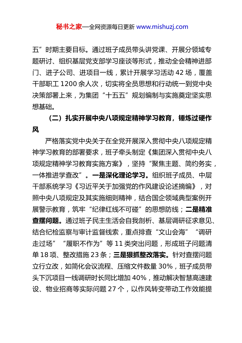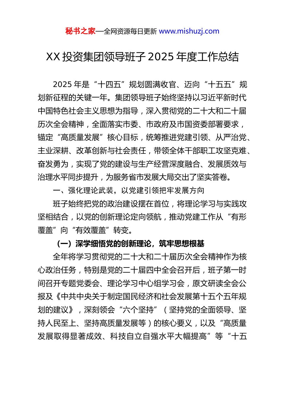 秘书之家—全网资源每日更新 www.mishuzj.comXX 投资集团领导班子 2025 年度工作总结2025 年是“十四五”规划圆满收官、迈向“十五五”规划新征程的关键一年。集团领导班子始终坚持以习近平新时代中国特色社会主义思想为指导,深入贯彻党的二十大和二十届历次全会精神,全面落实市委、市政府及市国资委部署要求,锚定“高质量发展”核心目标,统筹推进党建引领、从严治党、主业深耕、改革创新与社会责任,带领全体干部职工攻坚克难、奋发勇为,实现了党的建设与生产经营深度融合、发展质效与治理水平同步提升,为服务省市发展大局交出了坚实答卷。一、强化理论武装,以党建引领把牢发展方向班子始终把党的政治建设摆在首位,将理论学习与实践攻坚相结合,以党的创新理论定向领航,推动党建工作从“有形覆盖”向“有效覆盖”转变。(一)深学细悟党的创新理论,筑牢思想根基全年将学习贯彻党的二十大和二十届历次全会精神作为核心政治任务,特别是党的二十届四中全会召开后,班子第一时间召开专题党委会、理论学习中心组学习会,原文研读全会公报及《中共中央关于制定国民经济和社会发展第十五个五年规划的建议》,深刻领会“六个坚持”(坚持党的全面领导、坚持人民至上、坚持高质量发展等)的核心要义,以及“高质量发展取得显著成效、科技自立自强水平大幅提高”等“十五秘书之家—全网资源每日更新 www.mishuzj.com五”时期主要目标。通过班子成员带头讲党课、开展分领域专题研讨、组织基层党支部学习座谈等形式,推动全会精神进部门、进子公司、进项目一线,累计开展学习活动 42 场,覆盖干部职工 1200 余人次,切实将全员思想和行动统一到党中央决策部署上来,为集团“十五五”规划编制与实施奠定坚实思想基础。(二)扎实开展中央八项规定精神学习教育,锤炼过硬作风严格落实党中央关于在全党开展深入贯彻中央八项规定精神学习教育的部署要求,班子牵头制定《集团深入贯彻中央八项规定精神学习教育实施方案》,坚持“聚焦主题、简约务实,一体推进学查改”。一是深化理论学习。组织班子成员、中层干部系统学习《习近平关于加强党的作风建设论述摘编》,对照中央八项规定及其实施细则精神,结合国企领域典型案例开展警示教育,筑牢“纪律红线不可碰”的思想防线;二是精准查摆问题。通过班子民主生活会自我剖析、基层调研征求意见、结合纪检监察与审计监督线索,重点排查“文山会海”“调研走过场”“履职不作为”等 11 类突出问题,形成班子问题清单 18 项、整改措施 23 条;三是狠抓整改落实。针对查摆问题立行立改,如简化会议流程、压缩文件数量 30%,班子成员带头下沉项目一线调研时长同比增加 40%,推动解决智慧高速建设、物业招商等实际问题 27 个,以作风转变带动工作效能提秘书之家—全网资源每日更新 www.mishuzj.com升。(三)深化党建与经营融合,激活发展动能班子坚持“党建引领业务、业务检验党建”,做优“548先锋潮”党建品牌,在窗口单位建设“强国志愿者服务站”6个,组建党员突击队、党员示范岗 21 个,重点攻坚黑石铺大桥维修、坪塘收费站智能改造等重大项目。同时,加强干部人才队伍建设,落实意识形态和统战工作责任制,构建“大党建”工作格局——将党建考核纳入子公司经营业绩评价体系,权重提升至 30%,推动基层党支部在智慧高速 AI 预警平台研发、酒店服务品质升级等工作中发挥“战斗堡垒”作用,实现党建与生产经营同频共振。二、深化从严治党,以清风正气涵养政治生态班子始终坚持严的主基调不动摇,对标党的二十届四中全会“完善党和国家监督体系,一体推进不敢腐、不能腐、不想腐”的要求,扎实推进党风廉政建设,为集团发展营造风清气正的政治生态。(一)压实管党治党责任,健全监督体系班子切实履行全面从严治党主体责任,党委书记履行“第一责任人”职责,班子成员落实“一岗双责”,全年召开党委会专题研究党风廉政建设工作 6 次,制定《集团纪检监察工作“三化”建设实施方案》(标准化、规范化、专业化),推动纪检监督与审计监督、财会监督协同联动。针对国企领域突出秘书之家—全网资源每日更新 www.mis...
