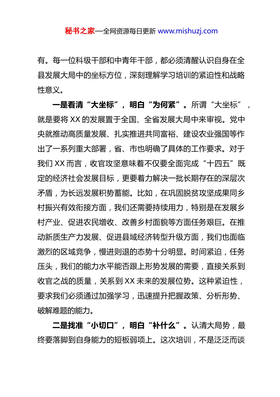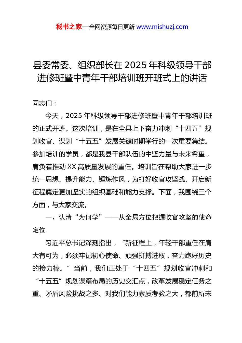 秘书之家—全网资源每日更新 www.mishuzj.com县委常委、组织部长在 2025 年科级领导干部进修班暨中青年干部培训班开班式上的讲话同志们:今天,2025 年科级领导干部进修班暨中青年干部培训班的正式开班。这次培训,是在全县上下奋力冲刺“十四五”规划收官、谋划“十五五”发展关键时期举行的一次重要集结。参加培训的学员,都是我县干部队伍的中坚力量与未来希望,肩负着推动 XX 高质量发展的重任。培训旨在帮助大家进一步统一思想、提升能力、锤炼作风,为打好收官攻坚战、开启新征程奠定更加坚实的组织基础和能力支撑。下面,我围绕三个方面,与大家交流。一、认清“为何学”——从全局方位把握收官攻坚的使命定位习近平总书记深刻指出,“新征程上,年轻干部重任在肩大有可为,必须牢记初心使命、顽强拼搏进取,奋力跑好历史的接力棒。”当前,我们正处于“十四五”规划收官冲刺和“十五五”规划谋篇布局的历史交汇点,改革发展稳定任务之重、矛盾风险挑战之多、对我们能力素质考验之大,都前所未秘书之家—全网资源每日更新 www.mishuzj.com有。每一位科级干部和中青年干部,都必须清醒认识自身在全县发展大局中的坐标方位,深刻理解学习培训的紧迫性和战略性意义。一是看清“大坐标”,明白“为何紧”。所谓“大坐标”,就是要将 XX 的发展置于全国、全省发展大局中来审视。党中央就推动高质量发展、扎实推进共同富裕、建设农业强国等作出了一系列重大部署,省、市也明确了具体的工作要求。对于我们 XX 而言,收官攻坚意味着不仅要全面完成“十四五”既定的经济社会发展目标,更要着力解决一批长期存在的深层次矛盾,为长远发展积势蓄能。比如,在巩固脱贫攻坚成果同乡村振兴有效衔接方面,我们还需要持续用力,特别是在发展乡村产业、促进农民增收、改善乡村面貌等方面任务艰巨。在推动新质生产力发展、促进县域经济转型升级方面,我们也面临激烈的区域竞争,慢进则退的态势十分明显。时间紧迫,任务压头,我们的能力水平能否跟上形势发展的需要,直接关系到收官之战的质量,关系到 XX 未来的发展位势。这种紧迫性,要求我们必须通过加强学习,迅速提升把握政策、分析形势、破解难题的能力。二是找准“小切口”,明白“补什么”。认清大局势,最终要落脚到自身能力的短板弱项上。这次培训,不是泛泛而谈秘书之家—全网资源每日更新 www.mishuzj.com的理论学习,而是有着强烈问题导向和实践指向的能力淬炼。大家要结合自身岗位职责和承担的具体任务,认真反思在知识结构、能力素质、工作方法上存在哪些“缺口”。比如,有的同志可能对宏观经济形势和产业政策理解不深,在谋划项目、争取支持时感到力不从心;有的同志可能对数字化转型、绿色发展等新知识新概念掌握不够,在推动相关工作时有心无力;还有的同志可能做群众工作、化解矛盾纠纷的能力有待提升,在维护基层稳定、凝聚发展合力上办法不多。此次培训课程设置,正是围绕这些实战需求,聚焦党纪学习、发展新质生产力、城乡融合、推动县域经济高质量发展等关键主题,旨在帮助大家弥补知识空白、经验盲区、能力弱项。大家一定要有“缺什么、补什么”的自觉,主动对标,深入查摆,确保学习有的放矢。三是锚定“新任务”,明白“怎么干”。学习的目的是为了更好的实践。收官攻坚阶段,各项工作千头万绪,但决不能“眉毛胡子一把抓”。我们要通过学习,进一步明确当前和今后一个时期的工作着力点。一方面,要聚焦“硬指标”,全力以赴确保“十四五”规划确定的各项经济社会发展目标如期实现,特别是涉及民生改善、生态保护、项目建设等关键任务。另一方面,要谋划“软实力”,围绕“五星”支部创建、党建秘书之家—全网资源每日更新 www.mishuzj.com引领基层治理、优化营商环境、激发干部队伍活力等打基础、利长远的工作,深入思考,提出务实管用的思路举措。作为科级和中青年干部,大家不仅要成为出色的执行者,还要努力成为有创造力的思考者。要像澄迈县所倡导的那样,在推动工作时,坚持把“应不应该办”摆在“可不可以办”之前,做有创造力的执行者,努力“把事办成”。这意味着我们要善于在政策法规框架...