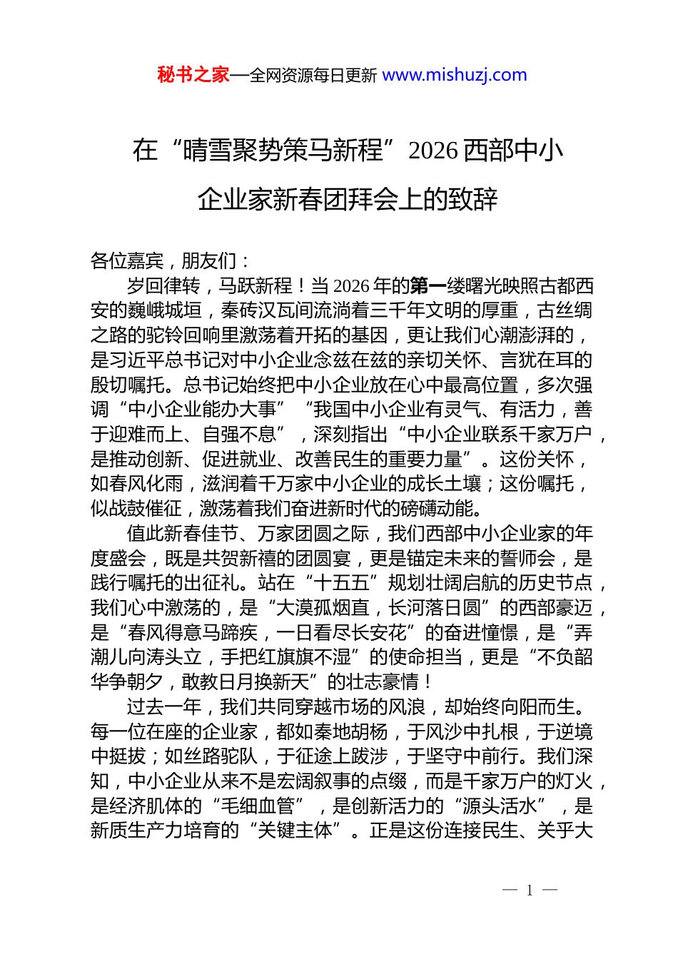 秘书之家—全网资源每日更新 www.mishuzj.com在“晴雪聚势策马新程”2026 西部中小企业家新春团拜会上的致辞各位嘉宾,朋友们:岁回律转,马跃新程!当 2026 年的第一缕曙光映照古都西安的巍峨城垣,秦砖汉瓦间流淌着三千年文明的厚重,古丝绸之路的驼铃回响里激荡着开拓的基因,更让我们心潮澎湃的,是习近平总书记对中小企业念兹在兹的亲切关怀、言犹在耳的殷切嘱托。总书记始终把中小企业放在心中最高位置,多次强调“中小企业能办大事”“我国中小企业有灵气、有活力,善于迎难而上、自强不息”,深刻指出“中小企业联系千家万户,是推动创新、促进就业、改善民生的重要力量”。这份关怀,如春风化雨,滋润着千万家中小企业的成长土壤;这份嘱托,似战鼓催征,激荡着我们奋进新时代的磅礴动能。值此新春佳节、万家团圆之际,我们西部中小企业家的年度盛会,既是共贺新禧的团圆宴,更是锚定未来的誓师会,是践行嘱托的出征礼。站在“十五五”规划壮阔启航的历史节点,我们心中激荡的,是“大漠孤烟直,长河落日圆”的西部豪迈,是“春风得意马蹄疾,一日看尽长安花”的奋进憧憬,是“弄潮儿向涛头立,手把红旗旗不湿”的使命担当,更是“不负韶华争朝夕,敢教日月换新天”的壮志豪情!过去一年,我们共同穿越市场的风浪,却始终向阳而生。每一位在座的企业家,都如秦地胡杨,于风沙中扎根,于逆境中挺拔;如丝路驼队,于征途上跋涉,于坚守中前行。我们深知,中小企业从来不是宏阔叙事的点缀,而是千家万户的灯火,是经济肌体的“毛细血管”,是创新活力的“源头活水”,是新质生产力培育的“关键主体”。正是这份连接民生、关乎大— 1 —秘书之家—全网资源每日更新 www.mishuzj.com局的厚重责任,赋予我们穿越周期的坚韧,也让我们今日的相聚,更显意义非凡。第一,于变局中开新局:做洞察时势的“清醒者”,在历史经纬中锚定航向“十五五”的序幕已然拉开,这不是寻常五年的简单延续,而是新质生产力加速崛起的战略机遇期,是西部中小企业换道超车的黄金窗口期。国家正谋划推进高技术产业标志性重大工程,新能源、工业母机、生物医药、低空经济等新增长点蓄势待发;推动工业经济质效双升、建设现代化产业体系,已成为开局之年的清晰号角。这不是一道可做可不做的“选择题”,而是关乎生存发展的“必答题”;不是一道浅尝辄止的“附加题”,而是决定未来格局的“核心题”。世界格局风起云涌,唯创新者进;时代浪潮浩浩荡荡,唯转型者强;区域竞争百舸争流,唯实干者胜;政策春风拂面而来,唯奋进者兴。我们西部企业,承继着祖先开辟丝路的闯劲、戍边拓土的韧劲,绝不能做“春风不度玉门关”的旁观者,而要做“敢教日月换新天”的弄潮儿;绝不能当“隔岸观火”的局外人,而要做“勇立潮头”的先行者!作为大家最可靠的同行者,中国中小商业企业协会 2026 年的核心使命,就是成为政策落地的“转换器”、企业发展的“导航仪”。我们将紧扣“十五五”规划部署,深研财政部、国家发改委等五部委联合出台的中小微企业贷款贴息政策——对重点领域固定资产贷款给予年化 1.5 个百分点、期限 2 年的贴息支持,单户上限 5000 万元的政策红利,更将解读工业和信息化部优质中小企业梯度培育新规,把宏大叙事转化为“看得见、摸得着、用得上”的实操指南。我们将升级“政策直播间”,开展“科创智库服务年”,让政策红利从“纸上”直达“账上”,从“文件中”走进“生产里”;我们将深化“千企百业大走访”,脚沾泥土、心连企业,建强诉求闭环管理机制,让— 2 —秘书之家—全网资源每日更新 www.mishuzj.com每一个呼声都有回响,每一个建议都有回应,每一个困难都有帮扶。第二,于传统中育新质:做转型升级的“先行者”,在创新沃土中深植根基新质生产力,核心在“新”,是技术之新、模式之新、生态之新;关键在“质”,是品质之质、效率之质、价值之质。总书记强调“要加快培育新质生产力”,这绝非大企业的专属命题,恰恰是中小企业“能办大事”的历史性机遇,是西部企业实现“弯道超车”的核心路径。让“老树发新枝”,在革新中强根基:对于传统行业企业转型不是“另...