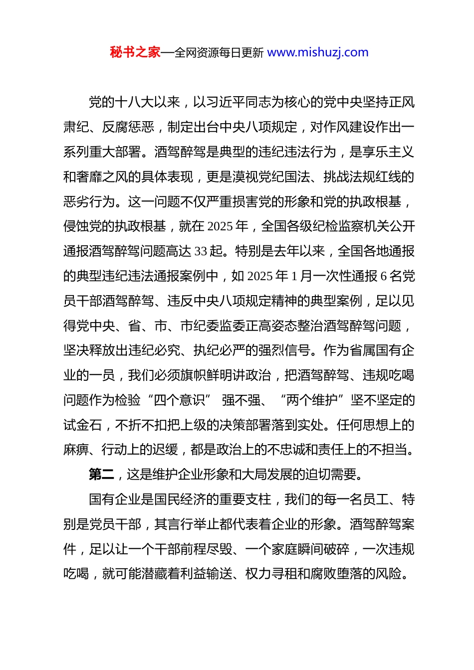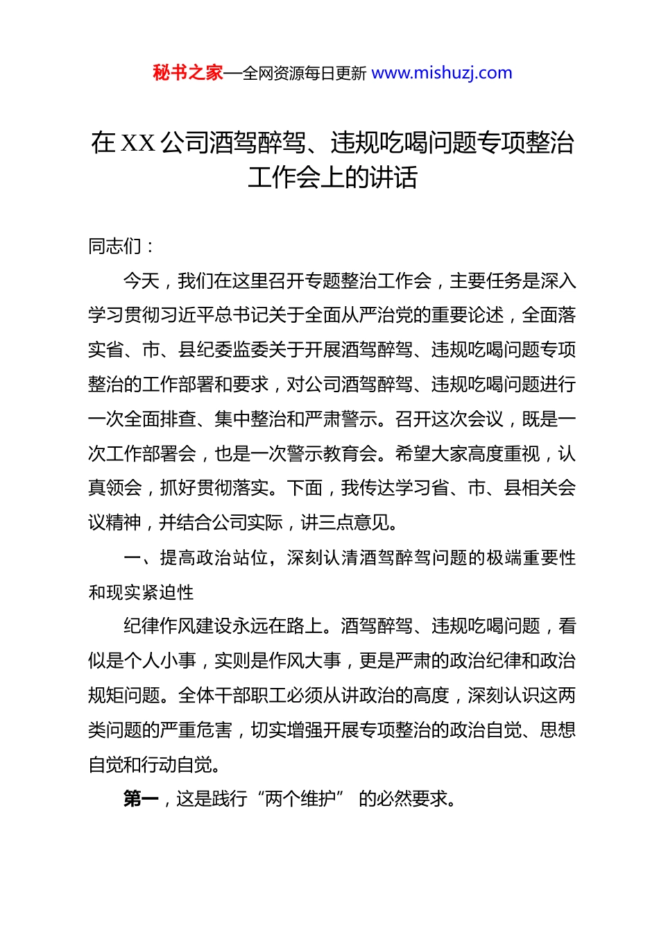 秘书之家—全网资源每日更新 www.mishuzj.com在 XX 公司酒驾醉驾、违规吃喝问题专项整治工作会上的讲话 同志们:今天,我们在这里召开专题整治工作会,主要任务是深入学习贯彻习近平总书记关于全面从严治党的重要论述,全面落实省、市、县纪委监委关于开展酒驾醉驾、违规吃喝问题专项整治的工作部署和要求,对公司酒驾醉驾、违规吃喝问题进行一次全面排查、集中整治和严肃警示。召开这次会议,既是一次工作部署会,也是一次警示教育会。希望大家高度重视,认真领会,抓好贯彻落实。下面,我传达学习省、市、县相关会议精神,并结合公司实际,讲三点意见。一、提高政治站位,深刻认清酒驾醉驾问题的极端重要性和现实紧迫性纪律作风建设永远在路上。酒驾醉驾、违规吃喝问题,看似是个人小事,实则是作风大事,更是严肃的政治纪律和政治规矩问题。全体干部职工必须从讲政治的高度,深刻认识这两类问题的严重危害,切实增强开展专项整治的政治自觉、思想自觉和行动自觉。第一,这是践行“两个维护” 的必然要求。秘书之家—全网资源每日更新 www.mishuzj.com党的十八大以来,以习近平同志为核心的党中央坚持正风肃纪、反腐惩恶,制定出台中央八项规定,对作风建设作出一系列重大部署。酒驾醉驾是典型的违纪违法行为,是享乐主义和奢靡之风的具体表现,更是漠视党纪国法、挑战法规红线的恶劣行为。这一问题不仅严重损害党的形象和党的执政根基,侵蚀党的执政根基,就在 2025 年,全国各级纪检监察机关公开通报酒驾醉驾问题高达 33 起。特别是去年以来,全国各地通报的典型违纪违法通报案例中,如 2025 年 1 月一次性通报 6 名党员干部酒驾醉驾、违反中央八项规定精神的典型案例,足以见得党中央、省、市、市纪委监委正高姿态整治酒驾醉驾问题,坚决释放出违纪必究、执纪必严的强烈信号。作为省属国有企业的一员,我们必须旗帜鲜明讲政治,把酒驾醉驾、违规吃喝问题作为检验“四个意识” 强不强、“两个维护”坚不坚定的试金石,不折不扣把上级的决策部署落到实处。任何思想上的麻痹、行动上的迟缓,都是政治上的不忠诚和责任上的不担当。第二,这是维护企业形象和大局发展的迫切需要。国有企业是国民经济的重要支柱,我们的每一名员工、特别是党员干部,其言行举止都代表着企业的形象。酒驾醉驾案件,足以让一个干部前程尽毁、一个家庭瞬间破碎,一次违规吃喝,就可能潜藏着利益输送、权力寻租和腐败堕落的风险。秘书之家—全网资源每日更新 www.mishuzj.com近年来,全国各地通报的酒驾醉驾案件,触目惊心,有的干部因酒驾醉驾被查,进而牵出背后“四风” 和腐败问题,给企业造成了不可估量的信誉损害和经济损失。我们 XX 商管公司正处在转型升级、高质量发展的关键时期,市场竞争异常激烈,改革发展任务十分繁重。如果我们的干部队伍作风涣散、纪律松弛,甚至出现酒驾醉驾、违规吃喝等严重违纪违法行为,不仅会严重破坏公司风清气正的政治生态和干事创业的良好氛围,更会直接影响公司的核心竞争力和长远发展。我们绝不能因为个别人的违纪违法,让公司干部职工多年奋斗的成果付之东流。第三,这是关心爱护干部职工的实际举措。“严管就是厚爱,监督就是保护”。酒驾醉驾背后,靠的是为了个人利益和享乐的侥幸心理,而不是对生命的敬畏和对法律的无知。酒驾醉驾的背后,是纪律观念的淡薄和侥幸心理的作祟。一些干部“屡教不改”,经常受到党纪政务处分和通报,却依然我行我素。近年来,一些省市纪委监委与公安、组织部门建立协作机制,对党员干部和公职人员酒驾醉驾行为实行“一案双查”,不仅要追究当事人的责任,还要倒查追究相关领导的责任和监督责任。可以说,现在的“高压线” 越织越密,执纪的 “利剑”越磨越利,我们今天把纪律挺在最前面,把纪律和规矩讲清楚、讲透彻,就是要让大家时刻紧绷纪律之弦,秘书之家—全网资源每日更新 www.mishuzj.com远离风险,守住底线,这才是对干部职工最真心、最负责的关心和爱护。我们必须清醒地认识到,尽管公司近年来持续加强作风建设,取得了积极成效,但对照上级的严格要求和当前的高压态势,一些深层次、倾向性、...