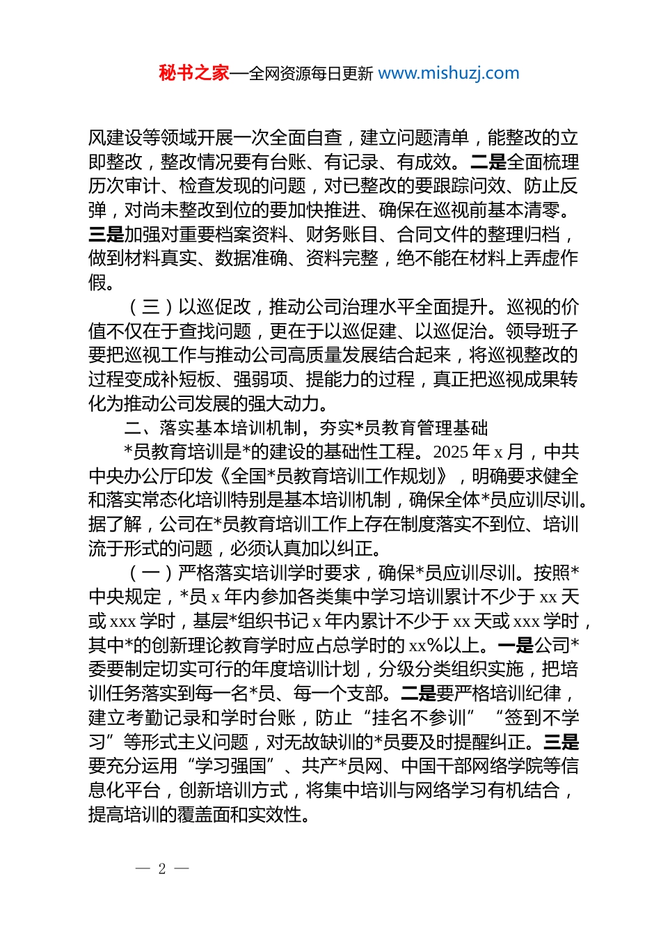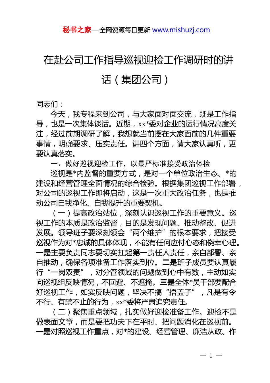 秘书之家—全网资源每日更新 www.mishuzj.com在赴公司工作指导巡视迎检工作调研时的讲话(集团公司)同志们:今天,我专程来到公司,与大家面对面交流,既是工作指导,也是一次集体谈话。近期,xx*委对企业的运行情况高度关注,经过前期调研了解,我想就当前摆在大家面前的几件重要事情,明确要求、压实责任。讲四个方面,请大家认真听,更要认真落实。一、做好巡视迎检工作,以最严标准接受政治体检巡视是*内监督的重要方式,是对一个单位政治生态、*的建设和经营管理全面情况的综合检验。根据集团巡视工作部署,对公司的巡视工作即将启动,这是一次重大政治任务,也是推动公司自我净化、自我提升的重要契机。(一)提高政治站位,深刻认识巡视工作的重要意义。巡视工作的本质是政治监督,目的是发现问题、推动整改、促进发展。领导班子要深刻领会“两个维护”的根本要求,把接受巡视作为对*忠诚的具体体现,不能有任何应付心态和侥幸心理。一是主要负责同志要切实扛起第一责任人责任,亲自部署、亲自推动,确保各项准备工作落实到位。二是班子成员要认真履行“一岗双责”,对分管领域的问题做到心中有数,主动如实向巡视组反映情况,不回避、不遮掩。三是全体*员干部要配合好巡视工作,如实反映问题,坚决不搞“捂盖子”,凡是有令不行、有禁不止的行为,xx*委将严肃追究责任。(二)聚焦重点领域,扎实做好迎检准备工作。迎检不是做表面文章,而是要把功夫下在平时、把问题消化在巡视前。一是对照巡视工作重点,对*的建设、经营管理、廉洁从政、作— 1 —秘书之家—全网资源每日更新 www.mishuzj.com风建设等领域开展一次全面自查,建立问题清单,能整改的立即整改,整改情况要有台账、有记录、有成效。二是全面梳理历次审计、检查发现的问题,对已整改的要跟踪问效、防止反弹,对尚未整改到位的要加快推进、确保在巡视前基本清零。三是加强对重要档案资料、财务账目、合同文件的整理归档,做到材料真实、数据准确、资料完整,绝不能在材料上弄虚作假。(三)以巡促改,推动公司治理水平全面提升。巡视的价值不仅在于查找问题,更在于以巡促建、以巡促治。领导班子要把巡视工作与推动公司高质量发展结合起来,将巡视整改的过程变成补短板、强弱项、提能力的过程,真正把巡视成果转化为推动公司发展的强大动力。二、落实基本培训机制,夯实*员教育管理基础*员教育培训是*的建设的基础性工程。2025 年 x 月,中共中央办公厅印发《全国*员教育培训工作规划》,明确要求健全和落实常态化培训特别是基本培训机制,确保全体*员应训尽训。据了解,公司在*员教育培训工作上存在制度落实不到位、培训流于形式的问题,必须认真加以纠正。(一)严格落实培训学时要求,确保*员应训尽训。按照*中央规定,*员 x 年内参加各类集中学习培训累计不少于 xx 天或 xxx 学时,基层*组织书记 x 年内累计不少于 xx 天或 xxx 学时,其中*的创新理论教育学时应占总学时的 xx%以上。一是公司*委要制定切实可行的年度培训计划,分级分类组织实施,把培训任务落实到每一名*员、每一个支部。二是要严格培训纪律,建立考勤记录和学时台账,防止“挂名不参训”“签到不学习”等形式主义问题,对无故缺训的*员要及时提醒纠正。三是要充分运用“学习强国”、共产*员网、中国干部网络学院等信息化平台,创新培训方式,将集中培训与网络学习有机结合,提高培训的覆盖面和实效性。— 2 —秘书之家—全网资源每日更新 www.mishuzj.com(二)规范“三会一课”和主题*日制度,提升*内组织生活质量。*内组织生活是*员受教育、受锻炼的重要平台。一是严格落实“三会一课”制度,支部委员会每月至少召开一次,*小组会每月至少召开一次,*员大会每季度至少召开一次,*课每半年至少讲一次,坚决杜绝以工作会议代替支部会议的做法。二是高质量开展主题*日活动,每次活动要有主题、有内容、有记录,避免走过场、搞形式。三是认真开展民主生活会和组织生活会,坚持批评与自我批评,真正把问题摆出来、把根源找出来、把整改措施定出来,切实增强*内组织生活的政治性、原则性、战斗性。(三)发挥*员先锋...