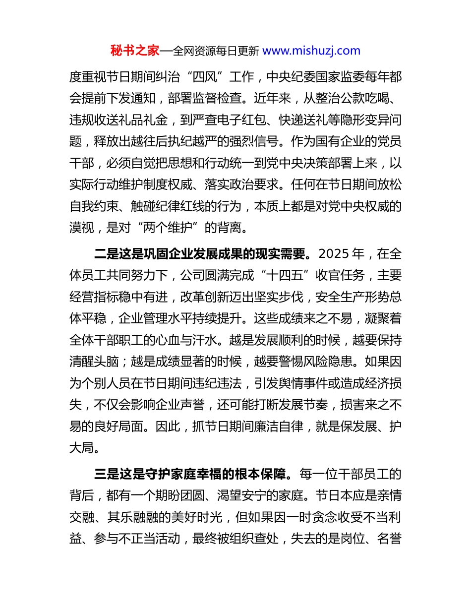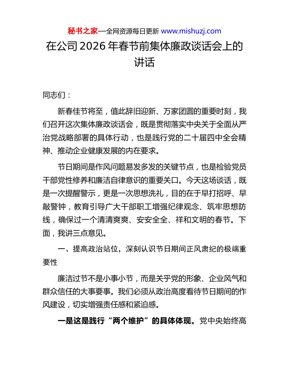 秘书之家—全网资源每日更新 www.mishuzj.com在公司 2026 年春节前集体廉政谈话会上的讲话同志们:新春佳节将至,值此辞旧迎新、万家团圆的重要时刻,我们召开这次集体廉政谈话会,既是贯彻落实中央关于全面从严治党战略部署的具体行动,也是践行党的二十届四中全会精神、推动企业健康发展的内在要求。节日期间是作风问题易发多发的关键节点,也是检验党员干部党性修养和廉洁自律意识的重要关口。今天这场谈话,既是一次提醒警示,更是一次思想洗礼,目的在于早打招呼、早敲警钟,教育引导广大干部职工增强纪律观念、筑牢思想防线,确保过一个清清爽爽、安安全全、祥和文明的春节。下面,我讲三点意见。一、提高政治站位,深刻认识节日期间正风肃纪的极端重要性廉洁过节不是小事小节,而是关乎党的形象、企业风气和群众信任的大事要事。我们必须从政治高度看待节日期间的作风建设,切实增强责任感和紧迫感。一是这是践行“两个维护”的具体体现。党中央始终高秘书之家—全网资源每日更新 www.mishuzj.com度重视节日期间纠治“四风”工作,中央纪委国家监委每年都会提前下发通知,部署监督检查。近年来,从整治公款吃喝、违规收送礼品礼金,到严查电子红包、快递送礼等隐形变异问题,释放出越往后执纪越严的强烈信号。作为国有企业的党员干部,必须自觉把思想和行动统一到党中央决策部署上来,以实际行动维护制度权威、落实政治要求。任何在节日期间放松自我约束、触碰纪律红线的行为,本质上都是对党中央权威的漠视,是对“两个维护”的背离。二是这是巩固企业发展成果的现实需要。2025 年,在全体员工共同努力下,公司圆满完成“十四五”收官任务,主要经营指标稳中有进,改革创新迈出坚实步伐,安全生产形势总体平稳,企业管理水平持续提升。这些成绩来之不易,凝聚着全体干部职工的心血与汗水。越是发展顺利的时候,越要保持清醒头脑;越是成绩显著的时候,越要警惕风险隐患。如果因为个别人员在节日期间违纪违法,引发舆情事件或造成经济损失,不仅会影响企业声誉,还可能打断发展节奏,损害来之不易的良好局面。因此,抓节日期间廉洁自律,就是保发展、护大局。三是这是守护家庭幸福的根本保障。每一位干部员工的背后,都有一个期盼团圆、渴望安宁的家庭。节日本应是亲情交融、其乐融融的美好时光,但如果因一时贪念收受不当利益、参与不正当活动,最终被组织查处,失去的是岗位、名誉秘书之家—全网资源每日更新 www.mishuzj.com乃至自由,伤害的是父母妻儿的信任与尊严。许多违纪案例表明,一些人正是在逢年过节时放松警惕,从小节失守开始,一步步滑向违纪违法的深渊。我们要算好政治账、经济账、名誉账、家庭账、自由账,真正明白“清廉是福、贪欲是祸”的道理,珍惜岗位、珍爱家庭、珍重人生。二、坚持问题导向,坚决防范各类廉洁风险和作风顽疾当前,随着正风肃纪力度不断加大,明目张胆的违规行为大幅减少,但“四风”问题呈现出隐蔽化、多样化、复杂化的新特征。我们必须精准识别、靶向施治,防止老问题复燃、新问题萌发、小问题坐大。(一)警惕“人情往来”背后的权钱交易。春节期间走亲访友、礼尚往来本是传统习俗,但一旦与职权挂钩,就极易异化为利益输送的幌子。要特别注意以下几种情形:有的管理对象借拜年名义赠送购物卡、预付卡、高档烟酒茶等财物,美其名曰“一点心意”;有的通过微信转账、支付宝发红包等方式,发送带有特定数字寓意的金额;还有的以“代购年货”“帮忙订票”等名义变相索要好处。这些行为看似隐蔽,实则本质未变,都是利用节日氛围进行的利益交换。我们必须明确:凡是可能影响公正执行公务的礼品礼金,一律不得接受;凡是以任何形式收受的电子红包,都属于违纪行为。(二)严防“舌尖上的腐败”反弹回潮。尽管公款吃喝得秘书之家—全网资源每日更新 www.mishuzj.com到有效遏制,但仍有个别单位和个人心存侥幸。要重点防范三种现象:一是在内部食堂、培训中心等场所搞隐蔽聚餐,规避监督;二是将个人消费转嫁到下属单位或业务关联方报销;三是接受管理服务对象安排的宴请,尤其是带有拉关系、谋项目目的的“饭局”。需要重申:无论...