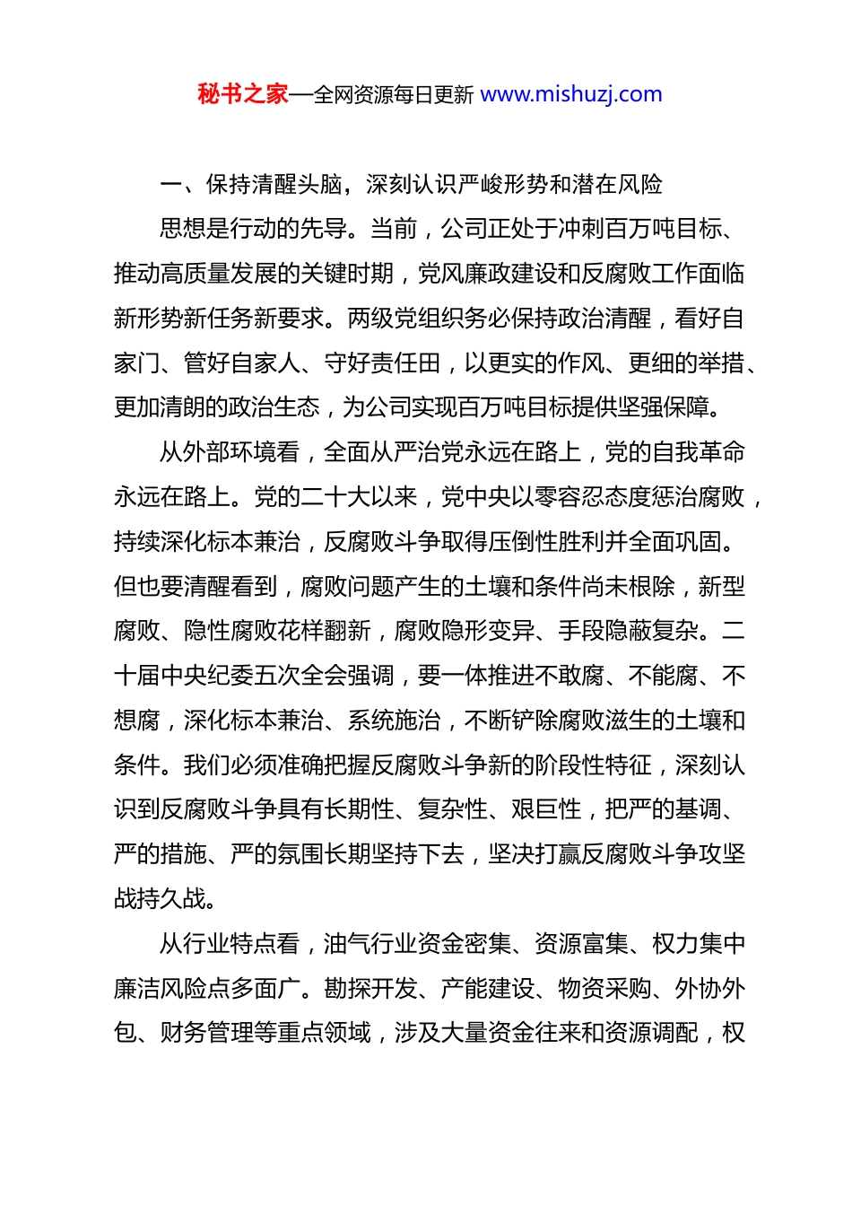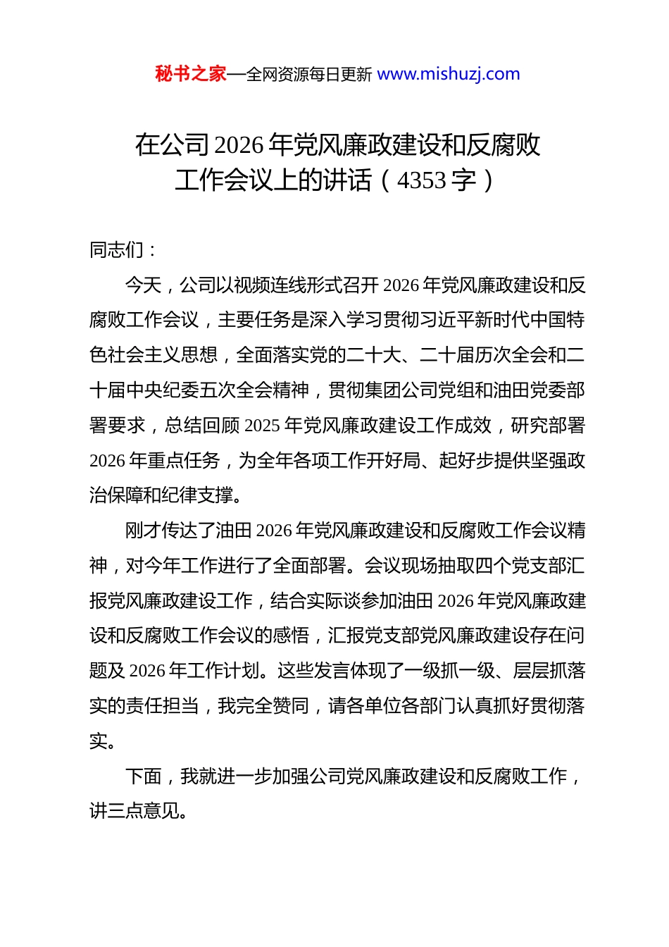 秘书之家—全网资源每日更新 www.mishuzj.com在公司 2026 年党风廉政建设和反腐败工作会议上的讲话(4353 字)同志们:今天,公司以视频连线形式召开 2026 年党风廉政建设和反腐败工作会议,主要任务是深入学习贯彻习近平新时代中国特色社会主义思想,全面落实党的二十大、二十届历次全会和二十届中央纪委五次全会精神,贯彻集团公司党组和油田党委部署要求,总结回顾 2025 年党风廉政建设工作成效,研究部署2026 年重点任务,为全年各项工作开好局、起好步提供坚强政治保障和纪律支撑。刚才传达了油田 2026 年党风廉政建设和反腐败工作会议精神,对今年工作进行了全面部署。会议现场抽取四个党支部汇报党风廉政建设工作,结合实际谈参加油田 2026 年党风廉政建设和反腐败工作会议的感悟,汇报党支部党风廉政建设存在问题及 2026 年工作计划。这些发言体现了一级抓一级、层层抓落实的责任担当,我完全赞同,请各单位各部门认真抓好贯彻落实。下面,我就进一步加强公司党风廉政建设和反腐败工作,讲三点意见。秘书之家—全网资源每日更新 www.mishuzj.com一、保持清醒头脑,深刻认识严峻形势和潜在风险思想是行动的先导。当前,公司正处于冲刺百万吨目标、推动高质量发展的关键时期,党风廉政建设和反腐败工作面临新形势新任务新要求。两级党组织务必保持政治清醒,看好自家门、管好自家人、守好责任田,以更实的作风、更细的举措、更加清朗的政治生态,为公司实现百万吨目标提供坚强保障。从外部环境看,全面从严治党永远在路上,党的自我革命永远在路上。党的二十大以来,党中央以零容忍态度惩治腐败,持续深化标本兼治,反腐败斗争取得压倒性胜利并全面巩固。但也要清醒看到,腐败问题产生的土壤和条件尚未根除,新型腐败、隐性腐败花样翻新,腐败隐形变异、手段隐蔽复杂。二十届中央纪委五次全会强调,要一体推进不敢腐、不能腐、不想腐,深化标本兼治、系统施治,不断铲除腐败滋生的土壤和条件。我们必须准确把握反腐败斗争新的阶段性特征,深刻认识到反腐败斗争具有长期性、复杂性、艰巨性,把严的基调、严的措施、严的氛围长期坚持下去,坚决打赢反腐败斗争攻坚战持久战。从行业特点看,油气行业资金密集、资源富集、权力集中廉洁风险点多面广。勘探开发、产能建设、物资采购、外协外包、财务管理等重点领域,涉及大量资金往来和资源调配,权秘书之家—全网资源每日更新 www.mishuzj.com力运行空间大、自由裁量权广,稍有不慎就可能出现权力寻租、利益输送、设租寻租等问题。近年来,系统内个别单位发生的违规违纪案件,教训深刻、警示深刻。有的在工程招投标中违规操作,为特定关系人谋取利益;有的在物资采购中收受回扣、吃拿卡要;有的在干部选拔任用中任人唯亲、搞小圈子;有的在资金管理上截留挪用、虚报冒领。这些问题的发生,暴露出制度建设存在漏洞、监督管理存在盲区、廉洁意识存在偏差。我们必须举一反三、警钟长鸣,时刻绷紧廉洁自律这根弦,把廉洁风险防控融入生产经营各环节全过程。从公司实际看,2025 年公司党风廉政建设工作取得明显成效。我们深入贯彻落实油田“63371”总体发展思路,紧紧围绕公司“16536”发展思路,持续推进清廉**建设,政治监督持续深化,作风建设成效显著,纪律约束不断强化,廉洁文化深入人心,为公司高质量发展营造了良好政治生态。但也要清醒认识到,工作中还存在一些薄弱环节和突出问题。个别党组织主体责任落实不够到位,“一岗双责”意识有待增强,存在重业务轻党建、重生产轻廉政的现象;部分党员干部纪律规矩意识不够牢固,作风建设还需持续发力,形式主义、官僚主义问题仍不同程度存在;重点领域和关键环节的监督机制还不够完善,廉洁风险防控存在盲区死角,制度执行还不够严格;基层监督秘书之家—全网资源每日更新 www.mishuzj.com力量相对薄弱,纪检监督干部专业化能力有待提升。这些问题的存在,说明我们的工作还有差距,必须高度重视、切实解决。两级党组织要深刻认识党风廉政建设和反腐败工作的重大意义,把全面从严治党作为长期战略、永恒课题,以高度的政治自觉、思想自觉、行动自觉,把全面从严治...