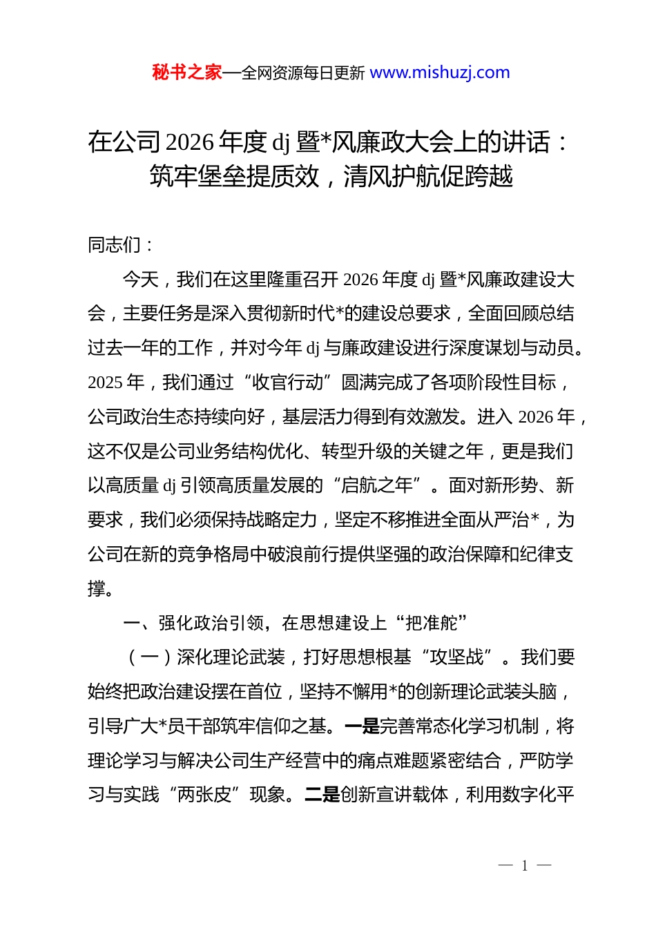 秘书之家—全网资源每日更新 www.mishuzj.com在公司 2026 年度 dj 暨*风廉政大会上的讲话:筑牢堡垒提质效,清风护航促跨越同志们:今天,我们在这里隆重召开 2026 年度 dj 暨*风廉政建设大会,主要任务是深入贯彻新时代*的建设总要求,全面回顾总结过去一年的工作,并对今年 dj 与廉政建设进行深度谋划与动员。2025 年,我们通过“收官行动”圆满完成了各项阶段性目标,公司政治生态持续向好,基层活力得到有效激发。进入 2026 年,这不仅是公司业务结构优化、转型升级的关键之年,更是我们以高质量 dj 引领高质量发展的“启航之年”。面对新形势、新要求,我们必须保持战略定力,坚定不移推进全面从严治*,为公司在新的竞争格局中破浪前行提供坚强的政治保障和纪律支撑。一、强化政治引领,在思想建设上“把准舵”(一)深化理论武装,打好思想根基“攻坚战”。我们要始终把政治建设摆在首位,坚持不懈用*的创新理论武装头脑,引导广大*员干部筑牢信仰之基。一是完善常态化学习机制,将理论学习与解决公司生产经营中的痛点难题紧密结合,严防学习与实践“两张皮”现象。二是创新宣讲载体,利用数字化平— 1 —秘书之家—全网资源每日更新 www.mishuzj.com台开展微*课,确保*的最新精神能够第一时间穿透到基层一线。通过深入开展理论轮训,我们要让*员干部在复杂多变的形势中保持清醒,确保企业发展始终沿着正确航向稳步前行。(二)提高政治站位,练就政治执行“基本功”。我们要不断提高政治判断力、政治领悟力、政治执行力,确保上级决策部署在公司落地生根。一是强化政治监督,建立健全闭环落实机制,对重大项目推进、关键任务落实情况进行全流程跟踪问效。二是严肃*内政治生活,高质量开好民主生活会和组织生活会,用好批评和自我批评这一锐利武器。我们要通过持续的政治历练,引导全体员工在大局下思考和行动,真正把政治优势转化为企业的核心竞争优势。二、夯实基层基础,在组织提质上“扎深根”(一)优化组织布局,构建基层战斗“指挥部”。我们要针对公司业务板块的变化,动态调整*组织设置,确保业务延伸到哪里,*组织就覆盖到哪里。一是推进*支部规范化建设,实施“支部强能”专项工程,选优配强*组织书记,提升基层组织的凝聚力和战斗力。二是深化 dj 与业务深度融合,探索建立 dj责任与经营指标联动考核体系,让*组织在经营管理中发挥实质作用。我们要通过理顺管理脉络,让每一个*支部都成为攻坚克难的坚强战斗堡垒,推动生产经营任务高效达成。— 2 —秘书之家—全网资源每日更新 www.mishuzj.com(二)激活*员动能,争做先锋模范“排头兵”。我们要进一步发挥*员的带头作用,通过设立*员责任区、*员突击队,让旗帜在基层一线高高飘扬。一是开展*员先锋指数评价,量化岗位贡献,激发*员带头创先争优的内在动力。二是加强*员日常教育管理,严把*员发展入口关,注重在科研攻关、市场开拓等急难险重岗位上发现和培养入*积极分子。我们要让每一名*员都成为一面流动的旗帜,在技术革新、服务优化中当表率、做示范,带动全体职工形成争创一流的浓厚氛围。三、坚持正风肃纪,在廉洁防控上“亮利剑”(一)严明纪律规矩,织密作风建设“防护网”。我们要持之以恒正风肃纪,深入纠治形式主义、官僚主义,营造风清气正的干事环境。一是开展作风建设常态化监督检查,紧盯重要节点、重点领域,严查隐形变异的违规行为。二是完善纠风长效机制,坚持深入一线开展调研,切实减轻基层负担,把更多精力投入到解决实际问题中去。我们要以踏石留印的劲头抓好作风建设,让“勤快严实精细廉”的作风成为每一位员工的行动自觉,全面提升企业的整体形象和运转效率。(二)强化风险预警,筑牢拒腐防变“防火墙”。我们要把权力关进制度的笼子,完善内控体系,实现廉洁风险的精准防控。一是加强对“关键少数”和重要岗位的监督,建立权力— 3 —秘书之家—全网资源每日更新 www.mishuzj.com清单和负面清单,推行关键流程的公开透明化管理。二是深化廉洁文化建设,通过典型案例警示教育、家风建设系列活动,构建全方位廉洁宣教矩阵。我们要坚持抓早抓小,对苗头...