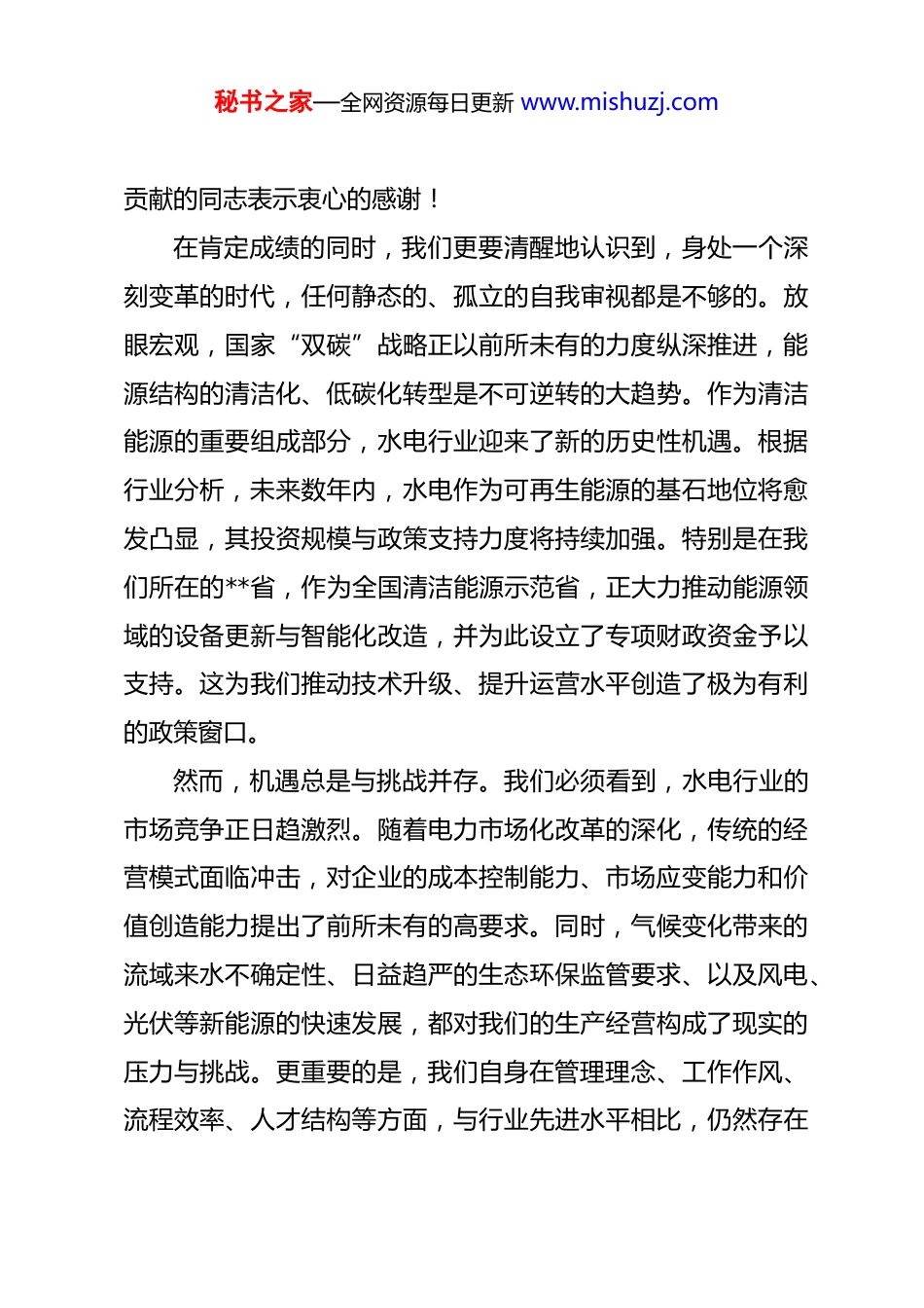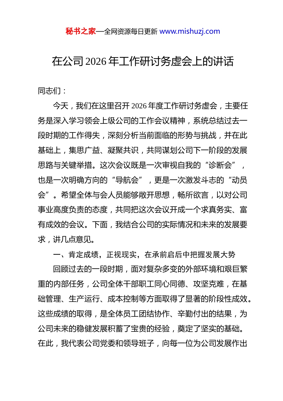 秘书之家—全网资源每日更新 www.mishuzj.com在公司 2026 年工作研讨务虚会上的讲话 同志们:今天,我们在这里召开 2026 年度工作研讨务虚会,主要任务是深入学习领会上级公司的工作会议精神,系统总结过去一段时期的工作得失,深刻分析当前面临的形势与挑战,并在此基础上,集思广益、凝聚共识,共同谋划公司下一阶段的发展思路与关键举措。这次会议既是一次审视自我的“诊断会”,也是一次明确方向的“导航会”,更是一次激发斗志的“动员会”。希望全体与会人员能够敞开思想,畅所欲言,以对公司事业高度负责的态度,共同把这次会议开成一个求真务实、富有成效的会议。下面,我结合公司的实际情况和未来的发展要求,讲几点意见。一、肯定成绩,正视现实,在承前启后中把握发展大势回顾过去的一段时期,面对复杂多变的外部环境和艰巨繁重的内部任务,公司全体干部职工同心同德、攻坚克难,在基础管理、生产运行、成本控制等方面取得了显著的阶段性成效。这些成绩的取得,是全体员工团结协作、辛勤付出的结果,为公司未来的稳健发展积蓄了宝贵的经验,奠定了坚实的基础。在此,我代表公司党委和领导班子,向每一位为公司发展作出秘书之家—全网资源每日更新 www.mishuzj.com贡献的同志表示衷心的感谢!在肯定成绩的同时,我们更要清醒地认识到,身处一个深刻变革的时代,任何静态的、孤立的自我审视都是不够的。放眼宏观,国家“双碳”战略正以前所未有的力度纵深推进,能源结构的清洁化、低碳化转型是不可逆转的大趋势。作为清洁能源的重要组成部分,水电行业迎来了新的历史性机遇。根据行业分析,未来数年内,水电作为可再生能源的基石地位将愈发凸显,其投资规模与政策支持力度将持续加强。特别是在我们所在的**省,作为全国清洁能源示范省,正大力推动能源领域的设备更新与智能化改造,并为此设立了专项财政资金予以支持。这为我们推动技术升级、提升运营水平创造了极为有利的政策窗口。然而,机遇总是与挑战并存。我们必须看到,水电行业的市场竞争正日趋激烈。随着电力市场化改革的深化,传统的经营模式面临冲击,对企业的成本控制能力、市场应变能力和价值创造能力提出了前所未有的高要求。同时,气候变化带来的流域来水不确定性、日益趋严的生态环保监管要求、以及风电、光伏等新能源的快速发展,都对我们的生产经营构成了现实的压力与挑战。更重要的是,我们自身在管理理念、工作作风、流程效率、人才结构等方面,与行业先进水平相比,仍然存在秘书之家—全网资源每日更新 www.mishuzj.com不容忽视的短板和差距。这些问题如果不能得到及时有效的解决,必将成为制约公司实现高质量发展的瓶颈。因此,我们必须胸怀“国之大者”,站在时代与行业发展的前沿,既要看到光明前景,坚定发展信心;又要正视困难挑战,增强忧患意识。要深刻认识到,过去行之有效的方法,不一定能解决今天和未来的问题;已经取得的成绩,更不能成为我们固步自封的理由。唯有以变应变、主动求变,方能于变局中开新局。二、聚焦核心,精准发力,以四大行动开启高质量发展新篇章面对新形势、新任务、新挑战,公司党委经过深入研究,决定在下一阶段集中力量,着力实施“效能提升、管理精进、人才强基、安全固本”四项战略行动。这四项行动互为支撑、有机统一,是破解当前发展难题、激发内生动力、实现高质量发展的总抓手。第一,深入推进效能提升行动,激活价值创造新引擎。效能是企业生存发展的核心竞争力。提升效能,关键在于突破传统思维定式,向科学技术要潜力,向数据智能要效益。当前,以大数据、人工智能、物联网为代表的数字化浪潮正席卷各行各业,水电行业的智能化转型已是大势所趋。**江流域正在推秘书之家—全网资源每日更新 www.mishuzj.com进的“数字**江”建设,以及利用大数据分析优化流域电站联动发电的实践,为我们指明了方向。我们必须紧紧抓住这一机遇,将数字化、智能化转型作为提升效能的主攻方向。要加快推进存量机组的自动化、智能化改造,积极探索应用预测性维护、智能调度、数字孪生等前沿技术فده是实现设备状态全息感知、故障诊断智能预警、运行决策科学精准。要...