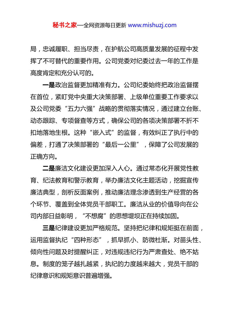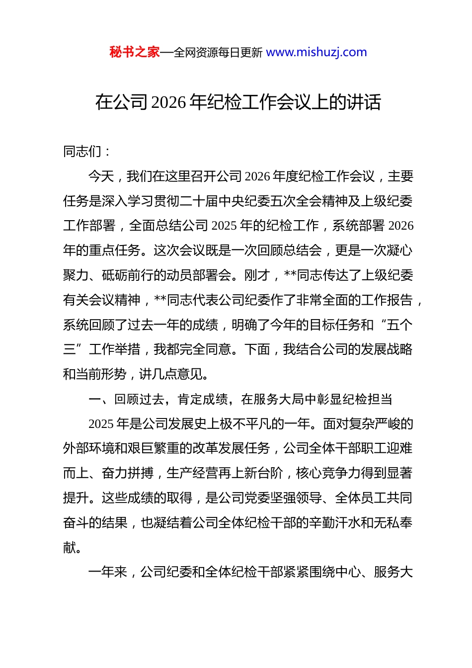 秘书之家—全网资源每日更新 www.mishuzj.com在公司 2026 年纪检工作会议上的讲话 同志们:今天,我们在这里召开公司 2026 年度纪检工作会议,主要任务是深入学习贯彻二十届中央纪委五次全会精神及上级纪委工作部署,全面总结公司 2025 年的纪检工作,系统部署 2026年的重点任务。这次会议既是一次回顾总结会,更是一次凝心聚力、砥砺前行的动员部署会。刚才,**同志传达了上级纪委有关会议精神,**同志代表公司纪委作了非常全面的工作报告,系统回顾了过去一年的成绩,明确了今年的目标任务和“五个三”工作举措,我都完全同意。下面,我结合公司的发展战略和当前形势,讲几点意见。一、回顾过去,肯定成绩,在服务大局中彰显纪检担当2025 年是公司发展史上极不平凡的一年。面对复杂严峻的外部环境和艰巨繁重的改革发展任务,公司全体干部职工迎难而上、奋力拼搏,生产经营再上新台阶,核心竞争力得到显著提升。这些成绩的取得,是公司党委坚强领导、全体员工共同奋斗的结果,也凝结着公司全体纪检干部的辛勤汗水和无私奉献。一年来,公司纪委和全体纪检干部紧紧围绕中心、服务大秘书之家—全网资源每日更新 www.mishuzj.com局,忠诚履职、担当尽责,在护航公司高质量发展的征程中发挥了不可替代的重要作用。公司党委对纪委过去一年的工作是高度肯定和充分认可的。一是政治监督更加精准有力。公司纪委始终把政治监督摆在首位,紧盯党中央重大决策部署、上级单位重要工作要求以及公司党委“五力六强”战略的贯彻落实情况,通过建立台账、动态跟踪、专项督查等方式,确保公司的各项决策部署不折不扣地落地生根。这种“嵌入式”的监督,有效纠正了执行中的偏差,打通了决策部署的“最后一公里”,保障了公司发展的正确方向。二是廉洁文化建设更加深入人心。通过常态化开展党性教育、纪法教育和警示教育,举办廉洁文化主题活动,挖掘宣传廉洁典型,剖析反面案例,推动廉洁理念渗透到生产经营的各个环节、覆盖到全体党员干部职工。廉洁从业的价值导向在公司内部日益彰明,“不想腐”的思想堤坝正在持续加固。三是纪律建设更加严格规范。坚持把纪律和规矩挺在前面,运用监督执纪“四种形态”,抓早抓小、防微杜渐。对苗头性、倾向性问题及时提醒纠正,对违规违纪行为严肃查处、绝不姑息。制度的笼子越扎越紧,执纪的力度越来越大,党员干部的纪律意识和规矩意识普遍增强。秘书之家—全网资源每日更新 www.mishuzj.com四是专项监督更加富有成效。聚焦采购招标、项目建设、产品销售、物资管理等重点领域和关键环节,开展了一系列专项监督检查,发现并推动整改了一批长期存在、影响发展的突出问题。通过精准监督,有效防范了廉洁风险,规范了权力运行,为公司挽回了经济损失,也净化了经营环境。五是纪检队伍建设更加坚实过硬。公司纪委持续加强自身建设,从严教育、从严管理、从严监督,广大纪检干部在思想淬炼、政治历练、实践锻炼和专业训练中,政治判断力、政治领悟力、政治执行力不断提高,一支忠诚干净担当、敢于善于斗争的纪检铁军正在成长壮大。总的来说,2025 年,公司纪检工作与生产经营中心工作同频共振、同向发力,实现了深度融合,为公司改革发展稳定提供了坚强的纪律保障。在此,我代表公司党委,向辛勤工作在纪检战线上的全体同志们,表示衷心的感谢和崇高的敬意!二、审时度势,认清挑战,在正视问题中保持战略清醒在肯定成绩的同时,我们必须清醒地认识到,党风廉政建设和反腐败斗争的形势依然严峻复杂。从外部环境看,当前世界经济复苏乏力,国内经济发展面临新的挑战,钢铁行业正处于转型升级的关键时期,各种不确定、不稳定因素增多,这对我们的经营管理和风险防控提出了更高要求。从内部治理看,秘书之家—全网资源每日更新 www.mishuzj.com随着公司规模的扩大和业务的拓展,一些深层次的矛盾和问题也逐渐显现。我们必须正视,当前在党风廉政建设方面还存在一些不容忽视的问题:一是个别领域的廉洁风险依然突出。在工程建设、物资采购、设备管理、产品销售等传统高风险领域,权力寻租、利益输送的风险依然存在。随着公司业务模式的创新,新的风险点也可...