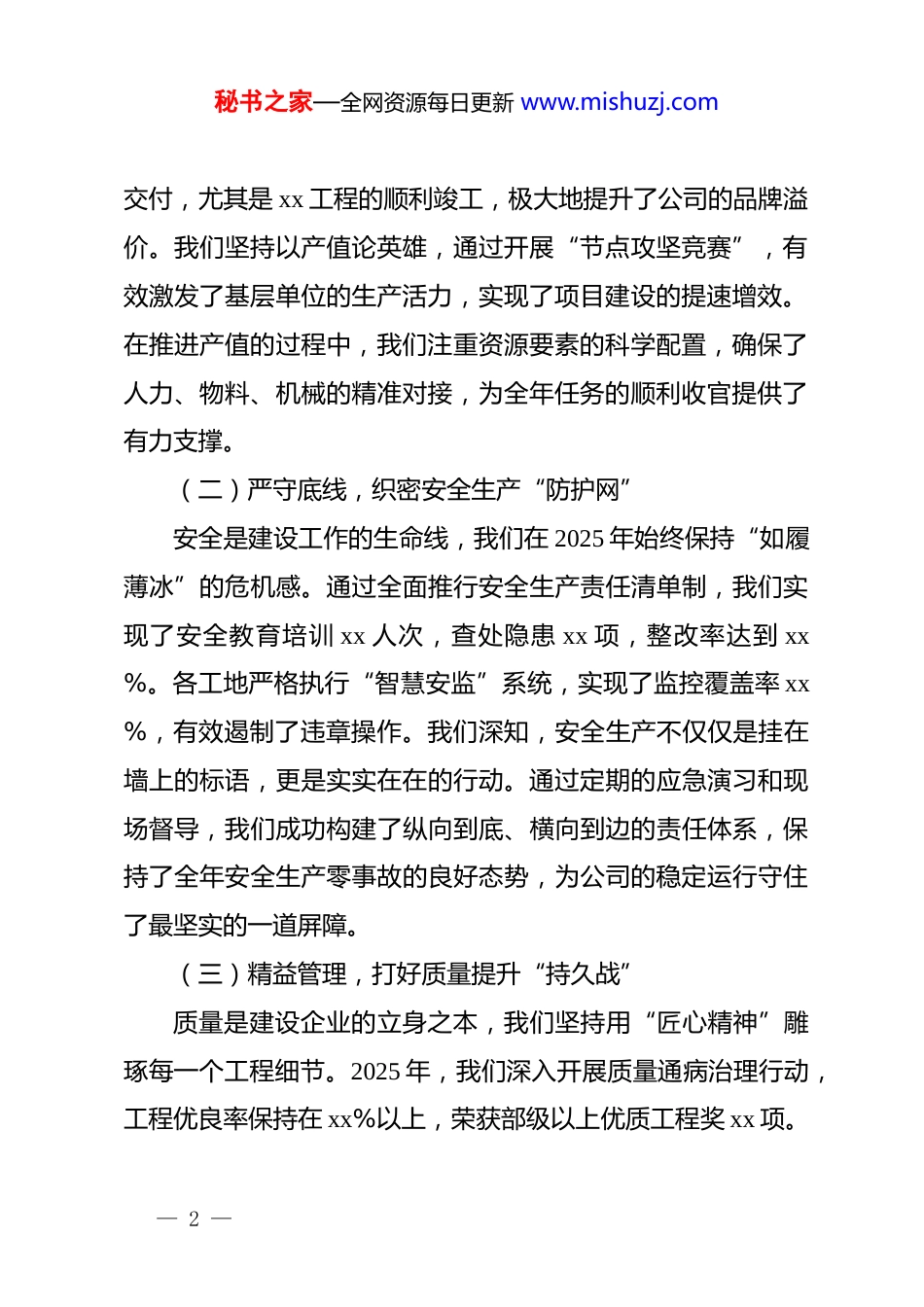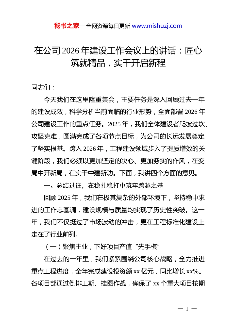 秘书之家—全网资源每日更新 www.mishuzj.com在公司 2026 年建设工作会议上的讲话:匠心筑就精品,实干开启新程同志们:今天我们在这里隆重集会,主要任务是深入回顾过去一年的建设成效,科学分析当前面临的行业形势,全面部署 2026 年公司建设工作的重点任务。2025 年,我们全体建设者爬坡过坎、攻坚克难,圆满完成了各项节点目标,为公司的长远发展奠定了坚实根基。跨入 2026 年,工程建设领域步入了提质增效的关键阶段,我们必须以更加坚定的决心、更加务实的作风,在变局中开新局,在实干中建新功。下面,我讲四个方面的意见。一、总结过往,在稳扎稳打中筑牢跨越之基回顾 2025 年,我们在极其复杂的外部环境下,坚持稳中求进的工作总基调,建设规模与质量均实现了历史性突破。这一年,我们不仅挺过了市场波动的冲击,更在工程标准化建设上走在了行业前列。(一)聚焦主业,下好项目产值“先手棋”在过去的一年里,我们紧紧围绕公司核心战略,全力推进重点工程进度,全年完成建设投资额 xx 亿元,同比增长 xx%。各项目部通过倒排工期、挂图作战,确保了 xx 个重大项目按期— 1 —秘书之家—全网资源每日更新 www.mishuzj.com交付,尤其是 xx 工程的顺利竣工,极大地提升了公司的品牌溢价。我们坚持以产值论英雄,通过开展“节点攻坚竞赛”,有效激发了基层单位的生产活力,实现了项目建设的提速增效。在推进产值的过程中,我们注重资源要素的科学配置,确保了人力、物料、机械的精准对接,为全年任务的顺利收官提供了有力支撑。(二)严守底线,织密安全生产“防护网”安全是建设工作的生命线,我们在 2025 年始终保持“如履薄冰”的危机感。通过全面推行安全生产责任清单制,我们实现了安全教育培训 xx 人次,查处隐患 xx 项,整改率达到 xx%。各工地严格执行“智慧安监”系统,实现了监控覆盖率 xx%,有效遏制了违章操作。我们深知,安全生产不仅仅是挂在墙上的标语,更是实实在在的行动。通过定期的应急演习和现场督导,我们成功构建了纵向到底、横向到边的责任体系,保持了全年安全生产零事故的良好态势,为公司的稳定运行守住了最坚实的一道屏障。(三)精益管理,打好质量提升“持久战”质量是建设企业的立身之本,我们坚持用“匠心精神”雕琢每一个工程细节。2025 年,我们深入开展质量通病治理行动,工程优良率保持在 xx%以上,荣获部级以上优质工程奖 xx 项。— 2 —秘书之家—全网资源每日更新 www.mishuzj.com各级技术人员深入施工一线,推行工艺样板制度,确保每一道工序都符合技术规范。我们不仅关注工程的“面子”,更严把隐蔽工程的“里子”,通过建立全过程质量追溯体系,实现了质量责任的闭环管理。这种对品质的近乎苛刻的追求,使我们的工程在第三方测评中名列前茅,赢得了业主和社会的广泛认可,进一步擦亮了公司的金字招牌。二、科学谋划,在精准发力中开创发展新局步入 2026 年,工程建设行业正面临从“量”到“质”的深度转型。我们必须准确识变、科学应变,以开局即决战的姿态,全面开启高质量建设的新航程。(一)创新引领,打造智慧施工“新标杆”2026 年,我们将全面推进建设工作的数字化转型,力争在“智能建造”领域取得突破性进展。我们要加大 bim 技术在设计、施工、运维全生命周期的深度应用,覆盖率力争达到 xx%以上。通过建设“智慧工地”集成平台,实现施工现场的可视化、精细化管理,全面提升协同效率。同时,要积极引入建筑机器人、无人机巡检等先进设备,逐步替代高强度、高风险的人工作业。创新不是口号,而是实实在在的生产力。我们要通过技术创新打破效率瓶颈,在未来的市场竞争中占领科技制高点,让创新成为驱动项目建设的第一动力。— 3 —秘书之家—全网资源每日更新 www.mishuzj.com(二)绿色转型,构建低碳发展“增长极”绿色发展是必由之路,我们要将“绿色施工”理念贯穿于项目建设的全过程。2026 年,公司所有新开工项目必须百分之百达到绿色建筑标准,建筑垃圾减量化指标要下降 xx%以上。我们将大力推广装配式建筑技术,通过工厂化预制、现场化安装,减少现场扬尘和噪音污染...