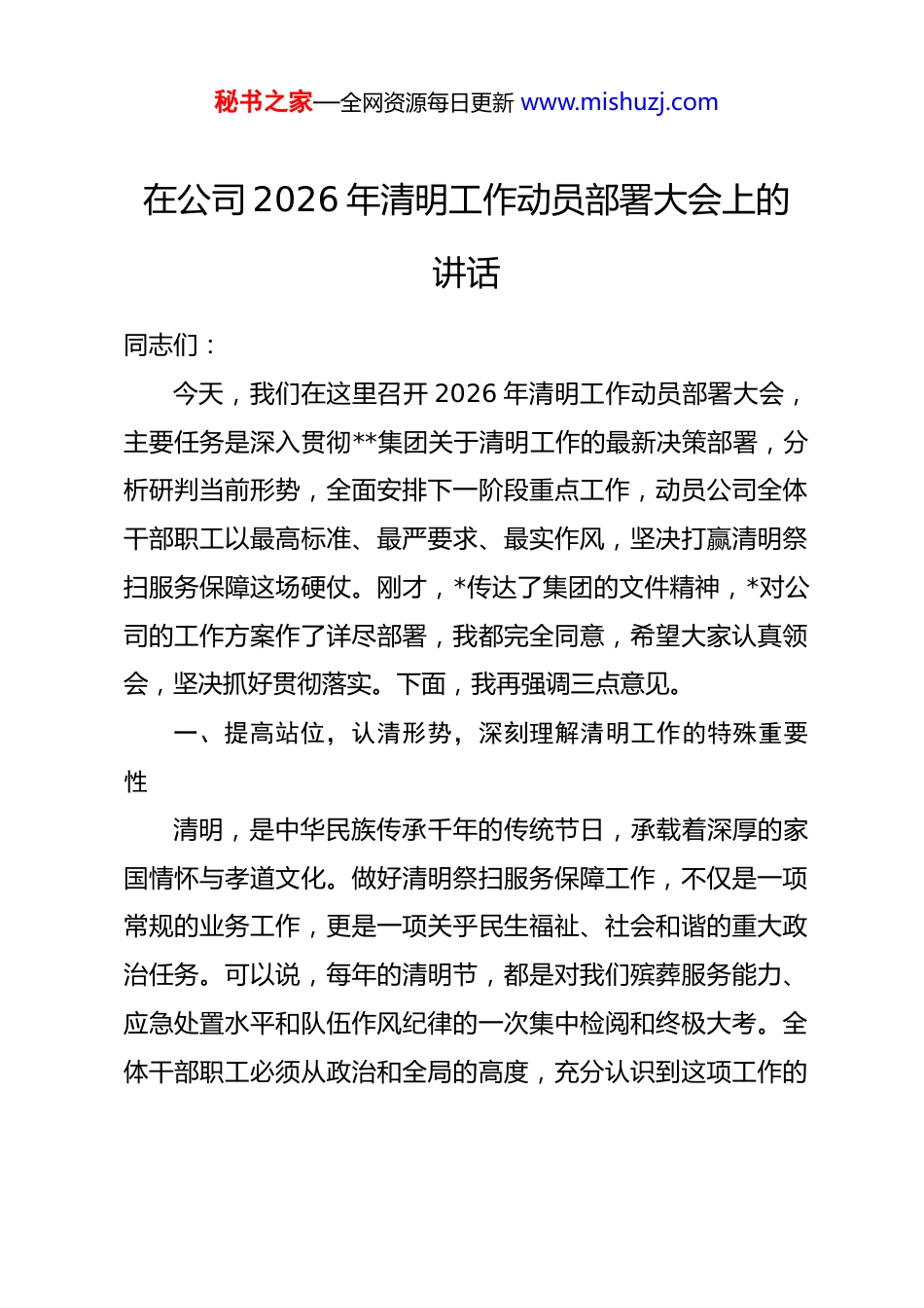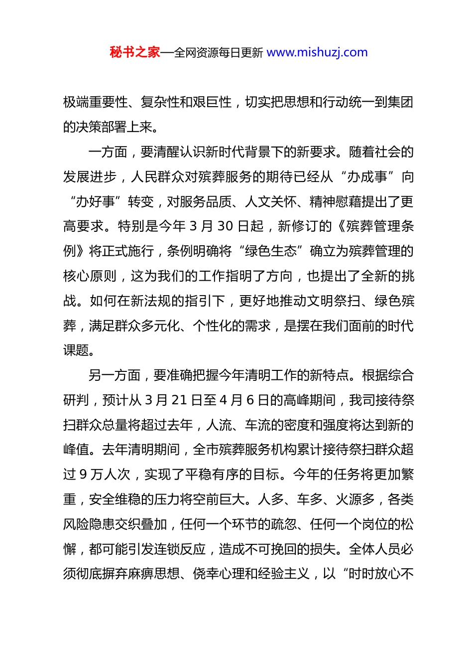 秘书之家—全网资源每日更新 www.mishuzj.com在公司 2026 年清明工作动员部署大会上的讲话同志们:今天,我们在这里召开 2026 年清明工作动员部署大会,主要任务是深入贯彻**集团关于清明工作的最新决策部署,分析研判当前形势,全面安排下一阶段重点工作,动员公司全体干部职工以最高标准、最严要求、最实作风,坚决打赢清明祭扫服务保障这场硬仗。刚才,*传达了集团的文件精神,*对公司的工作方案作了详尽部署,我都完全同意,希望大家认真领会,坚决抓好贯彻落实。下面,我再强调三点意见。一、提高站位,认清形势,深刻理解清明工作的特殊重要性清明,是中华民族传承千年的传统节日,承载着深厚的家国情怀与孝道文化。做好清明祭扫服务保障工作,不仅是一项常规的业务工作,更是一项关乎民生福祉、社会和谐的重大政治任务。可以说,每年的清明节,都是对我们殡葬服务能力、应急处置水平和队伍作风纪律的一次集中检阅和终极大考。全体干部职工必须从政治和全局的高度,充分认识到这项工作的秘书之家—全网资源每日更新 www.mishuzj.com极端重要性、复杂性和艰巨性,切实把思想和行动统一到集团的决策部署上来。一方面,要清醒认识新时代背景下的新要求。随着社会的发展进步,人民群众对殡葬服务的期待已经从“办成事”向“办好事”转变,对服务品质、人文关怀、精神慰藉提出了更高要求。特别是今年 3 月 30 日起,新修订的《殡葬管理条例》将正式施行,条例明确将“绿色生态”确立为殡葬管理的核心原则,这为我们的工作指明了方向,也提出了全新的挑战。如何在新法规的指引下,更好地推动文明祭扫、绿色殡葬,满足群众多元化、个性化的需求,是摆在我们面前的时代课题。另一方面,要准确把握今年清明工作的新特点。根据综合研判,预计从 3 月 21 日至 4 月 6 日的高峰期间,我司接待祭扫群众总量将超过去年,人流、车流的密度和强度将达到新的峰值。去年清明期间,全市殡葬服务机构累计接待祭扫群众超过 9 万人次,实现了平稳有序的目标。今年的任务将更加繁重,安全维稳的压力将空前巨大。人多、车多、火源多,各类风险隐患交织叠加,任何一个环节的疏忽、任何一个岗位的松懈,都可能引发连锁反应,造成不可挽回的损失。全体人员必须彻底摒弃麻痹思想、侥幸心理和经验主义,以“时时放心不秘书之家—全网资源每日更新 www.mishuzj.com下”的责任感,把工作做得更细、更实、更周全。二、聚焦关键,精准发力,全力构筑清明工作的坚固防线圆满完成今年的清明工作任务,必须坚持问题导向、目标导向、结果导向,纲举目张,抓住关键。公司制定的《2026年清明节工作方案》,已经对各项工作作出了详细安排,关键在于不折不扣地执行。这里,要重点抓好“三个体系”的建设。第一,构建万无一失的安全管控体系。安全是清明工作的底线,是不可逾越的红线,是所有工作的前提和基础。没有安全,一切都等于零。必须深入学习贯彻******关于安全生产及森林防灭火工作的****批示精神,以最高标准、最严措施,确保实现“零差错、零事故、零投诉”的“三零”目标。一要织密责任防控网。必须全面落实安全生产责任制,将安全责任层层分解,压实到每个部门、每个班组、每个岗位、每位员工。特别是寄存室、焚烧园、火化车间等火灾高风险区域,要明确第一责任人,严格执行用火用电规定,配足配齐消防设施,确保关键时刻拉得出、用得上。二要筑牢交通疏导墙。交通压力是每年清明最大的难点之一。今年,要全面推行“网格化”交通疏导新模式。所谓“网格化”,就是将整个园区,包括停车场、主干道、业务厅、墓秘书之家—全网资源每日更新 www.mishuzj.com区等,划分为若干个责任网格,每个网格由专人负责,定人、定岗、定责。通过网格员的主动引导、信息互通和高效联动,实现对车辆和人流的精准分流、快速疏导,最大限度避免拥堵和对冲,确保交通线路的畅通有序。三要启动应急响应最高级。必须坚持底线思维,做足充分准备。要严格执行 24 小时值班值守制度,领导干部要带头深入一线、靠前指挥。关键岗位、重要环节要全面推行“双保险”人员配置,即设立 a、b 角,确保任何情况下...