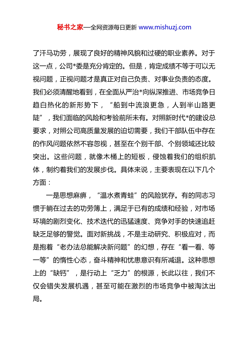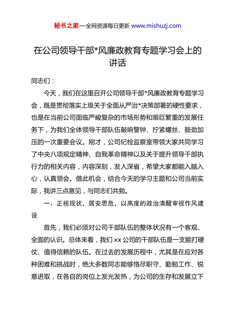 秘书之家—全网资源每日更新 www.mishuzj.com在公司领导干部*风廉政教育专题学习会上的讲话同志们:今天,我们在这里召开公司领导干部*风廉政教育专题学习会,既是贯彻落实上级关于全面从严治*决策部署的硬性要求,也是在当前公司面临严峻复杂的市场形势和艰巨繁重的发展任务下,为我们全体领导干部队伍敲响警钟、拧紧螺丝、鼓劲加压的一次重要会议。刚才,公司纪检监察室带领大家共同学习了中央八项规定精神、自我革命精神以及关于提升领导干部执行力的相关内容,内容深刻,发人深省,希望大家都能入脑入心,认真领会。借此机会,结合今天的学习主题和公司当前实际,我讲三点意见,与同志们共勉。一、正视现状,居安思危,以高度的政治清醒审视作风建设首先,我们必须对公司干部队伍的整体状况有一个客观、全面的认识。总体来看,我们 xx 公司的干部队伍是一支能打硬仗、值得信赖的队伍。在过去的发展历程中,尤其是在应对各种困难和挑战时,绝大多数同志能够恪尽职守、勤勉工作、锐意进取,在各自的岗位上发光发热,为公司的生存和发展立下秘书之家—全网资源每日更新 www.mishuzj.com了汗马功劳,展现了良好的精神风貌和过硬的职业素养。对于这一点,公司*委是充分肯定的。但是,肯定成绩不等于可以无视问题,正视问题才是真正对自己负责、对事业负责的态度。我们必须清醒地看到,在全面从严治*向纵深推进、市场竞争日趋白热化的新形势下,“船到中流浪更急,人到半山路更陡”,我们面临的风险和考验前所未有。对照新时代*的建设总要求,对照公司高质量发展的迫切需要,我们干部队伍中存在的作风问题依然不容忽视,甚至在个别干部、个别领域还比较突出。这些问题,就像木桶上的短板,侵蚀着我们的组织肌体,制约着我们的发展步伐。具体来说,主要表现在以下几个方面:一是思想麻痹,“温水煮青蛙”的风险犹存。有的同志习惯于躺在过去的功劳簿上,满足于已有的成绩和经验,对市场环境的剧烈变化、技术迭代的迅猛速度、竞争对手的快速追赶缺乏足够的警觉。面对新挑战,不是主动研究、积极应对,而是抱着“老办法总能解决新问题”的幻想,存在“看一看、等一等”的惰性心态,奋斗精神和忧患意识有所减退。这种思想上的“缺钙”,是行动上“乏力”的根源,长此以往,我们不仅会错失发展机遇,甚至可能在激烈的市场竞争中被淘汰出局。秘书之家—全网资源每日更新 www.mishuzj.com二是标准不高,“差不多主义”的思想作祟。有的干部在工作中奉行“过得去就行”,满足于“交差了事”,缺乏精益求精的“工匠精神”。对上级部署的工作,满足于开会传达了、文件下发了,至于落实效果如何、有没有达到预期目标,缺乏一竿子插到底的跟踪问效。在项目管理、成本控制、客户服务等关键环节,标准不高、要求不严,导致工作质效打了折扣。这种“差不多主义”看似是小问题,实则是责任心不强的突出表现,日积月累,会严重影响公司的产品质量、品牌声誉和核心竞争力。三是担当不足,“明哲保身”的风气抬头。少数干部在困难和矛盾面前,不是迎难而上、主动作为,而是选择绕道走、当“甩手掌柜”。有的信奉“多做多错,少做少错,不做不错”的处世哲学,抱着“只要不出事,宁可不干事”的心态,缺乏攻坚克难的勇气和魄力。有的习惯于把问题上交、把矛盾外推、把责任下卸,部门之间协调工作时推诿扯皮,缺乏全局观念和协作精神。这种不敢担当、不愿负责的行为,是当前我们工作推进中最大的“中梗阻”,严重影响了公司的决策效率和执行力。同志们,以上这些问题虽然只存在于少数干部身上,但其负面影响和潜在危害极大,正所谓“千里之堤,溃于蚁穴”。秘书之家—全网资源每日更新 www.mishuzj.com如果我们对此听之任之、不闻不问,就会形成“破窗效应”,带坏整个干部队伍的风气,动摇公司发展的根基。当前,公司正处于爬坡过坎、转型升级的关键时期,外部市场压力巨大,内部发展任务艰巨。越是在这样的时候,我们越要保持“赶考”的清醒,越要发扬彻底的自我革命精神,以刮骨疗毒的勇气、坚如磐石的决心,向作风顽疾“亮剑”,为公司行稳致远扫清障碍。二、聚焦关键,以上率下,以“头雁效应”...