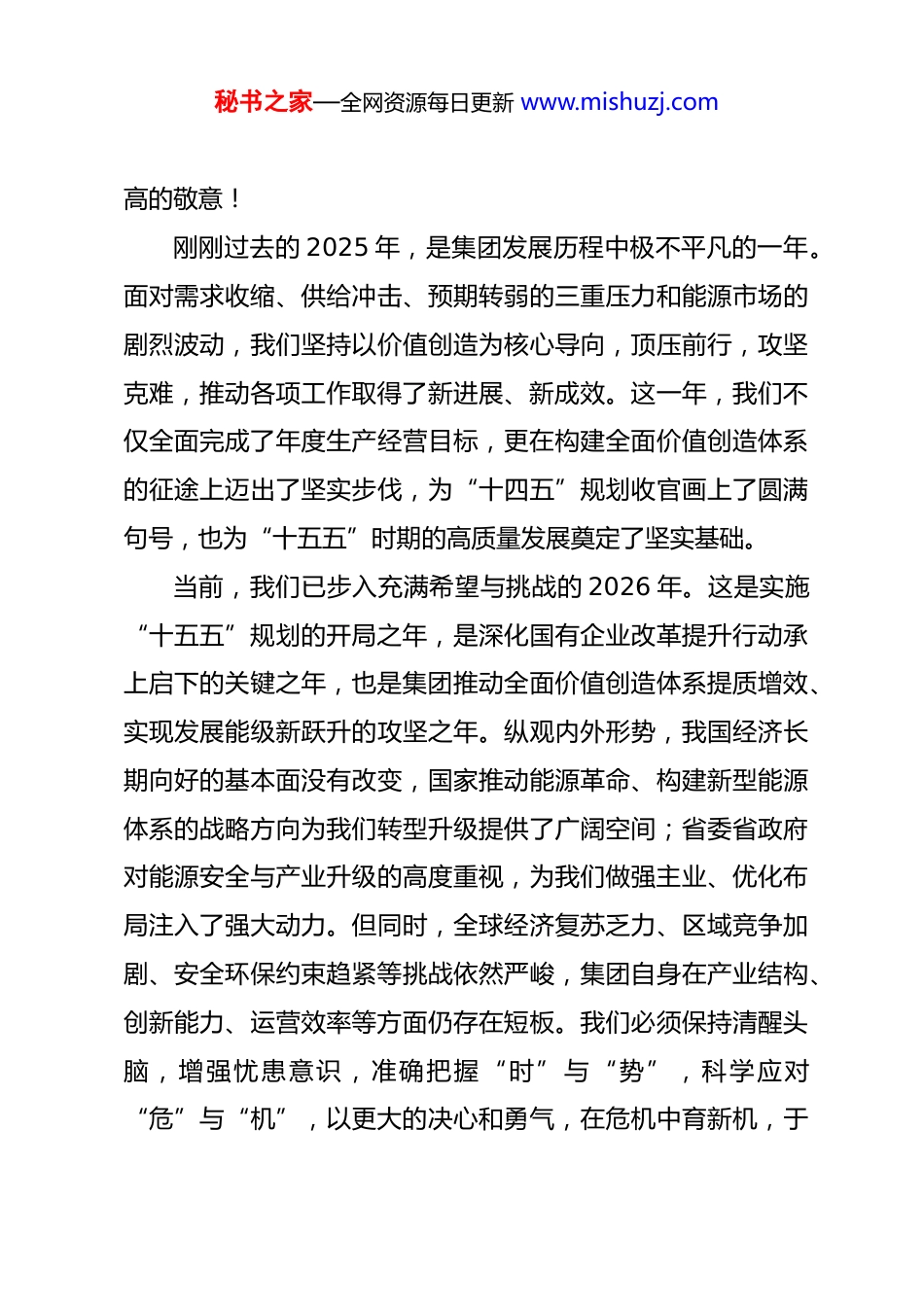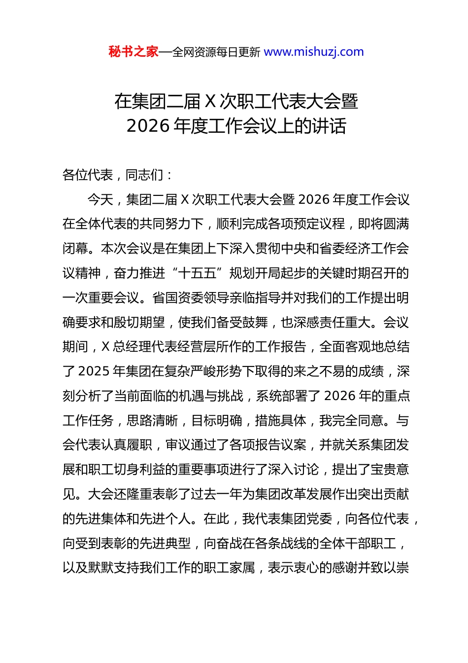 秘书之家—全网资源每日更新 www.mishuzj.com在集团二届 X 次职工代表大会暨2026 年度工作会议上的讲话各位代表,同志们:今天,集团二届 X 次职工代表大会暨 2026 年度工作会议在全体代表的共同努力下,顺利完成各项预定议程,即将圆满闭幕。本次会议是在集团上下深入贯彻中央和省委经济工作会议精神,奋力推进“十五五”规划开局起步的关键时期召开的一次重要会议。省国资委领导亲临指导并对我们的工作提出明确要求和殷切期望,使我们备受鼓舞,也深感责任重大。会议期间,X 总经理代表经营层所作的工作报告,全面客观地总结了 2025 年集团在复杂严峻形势下取得的来之不易的成绩,深刻分析了当前面临的机遇与挑战,系统部署了 2026 年的重点工作任务,思路清晰,目标明确,措施具体,我完全同意。与会代表认真履职,审议通过了各项报告议案,并就关系集团发展和职工切身利益的重要事项进行了深入讨论,提出了宝贵意见。大会还隆重表彰了过去一年为集团改革发展作出突出贡献的先进集体和先进个人。在此,我代表集团党委,向各位代表,向受到表彰的先进典型,向奋战在各条战线的全体干部职工,以及默默支持我们工作的职工家属,表示衷心的感谢并致以崇秘书之家—全网资源每日更新 www.mishuzj.com高的敬意!刚刚过去的 2025 年,是集团发展历程中极不平凡的一年。面对需求收缩、供给冲击、预期转弱的三重压力和能源市场的剧烈波动,我们坚持以价值创造为核心导向,顶压前行,攻坚克难,推动各项工作取得了新进展、新成效。这一年,我们不仅全面完成了年度生产经营目标,更在构建全面价值创造体系的征途上迈出了坚实步伐,为“十四五”规划收官画上了圆满句号,也为“十五五”时期的高质量发展奠定了坚实基础。当前,我们已步入充满希望与挑战的 2026 年。这是实施“十五五”规划的开局之年,是深化国有企业改革提升行动承上启下的关键之年,也是集团推动全面价值创造体系提质增效、实现发展能级新跃升的攻坚之年。纵观内外形势,我国经济长期向好的基本面没有改变,国家推动能源革命、构建新型能源体系的战略方向为我们转型升级提供了广阔空间;省委省政府对能源安全与产业升级的高度重视,为我们做强主业、优化布局注入了强大动力。但同时,全球经济复苏乏力、区域竞争加剧、安全环保约束趋紧等挑战依然严峻,集团自身在产业结构、创新能力、运营效率等方面仍存在短板。我们必须保持清醒头脑,增强忧患意识,准确把握“时”与“势”,科学应对“危”与“机”,以更大的决心和勇气,在危机中育新机,于秘书之家—全网资源每日更新 www.mishuzj.com变局中开新局。本次大会确立的 2026 年工作思路和目标任务,是集团党委基于对形势任务的深刻判断作出的重要决策,核心就是要坚持稳中求进、以进促稳、先立后破的总基调,聚焦价值创造 3.0 升级,推动集团高质量发展行稳致远。下面,我讲四个方面的意见。一、深化价值创造认识,凝聚高质量发展广泛共识历经数年的探索与实践,“价值创造”已从最初的管理理念,深度融入集团战略决策、生产经营、改革创新的各个环节,成为引领我们发展的鲜明旗帜和普遍共识。2025 年的实践再次证明,价值创造是企业生存发展的永恒主题,是应对一切风险挑战的根本之道。我们所追求的价值,是涵盖经济、政治、社会、安全、创新、民生等在内的全面价值,是体现国有企业功能定位、满足各方期待的综合价值。过去一年,我们深刻体会到:唯有持续创造卓越的经济价值,才能不断夯实企业物质基础,确保国有资产保值增值,为履行更广泛责任提供坚实支撑。唯有持续创造坚实的政治价值,才能坚持党的全面领导,确保企业发展的正确方向,将党建优势转化为治理效能。唯有持续创造可靠的安全价值,才能筑牢企业发展的生命线,为一切经营活动提供前提保障。唯有持续创造前沿的创新价值,才能突破发展瓶颈,培育新质生产力,秘书之家—全网资源每日更新 www.mishuzj.com赢得未来竞争主动权。唯有持续创造和谐的社会价值,才能赢得良好声誉,优化发展环境,展现国企担当。唯有持续创造温暖的民生价值,才能凝聚人心力量,激发内生动力,实现共建共...