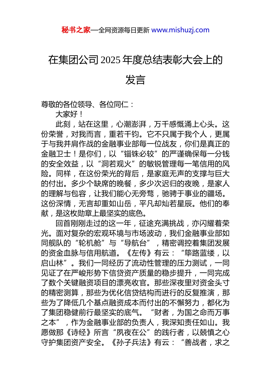 秘书之家—全网资源每日更新 www.mishuzj.com在集团公司 2025 年度总结表彰大会上的发言尊敬的各位领导、各位同仁:大家好!此刻,站在这里,心潮澎湃,万千感慨涌上心头。这份荣誉,对我而言,重若千钧。它不只属于我个人,更属于与我并肩作战的金融事业部每一位战友,你们是真正的金融卫士!是你们,以“锱铢必较”的严谨确保每一分钱的安全效益,以“洞若观火”的敏锐管理每一笔信用的风险。同样,在这份荣光的背后,是家庭无声的支撑与巨大的付出。多少个缺席的晚餐,多少次迟归的夜晚,是家人的理解与包容,让我们能心无旁骛,驰骋于事业的疆场。这份深情,无言却重如山岳,平凡却灿若星辰。他们的奉献,是这枚勋章上最坚实的底色。回首刚刚走过的这一年,征途充满挑战,亦闪耀着荣光。面对复杂的宏观环境与市场波动,我们金融事业部如同舰队的“轮机舱”与“导航台”,精密调控着集团发展的资金血脉与信用航道。《左传》有云:“筚路蓝缕,以启山林”。我们一同经历了流动性管理的压力测试,一同见证了在严峻形势下信贷资产质量的稳步提升,一同完成了数个关键融资项目的漂亮收官。那些深夜里对资金头寸的精密测算,那些为优化信贷结构而进行的反复推演,那些为了降低几个基点融资成本而付出的不懈努力,都化为了集团稳健前行最坚实的底气。“财者,为国之命而万事之本”,作为金融事业部的负责人,我深知责任如山。我愿做那《诗经》所言“夙夜在公”的践行者,以兢慎之心守护集团资产安全。《孙子兵法》有云:“善战者,求之秘书之家—全网资源每日更新 www.mishuzj.com于势。”我们的价值,就在于为集团战略创造最有利的“资金之势”与“信用之势”。以“恪尽职守、精打细算”的职业操守,守护着集团发展的命脉与根本。凡是过往,皆为序章。成绩属于昨天,奋斗定义未来。展望新的一年,金融事业部重任在肩。在此,我代表部门全体同仁郑重表态,我们将围绕集团核心战略,聚焦主责主业,全力实施以下举措:第一,强化“资金枢纽”功能,在保障集团血脉畅通上展现新作为。我们将以更前瞻的研判、更精细的管理,优化全球资金布局,提升资金集中度与使用效率,确保集团在瞬息万变的市场中“手中有粮,心中不慌”。深化与金融机构的战略合作,拓宽融资渠道,创新融资工具,持续降低综合融资成本,为集团重大项目与产业发展注入源源不断的金融“活水”。第二,筑牢“信贷风险”堤坝,在守护集团资产安全上体现新担当。我们将坚持风险防控与业务发展并重,完善全流程、穿透式的信用风险管理体系。运用科技赋能,提升风险识别的精准性与前瞻性,做到“看得清、管得住”。优化信贷资产结构,有保有压,精准滴灌,确保集团信用资源投向最有效率、最具潜力的领域,筑牢高质量发展的安全屏障。第三,提升“价值创造”能力,在助力集团战略落地上实现新突破。我们将超越传统的资金管理者角色,积极向“价值型金融伙伴”转型。深度参与业务前端,提供专业的金融解决方案与决策支持。探索供应链金融、绿色金融等创新模式,通过金融手段赋能主业,放大产业价值,真正成为集团战略落地不可或缺的“助推器”与“增长极”。同仁们!新征程的号角已经吹响。金融事业部的使命,就是为集团的远征备足粮草、校准罗盘、护航风雨。前方的航程,或许仍有惊涛骇浪,但我们坚信,只要保持“百秘书之家—全网资源每日更新 www.mishuzj.com舸争流,奋楫者先”的拼搏精神,锤炼“任凭风浪起,稳坐钓鱼台”的专业定力,凝聚“万人操弓,共射一招”的团队合力,我们就一定能驾驭资金之舟,穿越周期,驶向更加广阔的蓝海,以金融之笔,共同谱写集团未来更加波澜壮阔的辉煌篇章!最后,在新春即将来临之际,衷心祝愿我们的企业基业长青、蒸蒸日上!祝愿各位领导、同仁及家人们,龙马精神,万事胜意,阖家幸福!谢谢大家!