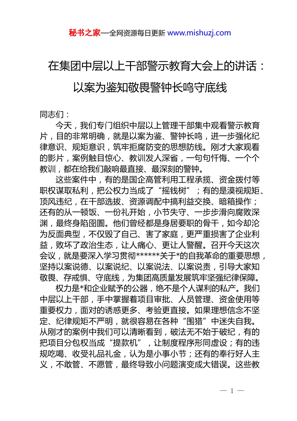 秘书之家—全网资源每日更新 www.mishuzj.com在集团中层以上干部警示教育大会上的讲话:以案为鉴知敬畏警钟长鸣守底线同志们:今天,我们专门组织中层以上管理干部集中观看警示教育片,目的非常明确,就是以案为鉴、警钟长鸣,进一步强化纪律意识、规矩意识,筑牢拒腐防变的思想防线。刚才大家观看的影片,案例触目惊心、教训发人深省,一句句忏悔、一个个教训,都在给我们敲响最直接、最深刻的警钟。这些案件中,有的是国企高管利用工程承揽、资金拨付等职权谋取私利,把公权力当成了“摇钱树”;有的是漠视规矩、顶风违纪,在干部选拔、资源调配中搞利益交换、暗箱操作;还有的从一顿饭、一份礼开始,小节失守、一步步滑向腐败深渊,最终身陷囹圄。他们曾经都是身居要职的骨干,如今却沦为反面典型,不仅毁了自己、害了家庭,更严重损害了企业利益,败坏了政治生态,让人痛心、更让人警醒。召开今天这次会议,就是要深入学习贯彻******关于*的自我革命的重要思想,坚持以案说德、以案说纪、以案说法、以案说责,引导大家知敬畏、存戒惧、守底线,为集团高质量发展筑牢坚强纪律保障。权力是*和企业赋予的公器,绝不是个人谋利的私产。我们中层以上干部,手中掌握着项目审批、人员管理、资金使用等重要权力,面对的诱惑更多、考验更直接。如果理想信念不坚定、纪律规矩不严明,就很容易在各种“围猎”中迷失自我。从刚才的案例中我们可以清晰看到,破法无不始于破纪,有的把项目分包权当成“提款机”,让制度程序形同虚设;有的违规吃喝、收受礼品礼金,认为是小事小节;还有的奉行好人主义,不敢管、不愿管,最终导致小问题演变成大错误。这些教— 1 —秘书之家—全网资源每日更新 www.mishuzj.com训深刻警示我们,侥幸是最大的危险,麻痹是最大的隐患,一旦触碰纪法红线,无论职务多高、贡献多大,终将受到严肃查处、付出沉重代价。在看到教训的同时,我们也要清醒认识到,集团*风廉政建设还存在一些薄弱环节。少数干部政治站位不高,对中央八项规定精神认识不到位,觉得吃点喝点、拿点收点不算什么;有的干部纪律意识淡薄,在工程招标、物资采购等关键环节不按制度办事;还有的干部履行“一岗双责”不到位,对分管领域*风廉政建设抓得不紧、管得不严。这些问题看似不大,但如果不及时纠正、不彻底整改,就会埋下腐败的种子,最终影响企业发展大局。全体中层以上干部,必须以此次警示教育为契机,反躬自省、警钟长鸣,真正从思想深处拧紧螺丝。借此机会,我对全体中层以上干部提四点要求:第一,筑牢思想防线,永葆忠诚本色。要持续深入学习******关于*的作风建设、纪律建设的重要论述,把中央八项规定及其实施细则精神学深悟透、落到实处,不断提高政治判断力、政治领悟力、政治执行力。要坚定理想信念,勤修为政之德,常思贪欲之害,自觉用*的创新理论武装头脑,用廉洁文化涵养清风正气,始终做到忠诚于*、忠诚于企业、忠诚于职工群众,从思想根源上筑牢拒腐防变的堤坝。第二,严守纪律底线,规范用权履职。纪律规矩是带电的“高压线”,绝不能触碰、绝不能逾越。大家要时刻绷紧纪律这根弦,严格遵守*的政治纪律、组织纪律、廉洁纪律、群众纪律、工作纪律、生活纪律,在工程招标、资金拨付、干部任用等关键环节,坚决按制度办事、按程序操作,不搞变通、不打折扣、不越雷池。要自觉净化社交圈、生活圈、朋友圈,管好自己、管好家人、管好身边人,坚决抵制各种歪风邪气,做到公正用权、依法用权、廉洁用权。第三,压实主体责任,强化严管厚爱。作为管理干部,既— 2 —秘书之家—全网资源每日更新 www.mishuzj.com要抓好业务,更要抓好*风廉政建设,必须切实履行好“一岗双责”。要敢抓敢管、严抓严管,对苗头性、倾向性问题早发现、早提醒、早纠正,真正做到抓早抓小、防微杜渐。同时,要坚持严管和厚爱结合、激励和约束并重,对违纪违法行为零容忍,对敢于担当、踏实做事的干部撑腰鼓劲,营造既守纪律、又敢担当的良好干事氛围。第四,坚持风腐同查,深化以案促改。要深刻认识风腐同源、风腐一体的规律,既要严肃查处腐败问题,也要深挖背后的作风隐患,坚决斩断由风及...