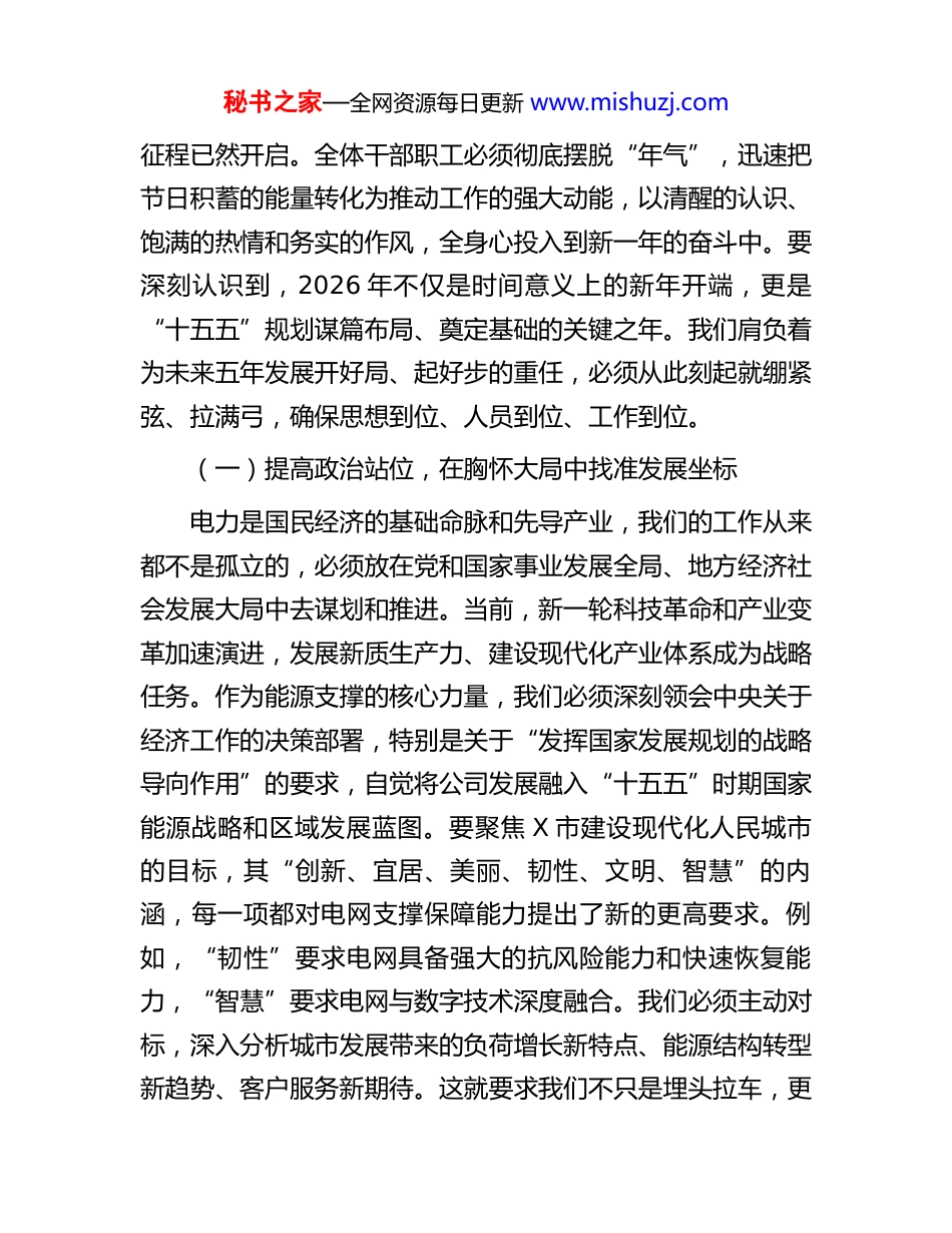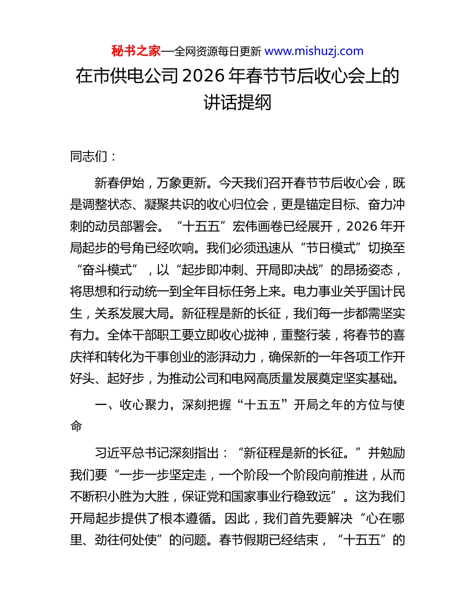 秘书之家—全网资源每日更新 www.mishuzj.com在市供电公司 2026 年春节节后收心会上的讲话提纲同志们:新春伊始,万象更新。今天我们召开春节节后收心会,既是调整状态、凝聚共识的收心归位会,更是锚定目标、奋力冲刺的动员部署会。“十五五”宏伟画卷已经展开,2026 年开局起步的号角已经吹响。我们必须迅速从“节日模式”切换至“奋斗模式”,以“起步即冲刺、开局即决战”的昂扬姿态,将思想和行动统一到全年目标任务上来。电力事业关乎国计民生,关系发展大局。新征程是新的长征,我们每一步都需坚实有力。全体干部职工要立即收心拢神,重整行装,将春节的喜庆祥和转化为干事创业的澎湃动力,确保新的一年各项工作开好头、起好步,为推动公司和电网高质量发展奠定坚实基础。一、收心聚力,深刻把握“十五五”开局之年的方位与使命习近平总书记深刻指出:“新征程是新的长征。”并勉励我们要“一步一步坚定走,一个阶段一个阶段向前推进,从而不断积小胜为大胜,保证党和国家事业行稳致远”。这为我们开局起步提供了根本遵循。因此,我们首先要解决“心在哪里、劲往何处使”的问题。春节假期已经结束,“十五五”的秘书之家—全网资源每日更新 www.mishuzj.com征程已然开启。全体干部职工必须彻底摆脱“年气”,迅速把节日积蓄的能量转化为推动工作的强大动能,以清醒的认识、饱满的热情和务实的作风,全身心投入到新一年的奋斗中。要深刻认识到,2026 年不仅是时间意义上的新年开端,更是“十五五”规划谋篇布局、奠定基础的关键之年。我们肩负着为未来五年发展开好局、起好步的重任,必须从此刻起就绷紧弦、拉满弓,确保思想到位、人员到位、工作到位。(一)提高政治站位,在胸怀大局中找准发展坐标电力是国民经济的基础命脉和先导产业,我们的工作从来都不是孤立的,必须放在党和国家事业发展全局、地方经济社会发展大局中去谋划和推进。当前,新一轮科技革命和产业变革加速演进,发展新质生产力、建设现代化产业体系成为战略任务。作为能源支撑的核心力量,我们必须深刻领会中央关于经济工作的决策部署,特别是关于“发挥国家发展规划的战略导向作用”的要求,自觉将公司发展融入“十五五”时期国家能源战略和区域发展蓝图。要聚焦 X 市建设现代化人民城市的目标,其“创新、宜居、美丽、韧性、文明、智慧”的内涵,每一项都对电网支撑保障能力提出了新的更高要求。例如,“韧性”要求电网具备强大的抗风险能力和快速恢复能力,“智慧”要求电网与数字技术深度融合。我们必须主动对标,深入分析城市发展带来的负荷增长新特点、能源结构转型新趋势、客户服务新期待。这就要求我们不只是埋头拉车,更秘书之家—全网资源每日更新 www.mishuzj.com要抬头看路。要加强政策学习和形势研判,读懂国家规划的“有字书”,也要洞察地方发展的“无字书”,从宏观大势中把握发展机遇,从区域需求中明确主攻方向,确保我们的电网规划、投资建设、运营服务始终与大局同频共振,真正成为地方高质量发展可靠、坚强的“电力引擎”。(二)清醒认识形势,在把握变局中坚定前行信心开局之年,机遇与挑战并存,动力与压力同在。从机遇看,经济长期向好的基本面没有改变,X 市一系列重大战略、重点项目的实施,必将催生稳定增长的用电需求,为电网发展提供广阔空间。同时,能源革命与数字革命深度融合,新型电力系统建设加速,为我们推动电网转型升级、培育发展新动能创造了历史性窗口。从挑战看,外部环境不确定性增多,电力安全保供的政治责任和社会责任愈发重大;电网“双高”“双峰”特征日益凸显,运行控制的复杂性挑战加剧;电力市场化改革纵深推进,经营管理和市场竞争的压力持续传导;社会对供电可靠性、服务便捷性、用能经济性的要求只增不减。面对这样的形势,盲目乐观和消极畏难都不可取。我们必须坚持“稳中求进”工作总基调,既要看到有利条件,坚定发展信心,保持战略定力;更要正视困难挑战,增强忧患意识,树牢底线思维。要科学分析公司自身存在的短板,比如在网架结构、设备水平、服务质量、人才队伍等方面与高质量发展要求可能存在的差距。唯有客观、全面、辩证地...