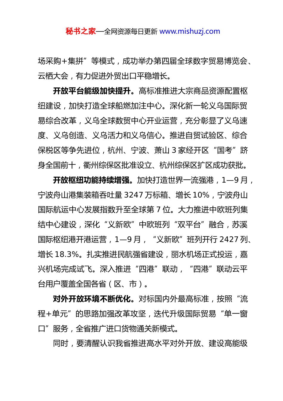 秘书之家—全网资源每日更新 www.mishuzj.com在推进高水平对外开放、建设高能级开放强省现场推进会上的讲话(摘要)浙江省委书记 王浩(2025 年 10 月 14 日)2024 年 12 月,省委、省政府深入学习贯彻习近平总书记考察浙江时提出的“4+1”重要要求,对标落实“在深化改革、扩大开放上续写新篇”,对推进高水平对外开放、建设高能级开放强省进行了系统部署。我们要深入学习贯彻习近平总书记关于对外开放重要论述精神和考察浙江重要讲话精神,盘点总结前阶段工作成效,查找分析问题短板,研究部署下一步重点工作,加快在推进高水平对外开放、建设高能级开放强省上取得新突破。充分肯定推进高水平对外开放、建设高能级开放强省取得的阶段性成效近段时间以来,各地各部门认真落实省委、省政府决策部署,真抓实干、攻坚克难,高效率高标准推进各项工作落地见效,在大仗硬仗面前交出了对外开放的高分答卷。外贸发展新动能不断壮大。全力打好“稳拓调优”组合拳,推进“直播+平台+跨境电商”三位一体融合发展,创新“市秘书之家—全网资源每日更新 www.mishuzj.com场采购+集拼”等模式,成功举办第四届全球数字贸易博览会、云栖大会,有力促进外贸出口平稳增长。开放平台能级加快提升。高标准推进大宗商品资源配置枢纽建设,加快打造全球船燃加注中心。深化新一轮义乌国际贸易综合改革,义乌全球数贸中心开业运营,充分彰显了义乌速度、义乌创造、义乌活力和义乌信心。推进自贸试验区、综合保税区等争先进位,杭州、宁波、萧山 3 家经开区“国考”跻身全国前十,衢州综保区批准设立、杭州综保区扩区成功获批。开放枢纽功能持续增强。加快打造世界一流强港,1—9 月,宁波舟山港集装箱吞吐量 3247 万标箱、增长 10%,宁波舟山国际航运中心发展指数升至全球第 7 位。大力推进中欧班列集结中心建设,深化“义新欧”中欧班列“双平台”融合,苏溪国际枢纽港开港运营,1—9 月,“义新欧”班列开行 2427 列、增长 18.3%。扎实推进民航强省建设,丽水机场正式投运,嘉兴机场完成试飞。深入推进“四港”联动,“四港”联动云平台用户覆盖全国各省(区、市)。对外开放环境不断优化。对标国内外最高标准,按照“流程+单元”的思路加强改革攻坚,迭代升级国际贸易“单一窗口”服务,全省推广进口货物通关新模式。同时,要清醒认识我省推进高水平对外开放、建设高能级秘书之家—全网资源每日更新 www.mishuzj.com开放强省面临的挑战和存在的短板,高度重视,认真研究,采取有效措施加以解决。扭住关键重点,加大攻坚力度,在推进高水平对外开放、建设高能级开放强省上不断取得新突破总的要求是深入贯彻落实习近平总书记关于对外开放重要论述精神和考察浙江重要讲话精神,深入践行“八八战略”,牢牢扭住高质量发展建设共同富裕示范区这一核心任务,坚持“硬件”建设和“软件”提升一体推进,抓好平台提能级、枢纽建强、模式创新“三件大事”,加快打造“三最”开放环境,不断提升“四力”、增强“三权”,努力为全国大局作出更大贡献。具体要做到“5 个持续深化”,取得“5 个新突破”,确保高标准高质量完成全年各项目标任务。持续深化“稳拓调优”组合拳,在促进内外高效联动发展上取得新突破。要密切关注国际经贸形势变化,主动求变、以变应变,不断丰富拓展“稳拓调优”的内涵和打法,有力有效应对外部挑战。一要坚持稳外贸、稳产业链供应链、稳企业稳就业一体推进。深入推进“千团万企拓市场争订单”行动,想方设法巩固传统市场,大力拓展新兴市场,扩大高新技术产品出口。二要坚持内外贸一体谋划、国际国内两个市场一体开拓。深化内外贸一体化发展,积极引导企业加强国内市场布局,持秘书之家—全网资源每日更新 www.mishuzj.com续开展“外贸优品六进”活动,推进内外贸产品同线同标同质行动,支持企业加强线上线下营销渠道建设,帮助企业在国际国内两个市场顺畅切换。三要加快调整贸易方式、产品结构和市场布局。大力推进“直播+平台+跨境电商”融合发展,加快发展外贸新业态新模式。大力支持企业加强技术创新和品牌培育,研发新产品新技术,更好适应和满足消费...