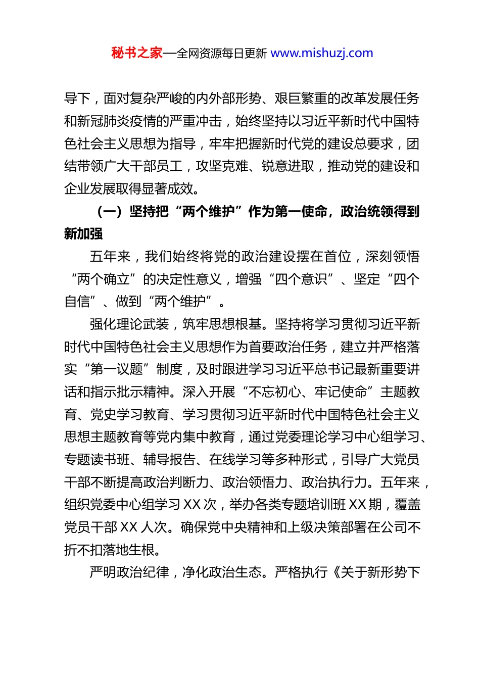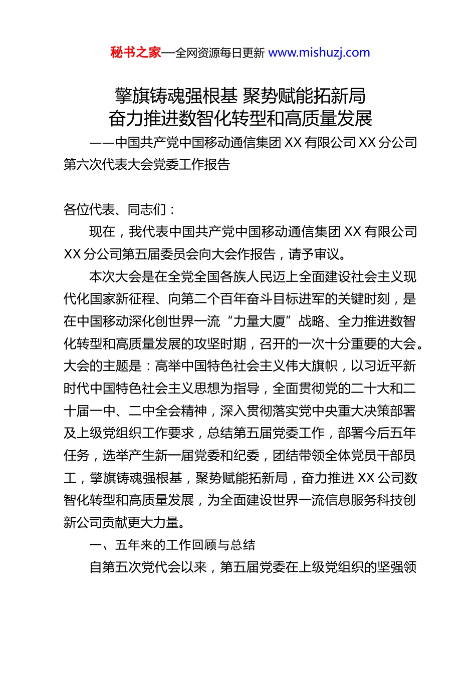 秘书之家—全网资源每日更新 www.mishuzj.com擎旗铸魂强根基 聚势赋能拓新局奋力推进数智化转型和高质量发展——中国共产党中国移动通信集团 XX 有限公司 XX 分公司第六次代表大会党委工作报告各位代表、同志们:现在,我代表中国共产党中国移动通信集团 XX 有限公司XX 分公司第五届委员会向大会作报告,请予审议。本次大会是在全党全国各族人民迈上全面建设社会主义现代化国家新征程、向第二个百年奋斗目标进军的关键时刻,是在中国移动深化创世界一流“力量大厦”战略、全力推进数智化转型和高质量发展的攻坚时期,召开的一次十分重要的大会。大会的主题是:高举中国特色社会主义伟大旗帜,以习近平新时代中国特色社会主义思想为指导,全面贯彻党的二十大和二十届一中、二中全会精神,深入贯彻落实党中央重大决策部署及上级党组织工作要求,总结第五届党委工作,部署今后五年任务,选举产生新一届党委和纪委,团结带领全体党员干部员工,擎旗铸魂强根基,聚势赋能拓新局,奋力推进 XX 公司数智化转型和高质量发展,为全面建设世界一流信息服务科技创新公司贡献更大力量。一、五年来的工作回顾与总结自第五次党代会以来,第五届党委在上级党组织的坚强领秘书之家—全网资源每日更新 www.mishuzj.com导下,面对复杂严峻的内外部形势、艰巨繁重的改革发展任务和新冠肺炎疫情的严重冲击,始终坚持以习近平新时代中国特色社会主义思想为指导,牢牢把握新时代党的建设总要求,团结带领广大干部员工,攻坚克难、锐意进取,推动党的建设和企业发展取得显著成效。(一)坚持把“两个维护”作为第一使命,政治统领得到新加强五年来,我们始终将党的政治建设摆在首位,深刻领悟“两个确立”的决定性意义,增强“四个意识”、坚定“四个自信”、做到“两个维护”。强化理论武装,筑牢思想根基。坚持将学习贯彻习近平新时代中国特色社会主义思想作为首要政治任务,建立并严格落实“第一议题”制度,及时跟进学习习近平总书记最新重要讲话和指示批示精神。深入开展“不忘初心、牢记使命”主题教育、党史学习教育、学习贯彻习近平新时代中国特色社会主义思想主题教育等党内集中教育,通过党委理论学习中心组学习、专题读书班、辅导报告、在线学习等多种形式,引导广大党员干部不断提高政治判断力、政治领悟力、政治执行力。五年来,组织党委中心组学习 XX 次,举办各类专题培训班 XX 期,覆盖党员干部 XX 人次。确保党中央精神和上级决策部署在公司不折不扣落地生根。严明政治纪律,净化政治生态。严格执行《关于新形势下秘书之家—全网资源每日更新 www.mishuzj.com党内政治生活的若干准则》,认真落实民主集中制,不断提高党委议事决策的科学化、民主化、规范化水平。严肃党内政治生活,高质量开好民主生活会和组织生活会,扎实开展批评与自我批评。加强党内政治文化建设,弘扬忠诚老实、公道正派、实事求是、清正廉洁等价值观,营造了风清气正的良好政治生态。确保政令畅通,狠抓贯彻落实。建立健全党中央重大决策部署和上级党组织工作要求落实机制,制定任务清单、责任清单,加强督查督办和跟踪问效,确保各项指令在公司上下贯通、执行有力。特别是在疫情防控、通信保障、重大活动支撑、乡村振兴等急难险重任务中,公司党委闻令而动,广大党员冲锋在前,充分展现了央企的政治担当。(二)坚持把高质量发展作为第一要务,企业发展迈上新台阶五年来,我们完整、准确、全面贯彻新发展理念,积极服务和融入新发展格局,紧紧抓住数字经济时代机遇,推动公司发展实现了量的合理增长和质的稳步提升。经营业绩持续向好。面对市场饱和、竞争加剧等挑战,公司保持了稳健的发展态势。截至 2023 年底,公司营业收入达到 XX 亿元,年均增长率 XX%;净利润达到 XX 亿元,年均增长率 XX。客户规模稳步扩大,移动客户净增 XX 万户,5G 套餐客户达到 XX 万户,家庭宽带客户达到 XX 万户,政企客户重秘书之家—全网资源每日更新 www.mishuzj.com要性显著提升。数智化转型成效显著。坚定实施“5G+”计划,累计建成5G 基站 XX 个,实现 XX 区域连续覆盖和重点场景深度覆...
