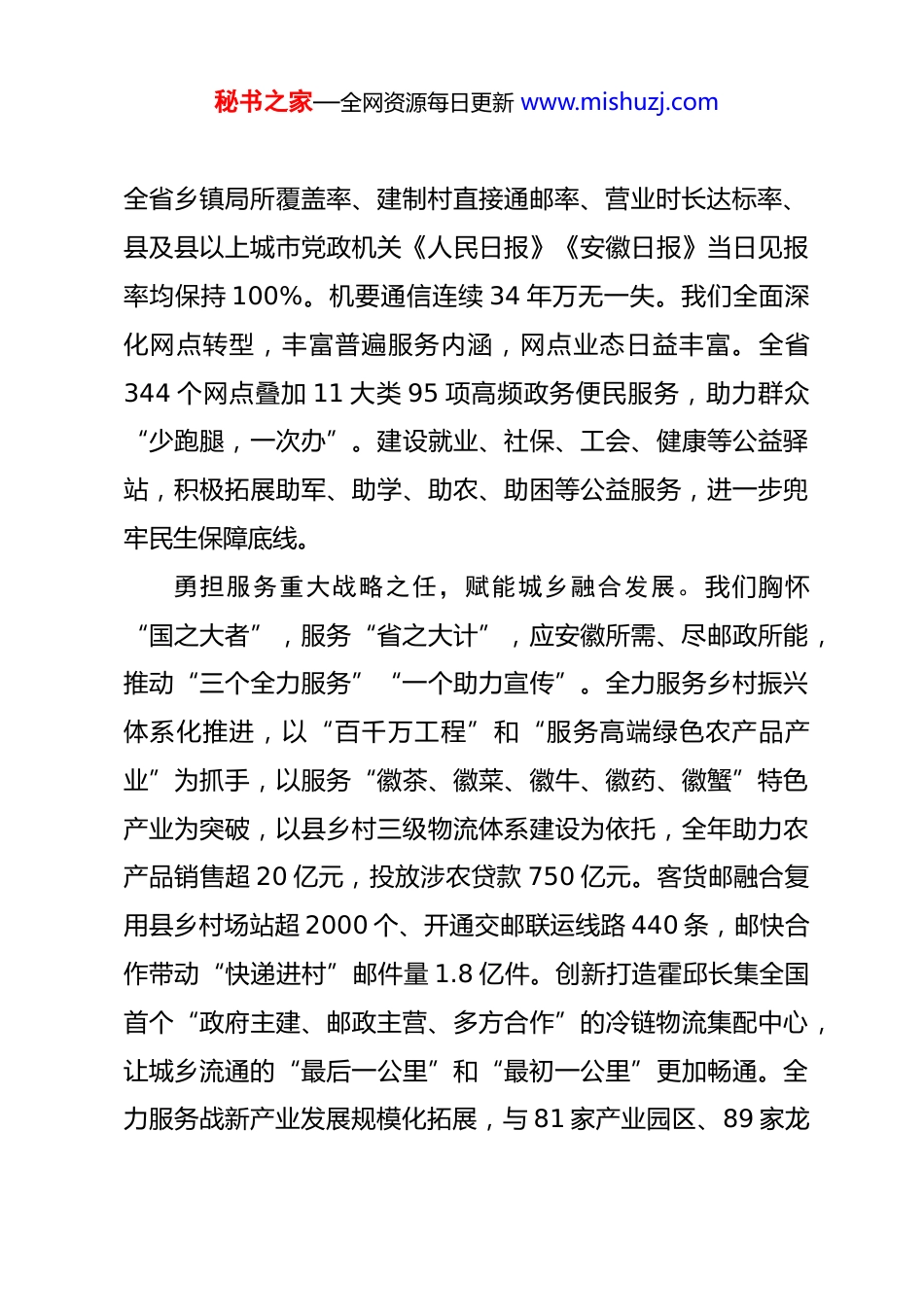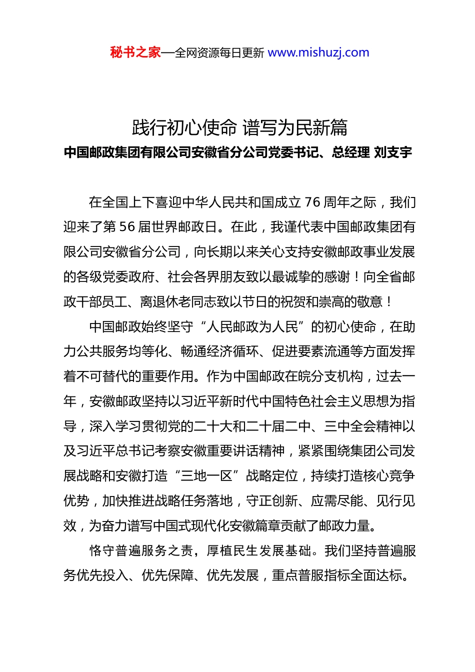 秘书之家—全网资源每日更新 www.mishuzj.com践行初心使命 谱写为民新篇中国邮政集团有限公司安徽省分公司党委书记、总经理 刘支宇 在全国上下喜迎中华人民共和国成立 76 周年之际,我们迎来了第 56 届世界邮政日。在此,我谨代表中国邮政集团有限公司安徽省分公司,向长期以来关心支持安徽邮政事业发展的各级党委政府、社会各界朋友致以最诚挚的感谢!向全省邮政干部员工、离退休老同志致以节日的祝贺和崇高的敬意!中国邮政始终坚守“人民邮政为人民”的初心使命,在助力公共服务均等化、畅通经济循环、促进要素流通等方面发挥着不可替代的重要作用。作为中国邮政在皖分支机构,过去一年,安徽邮政坚持以习近平新时代中国特色社会主义思想为指导,深入学习贯彻党的二十大和二十届二中、三中全会精神以及习近平总书记考察安徽重要讲话精神,紧紧围绕集团公司发展战略和安徽打造“三地一区”战略定位,持续打造核心竞争优势,加快推进战略任务落地,守正创新、应需尽能、见行见效,为奋力谱写中国式现代化安徽篇章贡献了邮政力量。恪守普遍服务之责,厚植民生发展基础。我们坚持普遍服务优先投入、优先保障、优先发展,重点普服指标全面达标。秘书之家—全网资源每日更新 www.mishuzj.com全省乡镇局所覆盖率、建制村直接通邮率、营业时长达标率、县及县以上城市党政机关《人民日报》《安徽日报》当日见报率均保持 100%。机要通信连续 34 年万无一失。我们全面深化网点转型,丰富普遍服务内涵,网点业态日益丰富。全省344 个网点叠加 11 大类 95 项高频政务便民服务,助力群众“少跑腿,一次办”。建设就业、社保、工会、健康等公益驿站,积极拓展助军、助学、助农、助困等公益服务,进一步兜牢民生保障底线。勇担服务重大战略之任,赋能城乡融合发展。我们胸怀“国之大者”,服务“省之大计”,应安徽所需、尽邮政所能,推动“三个全力服务”“一个助力宣传”。全力服务乡村振兴体系化推进,以“百千万工程”和“服务高端绿色农产品产业”为抓手,以服务“徽茶、徽菜、徽牛、徽药、徽蟹”特色产业为突破,以县乡村三级物流体系建设为依托,全年助力农产品销售超 20 亿元,投放涉农贷款 750 亿元。客货邮融合复用县乡村场站超 2000 个、开通交邮联运线路 440 条,邮快合作带动“快递进村”邮件量 1.8 亿件。创新打造霍邱长集全国首个“政府主建、邮政主营、多方合作”的冷链物流集配中心,让城乡流通的“最后一公里”和“最初一公里”更加畅通。全力服务战新产业发展规模化拓展,与 81 家产业园区、89 家龙秘书之家—全网资源每日更新 www.mishuzj.com头企业开展战略合作,加快建设战新综合服务中心,提供“金融信贷+物流寄递+电子商务+特色文化”全链式邮政服务。优化长三角区域干线网络布局,打造长三角城市“次晨达”“次日递”等专线,助力长三角邮政寄递“大提速”。全力服务构建“双循环”格局专业化升级,12 个项目纳入县域商业体系规划,承接政府消费券补贴发放 2000 多万元。构建“邮商货仓”国际产品体系,覆盖全球 200 多个国家和地区;服务外贸企业 2187 家,助推 100 多家传统外贸企业转型,培育 500 多家跨境电商企业,强力赋能皖货出海。助力宣传“徽风皖韵”品牌化运作,促进“邮文化”“游文化”“徽文化”有机融合,开发地方题材文创产品 300 余款,初步构建服务皖南国际文化旅游示范区工作体系,推进 40 多个主题邮局提档升级。成功举办《巢湖》邮票发行和第 44 届全国佳邮评选活动,于方寸之间尽显“徽风皖韵”魅力。服务会展赛博节活动近百场,以图书巡展、图书捐赠等形式助推“书香安徽”建设。激扬改革创新之能,构建现代邮政服务体系。我们坚持把创新作为第一动力,推动服务模式、技术应用、管理机制全方位升级,加快培育新质生产力,跑出“智慧邮政”加速度。自主研发服务乡村振兴管理系统、寄递“次晨达”平台、金融智能报表等系统,数字邮政建设迈出新步伐。依托数字寄递科技秘书之家—全网资源每日更新 www.mishuzj.com创新基地,打造合肥邮区中心全感知、全可视、全智能的数字化处理中心。先行先试...