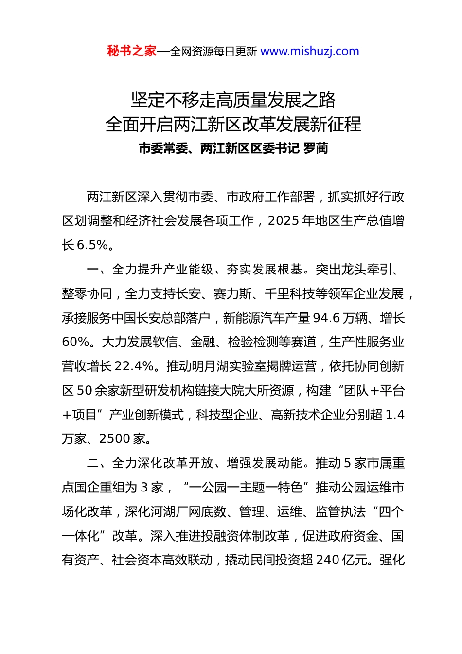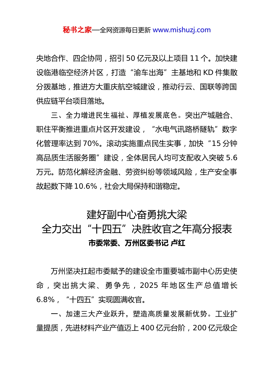 秘书之家—全网资源每日更新 www.mishuzj.com坚定不移走高质量发展之路全面开启两江新区改革发展新征程市委常委、两江新区区委书记 罗蔺两江新区深入贯彻市委、市政府工作部署,抓实抓好行政区划调整和经济社会发展各项工作,2025 年地区生产总值增长 6.5%。一、全力提升产业能级、夯实发展根基。突出龙头牵引、整零协同,全力支持长安、赛力斯、千里科技等领军企业发展,承接服务中国长安总部落户,新能源汽车产量 94.6 万辆、增长60%。大力发展软信、金融、检验检测等赛道,生产性服务业营收增长 22.4%。推动明月湖实验室揭牌运营,依托协同创新区 50 余家新型研发机构链接大院大所资源,构建“团队+平台+项目”产业创新模式,科技型企业、高新技术企业分别超 1.4万家、2500 家。二、全力深化改革开放、增强发展动能。推动 5 家市属重点国企重组为 3 家,“一公园一主题一特色”推动公园运维市场化改革,深化河湖厂网底数、管理、运维、监管执法“四个一体化”改革。深入推进投融资体制改革,促进政府资金、国有资产、社会资本高效联动,撬动民间投资超 240 亿元。强化秘书之家—全网资源每日更新 www.mishuzj.com央地合作、四企协同,招引 50 亿元及以上项目 11 个。加快建设临港临空经济片区,打造“渝车出海”主基地和 KD 件集散分拨基地,推进方大重庆航空城建设,推动行云、国联等跨国供应链平台项目落地。三、全力增进民生福祉、厚植发展底色。突出产城融合、职住平衡推进重点片区开发建设,“水电气讯路桥隧轨”数字化管理率达到 70%。滚动实施重点民生实事,加快“15 分钟高品质生活服务圈”建设,全体居民人均可支配收入突破 5.6万元。防范化解经济金融、劳资纠纷等领域风险,生产安全事故起数下降 10.6%,社会大局保持和谐稳定。建好副中心奋勇挑大梁全力交出“十四五”决胜收官之年高分报表市委常委、万州区委书记 卢红万州坚决扛起市委赋予的建设全市重要城市副中心历史使命 , 突 出 挑 大 梁 、 勇 争 先 , 2025 年 地 区 生 产 总 值 增 长6.8%,“十四五”实现圆满收官。一、加速三大产业跃升,塑造高质量发展新优势。工业扩量提质,先进材料产业产值迈上 400 亿元台阶,200 亿元级企秘书之家—全网资源每日更新 www.mishuzj.com业实现“零”的突破,规上工业总产值、工业税收较 2020 年翻一番。服务业拓展升级,金融机构突破 100 家,培育首家4A 级物流企业,生产性服务业增加值占比提升至 45.6%。农业向强迈进,规上食农加工业产值增长 20%。二、释放三大增量潜力,拓宽高质量发展新空间。激活消费主引擎,一体推进文商旅体融合发展,接待游客数量、游客总花费分别增长 10.1%、19.4%,高笋塘商圈跃升为渝东北首个百亿级商圈。筑牢投资压舱石,成渝地区双城经济圈、市级重大项目投资完成率分别达 165%、152%,国能万州电厂二期创下两项全国火电项目最快纪录。跑出招商加速度,健全“尖兵连+全员出击”招商引资体系,签约 50 亿元级项目 1 个、10 亿元至 50 亿元项目 10 个,到位资金增长 10.5%。三、强化三大关键支撑,激发高质量发展新动能。放大改革牵引力,数字重庆基本能力不断提升,区属国企利润总额增长 74.2%,迭代实施打造全市一流营商环境十大专项行动,民营经济增加值占地区生产总值比重提升至 63%。增强开放辐射力,“一城一港”改革取得重大进展,新田港货物吞吐量增长12%,进出口总额较 2020 年增长 1.6 倍。提升创新驱动力,提前 2 年完成“双倍增”目标,3 届重庆三峡人才节带动渝东北区县引进各类人才 2.5 万名。秘书之家—全网资源每日更新 www.mishuzj.com锚定目标加快追赶推动中心城市建设向上向好黔江区委书记 罗成2025 年,黔江区 GDP 增长 6%,较上年提升 12 位;一产、二产、三产增速,分别较上年提升 12 位、13 位、9 位。一、大抓项目投资“胜负手”,经济触底回升、稳健运行投资攻坚成效明显。区级领导、部门一把手领衔 135 个重点项目,固投增长 20.3%。营商环境持续优化。打造“黔诚无忧”营 商 环 境 品 牌 。 招 ...
