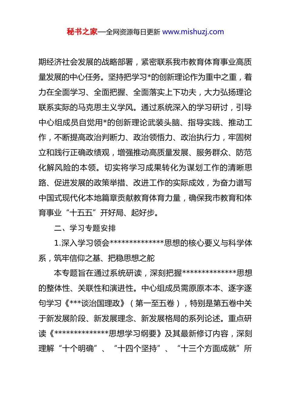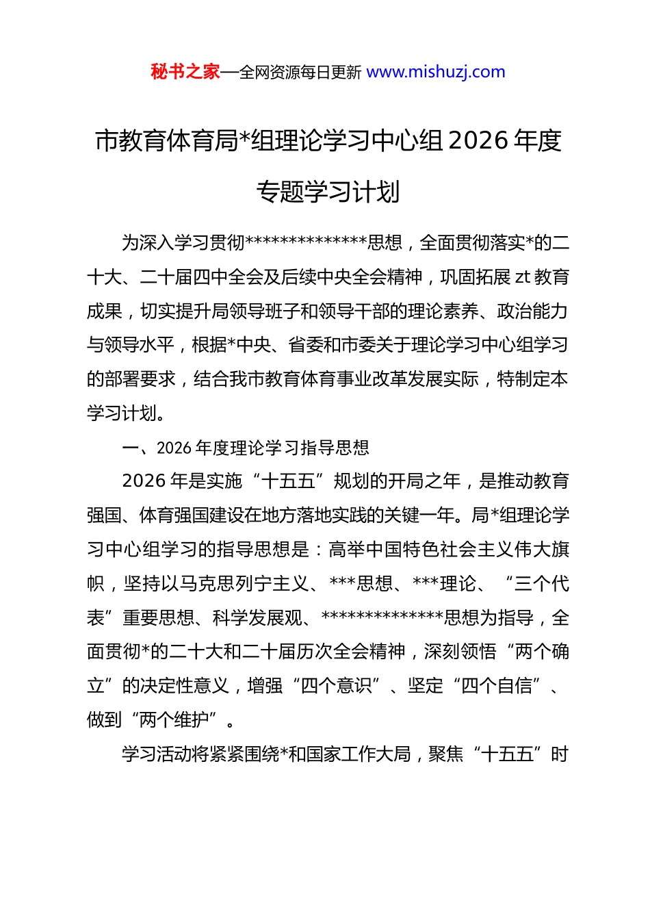 秘书之家—全网资源每日更新 www.mishuzj.com市教育体育局*组理论学习中心组 2026 年度专题学习计划为深入学习贯彻**************思想,全面贯彻落实*的二十大、二十届四中全会及后续中央全会精神,巩固拓展 zt 教育成果,切实提升局领导班子和领导干部的理论素养、政治能力与领导水平,根据*中央、省委和市委关于理论学习中心组学习的部署要求,结合我市教育体育事业改革发展实际,特制定本学习计划。一、2026 年度理论学习指导思想2026 年是实施“十五五”规划的开局之年,是推动教育强国、体育强国建设在地方落地实践的关键一年。局*组理论学习中心组学习的指导思想是:高举中国特色社会主义伟大旗帜,坚持以马克思列宁主义、***思想、***理论、“三个代表”重要思想、科学发展观、**************思想为指导,全面贯彻*的二十大和二十届历次全会精神,深刻领悟“两个确立”的决定性意义,增强“四个意识”、坚定“四个自信”、做到“两个维护”。学习活动将紧紧围绕*和国家工作大局,聚焦“十五五”时秘书之家—全网资源每日更新 www.mishuzj.com期经济社会发展的战略部署,紧密联系我市教育体育事业高质量发展的中心任务。坚持把学习*的创新理论作为重中之重,着力在全面学习、全面把握、全面落实上下功夫,大力弘扬理论联系实际的马克思主义学风。通过系统深入的学习研讨,引导中心组成员自觉用*的创新理论武装头脑、指导实践、推动工作,不断提高政治判断力、政治领悟力、政治执行力,牢固树立和践行正确政绩观,增强推动高质量发展、服务群众、防范化解风险的本领。切实将学习成果转化为谋划工作的清晰思路、促进发展的政策举措、改进工作的实际成效,为奋力谱写中国式现代化本地篇章贡献教育体育力量,确保我市教育和体育事业“十五五”开好局、起好步。二、学习专题安排1.深入学习领会**************思想的核心要义与科学体系,筑牢信仰之基、把稳思想之舵本专题旨在通过系统研读,深刻把握**************思想的整体性、关联性和演进性。中心组成员需原原本本、逐字逐句学习《***谈治国理政》(第一至五卷),特别是第五卷中关于新发展阶段、新发展理念、新发展格局的系列论述。重点研读《**************思想学习纲要》及其最新修订内容,深刻理解“十个明确”、“十四个坚持”、“十三个方面成就”所秘书之家—全网资源每日更新 www.mishuzj.com涵盖的主要内容。要深入领会这一思想的世界观、方法论和贯穿其中的立场观点方法,特别是“六个必须坚持”的深刻内涵与实践要求,做到知其言更知其义、知其然更知其所以然。要紧密结合教育体育工作实际,思考如何运用这一科学体系蕴含的立场观点方法,破解我市学前教育普惠性资源供给、义务教育优质均衡发展、普通高中特色多样化发展、职业教育产教融合、高等教育内涵提升以及全民健身公共服务体系建设等深层次矛盾。通过学习,持续增进对*的创新理论的政治认同、思想认同、理论认同、情感认同,自觉将其作为察大势、应变局、观未来的“望远镜”和“显微镜”,作为研究谋划全市教育体育“十五五”规划、推进各项改革发展的“金钥匙”,确保事业发展始终沿着正确政治方向前进。2.深入学习领会******关于教育强国建设的重要论述,扛牢为*育人、为国育才的使命担当本专题聚焦教育这一国之大计、*之大计,中心组成员需反复研读******《加快建设教育强国》等重要文章和讲话精神。深刻理解教育强国建设的战略定位、核心要义、重点任务和实践路径,明确教育在全面建设社会主义现代化国家中的基础性、战略性支撑作用。学习要紧密对接我市教育发展现状,深入思考如何将“培养什么人、怎样培养人、为谁培养人”这一秘书之家—全网资源每日更新 www.mishuzj.com根本问题贯穿于立德树人全过程。要围绕发展素质教育、促进教育公平、深化教育领域综合改革、增强教育服务创新发展能力等重大议题开展研讨。具体而言,需结合基础教育科、职业教育与成人教育科、高等教育职业教育与终身教育科、民办和学前教育科等内设机构职能,探讨如何系统性优化教育资源布局,健全德智体美劳全面培养的教育体系;如何深化课程教学改革,扭转不科学的...