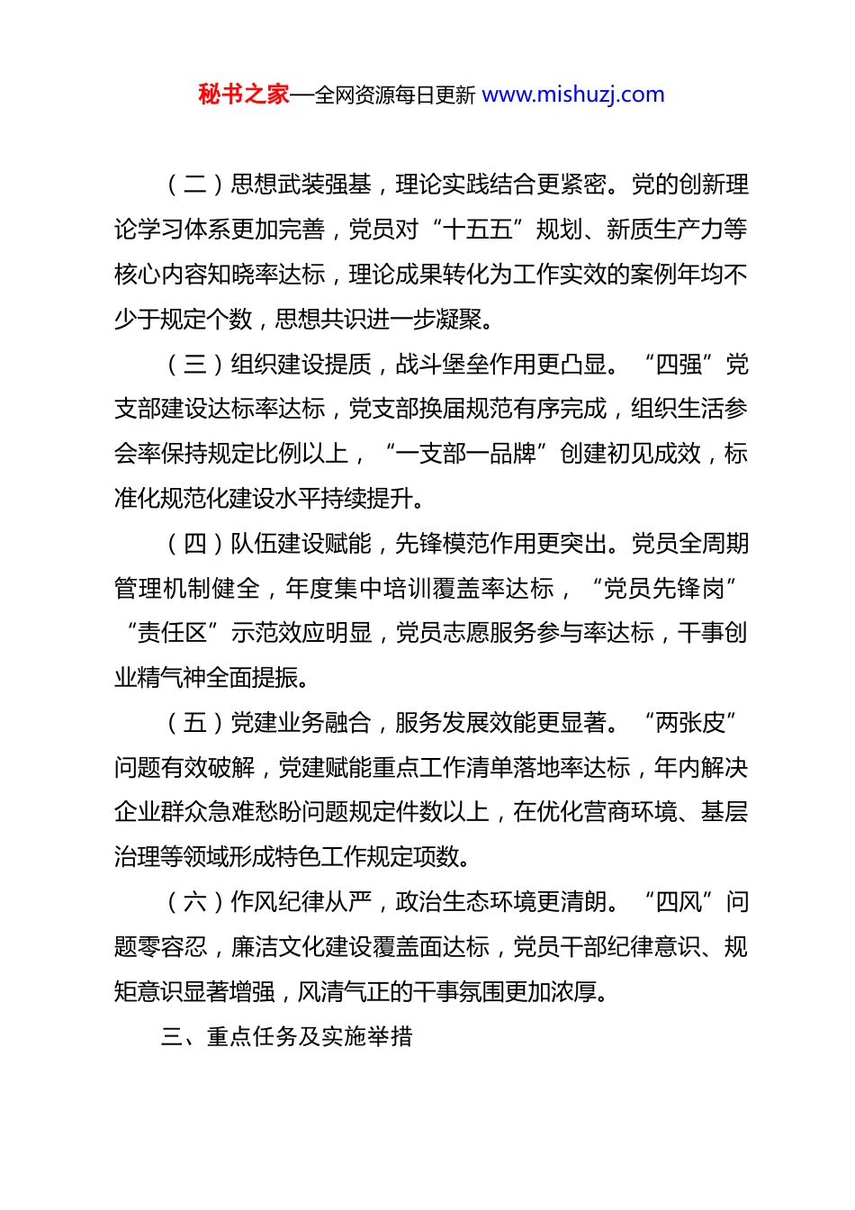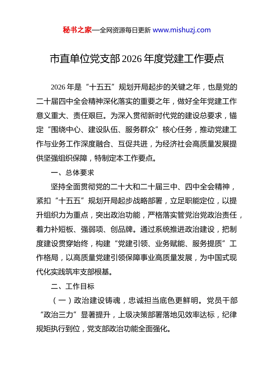 秘书之家—全网资源每日更新 www.mishuzj.com市直单位党支部 2026 年度党建工作要点 2026 年是“十五五”规划开局起步的关键之年,也是党的二十届四中全会精神深化落实的重要之年,做好全年党建工作意义重大、责任艰巨。为深入贯彻新时代党的建设总要求,锚定“围绕中心、建设队伍、服务群众”核心任务,推动党建工作与业务工作深度融合、互促共进,为经济社会高质量发展提供坚强组织保障,特制定本工作要点。一、总体要求坚持全面贯彻党的二十大和二十届三中、四中全会精神,紧扣“十五五”规划开局起步战略部署,立足职能定位,以提升组织力为重点,突出政治功能,严格落实管党治党政治责任,着力补短板、强弱项、创品牌。通过系统推进政治建设,把制度建设贯穿始终,构建“党建引领、业务赋能、服务提质”工作格局,以高质量党建引领保障事业高质量发展,为中国式现代化实践筑牢支部根基。二、工作目标(一)政治建设铸魂,忠诚担当底色更鲜明。党员干部“政治三力”显著提升,上级决策部署落地见效率达标,纪律规矩执行到位,党支部政治功能全面强化。秘书之家—全网资源每日更新 www.mishuzj.com(二)思想武装强基,理论实践结合更紧密。党的创新理论学习体系更加完善,党员对“十五五”规划、新质生产力等核心内容知晓率达标,理论成果转化为工作实效的案例年均不少于规定个数,思想共识进一步凝聚。(三)组织建设提质,战斗堡垒作用更凸显。“四强”党支部建设达标率达标,党支部换届规范有序完成,组织生活参会率保持规定比例以上,“一支部一品牌”创建初见成效,标准化规范化建设水平持续提升。(四)队伍建设赋能,先锋模范作用更突出。党员全周期管理机制健全,年度集中培训覆盖率达标,“党员先锋岗”“责任区”示范效应明显,党员志愿服务参与率达标,干事创业精气神全面提振。(五)党建业务融合,服务发展效能更显著。“两张皮”问题有效破解,党建赋能重点工作清单落地率达标,年内解决企业群众急难愁盼问题规定件数以上,在优化营商环境、基层治理等领域形成特色工作规定项数。(六)作风纪律从严,政治生态环境更清朗。“四风”问题零容忍,廉洁文化建设覆盖面达标,党员干部纪律意识、规矩意识显著增强,风清气正的干事氛围更加浓厚。三、重点任务及实施举措秘书之家—全网资源每日更新 www.mishuzj.com(一)锚定政治建设首位度,筑牢对党忠诚根基1.深化政治机关意识培育。把讲政治贯穿党建工作全过程,结合典型案例开展对党忠诚警示教育,引导党员干部始终在政治立场、政治方向、政治原则上与党中央保持高度一致。2.严格落实“第一议题”制度。建立“即时传达+专题研讨+落地督办”闭环机制,第一时间学习宣传贯彻,每季度至少开展规定次数党的二十届四中全会精神专题学习,确保入脑入心。3.规范换届期间政治纪律。围绕领导班子换届工作,专题组织学习《中国共产党基层组织选举工作条例》,开展“换届纪律警示教育月”活动,强化“十严禁”纪律要求,严格执行重大事项请示报告制度,确保换届平稳有序。4.健全决策部署落实机制。建立上级重大决策部署“清单化分解、项目化推进、常态化督查”机制,每季度开展规定次数落实情况“回头看”,对滞后任务挂牌督办,确保政令畅通、执行有力。(二)深化思想理论武装,凝聚奋进精神力量1.构建三级联动学习体系。优化“党组领学+支部导学+党员践学”机制,每月开展规定次数支部集中学习,每季度邀请专家开展规定次数专题辅导,每半年组织规定次数“十五五”秘书之家—全网资源每日更新 www.mishuzj.com规划专题研讨,推动理论学习走深走实。2.强化青年理论武装。建强青年理论学习小组,实施“青马工程”培养计划,开展“导师带徒”“红色研学”“政策宣讲进基层”等活动,每季度组织规定次数青年党员实践锻炼,提升理论应用能力。3.推动学用转化落地。建立“学习—调研—实践”转化台账,每名党员结合岗位制定年度学用计划,年内形成不少于规定篇数高质量调研报告;支部书记带头讲授专题党课规定次数以上,党员干部开展业务分享、心得交流不少于规定次数。4.加强思想动态研判。牢牢掌握意识形态工作主动权,...