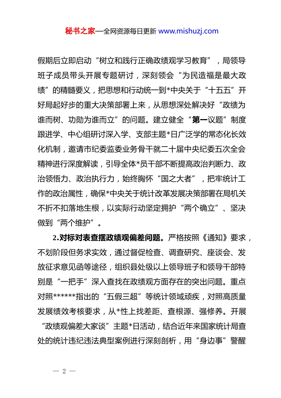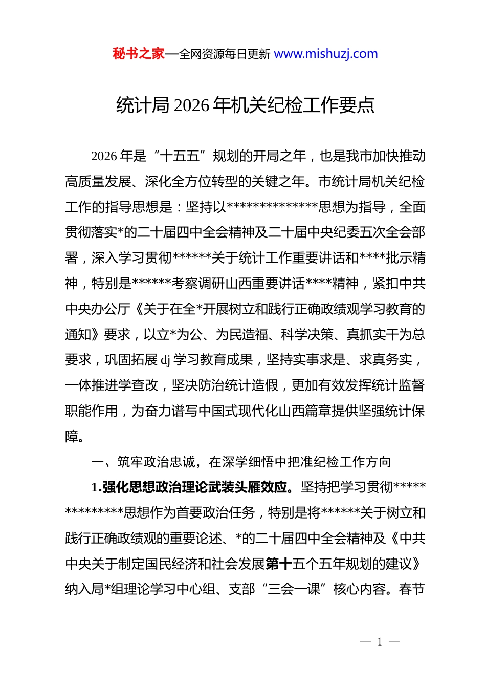 秘书之家—全网资源每日更新 www.mishuzj.com统计局 2026 年机关纪检工作要点2026 年是“十五五”规划的开局之年,也是我市加快推动高质量发展、深化全方位转型的关键之年。市统计局机关纪检工作的指导思想是:坚持以**************思想为指导,全面贯彻落实*的二十届四中全会精神及二十届中央纪委五次全会部署,深入学习贯彻******关于统计工作重要讲话和****批示精神,特别是******考察调研山西重要讲话****精神,紧扣中共中央办公厅《关于在全*开展树立和践行正确政绩观学习教育的通知》要求,以立*为公、为民造福、科学决策、真抓实干为总要求,巩固拓展 dj 学习教育成果,坚持实事求是、求真务实,一体推进学查改,坚决防治统计造假,更加有效发挥统计监督职能作用,为奋力谱写中国式现代化山西篇章提供坚强统计保障。一、筑牢政治忠诚,在深学细悟中把准纪检工作方向1.强化思想政治理论武装头雁效应。坚持把学习贯彻**************思想作为首要政治任务,特别是将******关于树立和践行正确政绩观的重要论述、*的二十届四中全会精神及《中共中央关于制定国民经济和社会发展第十五个五年规划的建议》纳入局*组理论学习中心组、支部“三会一课”核心内容。春节— 1 —秘书之家—全网资源每日更新 www.mishuzj.com假期后立即启动“树立和践行正确政绩观学习教育”,局领导班子成员带头开展专题研讨,深刻领会“为民造福是最大政绩”的精髓要义,把思想和行动统一到*中央关于“十五五”开好局起好步的重大决策部署上来,从思想深处解决好“政绩为谁而树、功勋为谁而立”的问题。建立健全“第一议题”制度跟进学、中心组研讨深入学、支部主题*日广泛学的常态化长效化机制,邀请市纪委监委业务骨干就二十届中央纪委五次全会精神进行深度解读,引导全体*员干部不断提高政治判断力、政治领悟力、政治执行力,始终胸怀“国之大者”,把牢统计工作的政治属性,确保*中央关于统计改革发展决策部署在局机关不折不扣落地生根,以实际行动坚定拥护“两个确立”、坚决做到“两个维护”。2.对标对表查摆政绩观偏差问题。严格按照《通知》要求,不划阶段但务求实效,通过督促检查、调查研究、座谈会、发放征求意见函等途径,组织县处级以上领导班子和领导干部特别是“一把手”深入查找在政绩观方面存在的突出问题。重点对照******指出的“五假三超”等统计领域顽疾,对照高质量发展绩效考核要求,从*性上找差距、查根源、强修养。开展“政绩观偏差大家谈”主题*日活动,结合近年来国家统计局查处的统计违纪违法典型案例进行深刻剖析,用“身边事”警醒— 2 —秘书之家—全网资源每日更新 www.mishuzj.com“身边人”,引导*员干部深刻认识统计造假的极端危害性,把纠治政绩观偏差作为*性修养的“必修课”。建立领导班子和领导干部政绩观问题清单、整改清单、责任清单,实行台账式管理、项目化推进,确保查摆出的问题件件有回音、事事有着落,真正做到触及灵魂、真查实改。3.推动政治监督具体化精准化常态化。紧紧围绕******关于统计工作的重要讲话和****批示精神在局机关的贯彻落实情况,围绕*中央及省委、市委关于经济社会发展重大决策部署的统计监测任务,确立政治监督重点事项。聚焦“十五五”规划编制实施过程中统计数据的支撑作用、高质量发展综合绩效评价中统计数据的客观公正性,开展嵌入式监督、跟进式监督。将防范和惩治统计造假、弄虚作假作为政治监督的重中之重,监督检查相关处室是否将*中央关于统计工作的决策部署落实到数据采集、审核、评估的全过程。建立健全与市委巡察机构的协调协作机制,做好巡察整改“回头看”,对省委巡视反馈问题中涉及统计工作的整改情况进行再监督、再检视,确保整改到位、不留死角,推动政治监督由具体化向保障制度执行、促进完善发展纵深拓展。4.严明政治纪律和政治规矩寸步不让。把坚决做到“两个维护”作为首要政治纪律,教育*员干部在涉及统计数据发布、— 3 —秘书之家—全网资源每日更新 www.mishuzj.com重大国情国力调查等工作中,始终站稳政治立场、把准政治方向。严格执行重大事项请示报告制度,对统计工作中发现的重大违纪违...