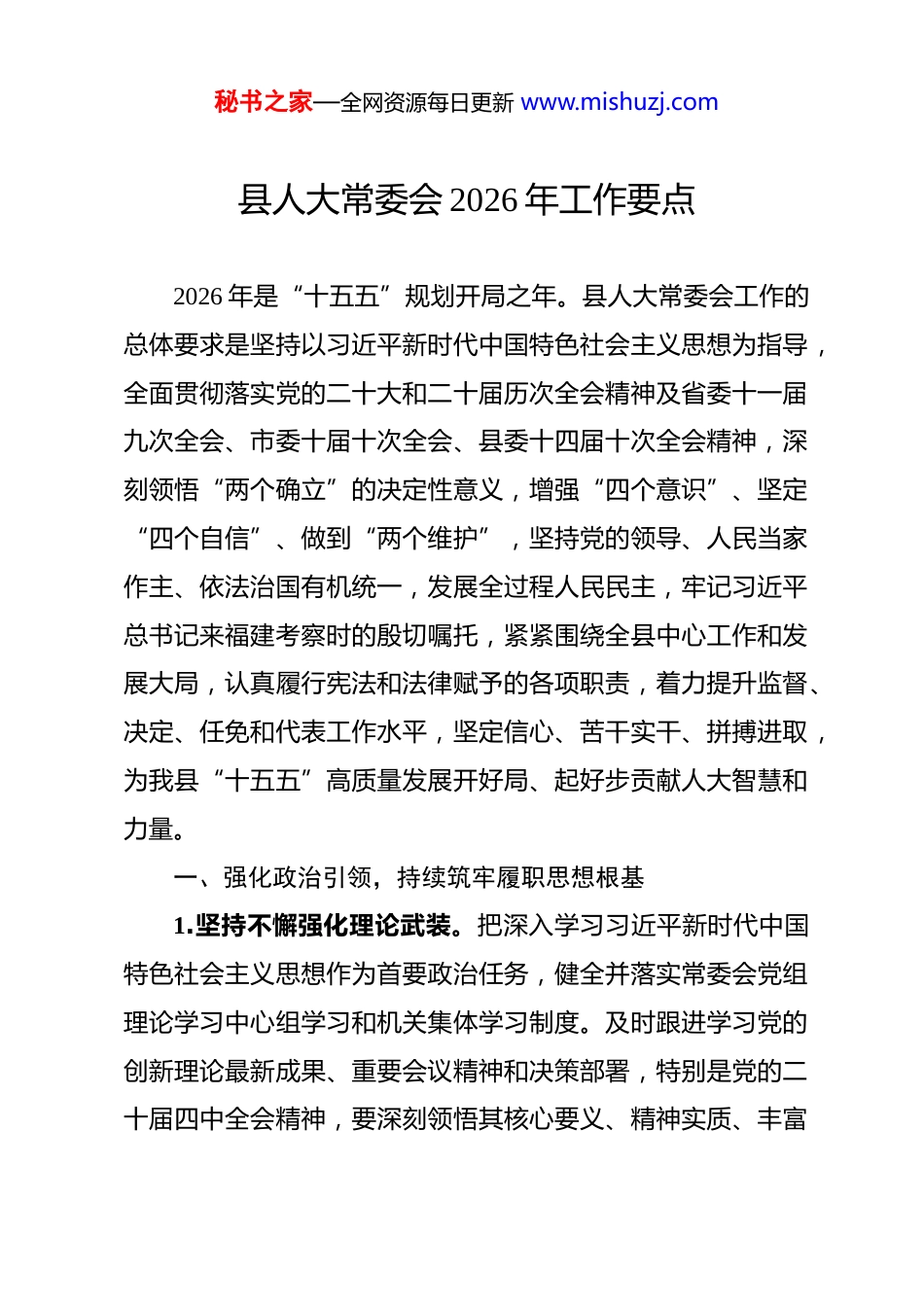 秘书之家—全网资源每日更新 www.mishuzj.com县人大常委会 2026 年工作要点 2026 年是“十五五”规划开局之年。县人大常委会工作的总体要求是坚持以习近平新时代中国特色社会主义思想为指导,全面贯彻落实党的二十大和二十届历次全会精神及省委十一届九次全会、市委十届十次全会、县委十四届十次全会精神,深刻领悟“两个确立”的决定性意义,增强“四个意识”、坚定“四个自信”、做到“两个维护”,坚持党的领导、人民当家作主、依法治国有机统一,发展全过程人民民主,牢记习近平总书记来福建考察时的殷切嘱托,紧紧围绕全县中心工作和发展大局,认真履行宪法和法律赋予的各项职责,着力提升监督、决定、任免和代表工作水平,坚定信心、苦干实干、拼搏进取,为我县“十五五”高质量发展开好局、起好步贡献人大智慧和力量。一、强化政治引领,持续筑牢履职思想根基1.坚持不懈强化理论武装。把深入学习习近平新时代中国特色社会主义思想作为首要政治任务,健全并落实常委会党组理论学习中心组学习和机关集体学习制度。及时跟进学习党的创新理论最新成果、重要会议精神和决策部署,特别是党的二十届四中全会精神,要深刻领悟其核心要义、精神实质、丰富秘书之家—全网资源每日更新 www.mishuzj.com内涵和实践要求。重点学习关于坚持和完善人民代表大会制度的重要思想、关于发展全过程人民民主的重大理念,努力掌握贯穿其中的立场观点方法,自觉用以武装头脑、指导实践、推动工作。2.始终坚持党的全面领导。自觉把党的领导贯穿于人大工作全过程、各方面。严格执行重大事项请示报告制度,凡属人大工作中的重大问题、重要事项、重要情况,及时主动向县委请示报告,确保县委的决策部署在人大得到不折不扣的贯彻执行。充分发挥常委会党组把方向、管大局、保落实的领导作用,确保常委会各项工作都在党的领导下进行。依法做好县乡两级人民代表大会换届选举的相关工作,确保换届选举工作依法有序、圆满完成3.持之以恒服务中心大局。聚焦县委关于经济社会发展、深化改革、乡村振兴、生态文明建设、民生改善等重大部署,找准人大工作的切入点和着力点,通过依法有效履职,推动县委决策部署落地见效。坚持在党的领导下依法行使监督权、决定权、任免权,确保通过人大法定程序实现党的主张和人民意志的高度统一,把制度优势更好转化为治理效能。在县本级首次开展民生实事项目人大票决工作,有序做好项目票决、项目监督等事项,着力推动民生项目更好转化为民生福祉。秘书之家—全网资源每日更新 www.mishuzj.com二、增强监督实效,全力服务高质量发展大局4.深化法律法规实施监督。加强规范性文件备案审查,听取和审议 2025 年规范性文件备案审查工作情况的报告。听取“八五”普法决议落实、道路交通安全管理等情况的报告,开展《中华人民共和国归侨侨眷保护法》及《*省华侨权益保护条例》实施情况执法检查,持续开展法官、检察官履职评议工作,提升全民法治素养,切实保障人民群众的合法权益。5.深化财政经济工作监督。认真开展计划、预决算监督,听取和审议政府债务管理、国有资产管理和审计等情况的报告,积极配合省、市人大常委会开展《中华人民共和国安全生产法》和《*省安全生产条例》实施情况三级联动执法检查,调研高标准农田和农业社会化服务体系建设情况,助力我县经济社会高质量发展。6.深化民生保障领域监督。听取和审议新就业形态劳动者权益保障、公立医院高质量发展、燃气运行等情况的报告,听取社会救助、居民小区物业管理、长征国家文化公园建设等工作情况的报告,开展《中华人民共和国食品安全法》和《*省食品安全条例》实施情况执法检查,开展 2026 年为民办实事项目建设情况视察,切实增进民生福祉。7.深化生态环境保护监督。牢固树立和践行绿水青山就是秘书之家—全网资源每日更新 www.mishuzj.com金山银山的理念,依法加强对生态环境保护工作的监督。听取和审议 2026 年环境保护、笋竹产业发展和松材线虫病防治等工作情况的报告,督促有关部门落实生态环境保护责任,推动绿色发展。三、优化服务保障,不断深化全过程人民民主实践8.优化履职平台建设。持续完善*...