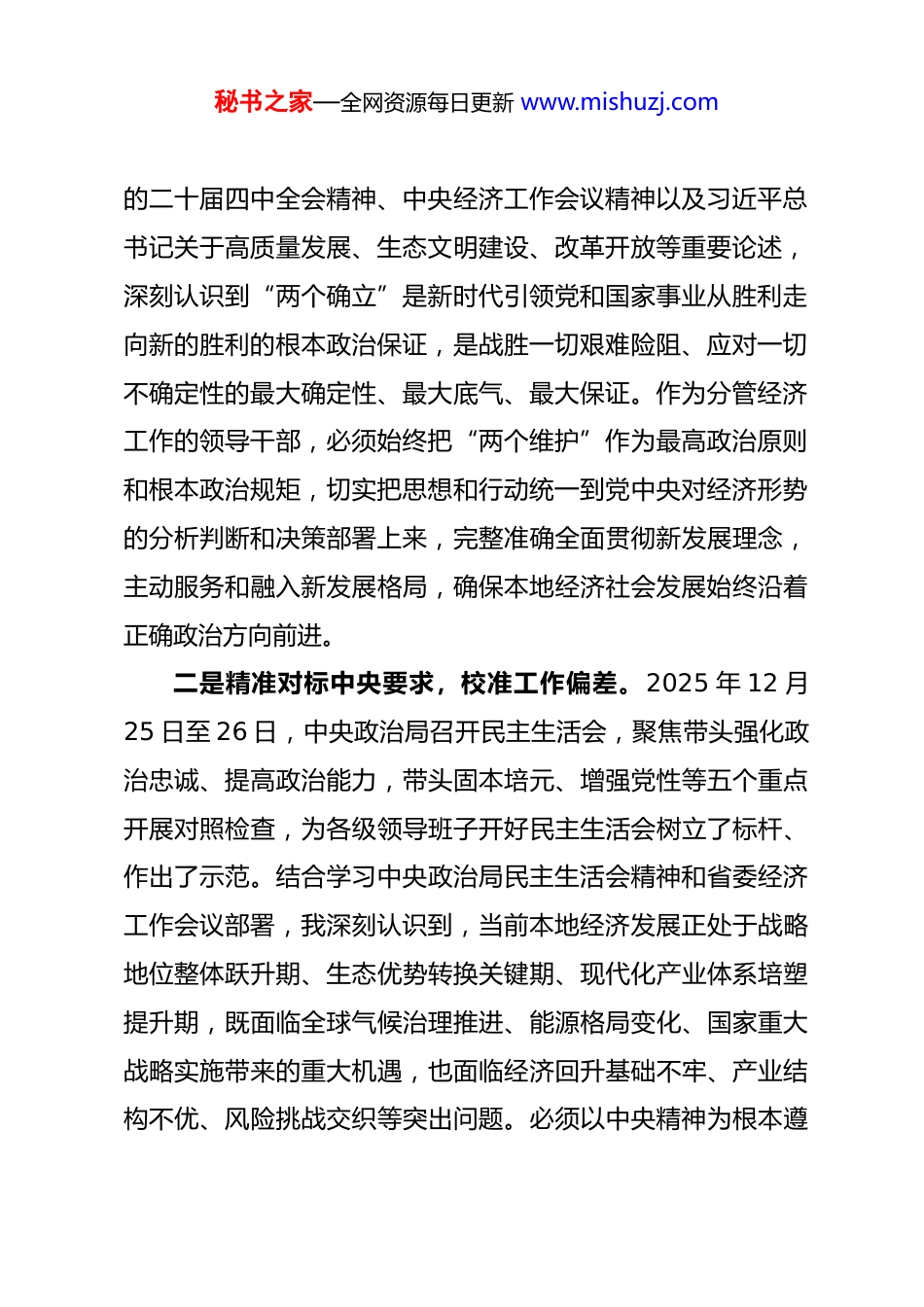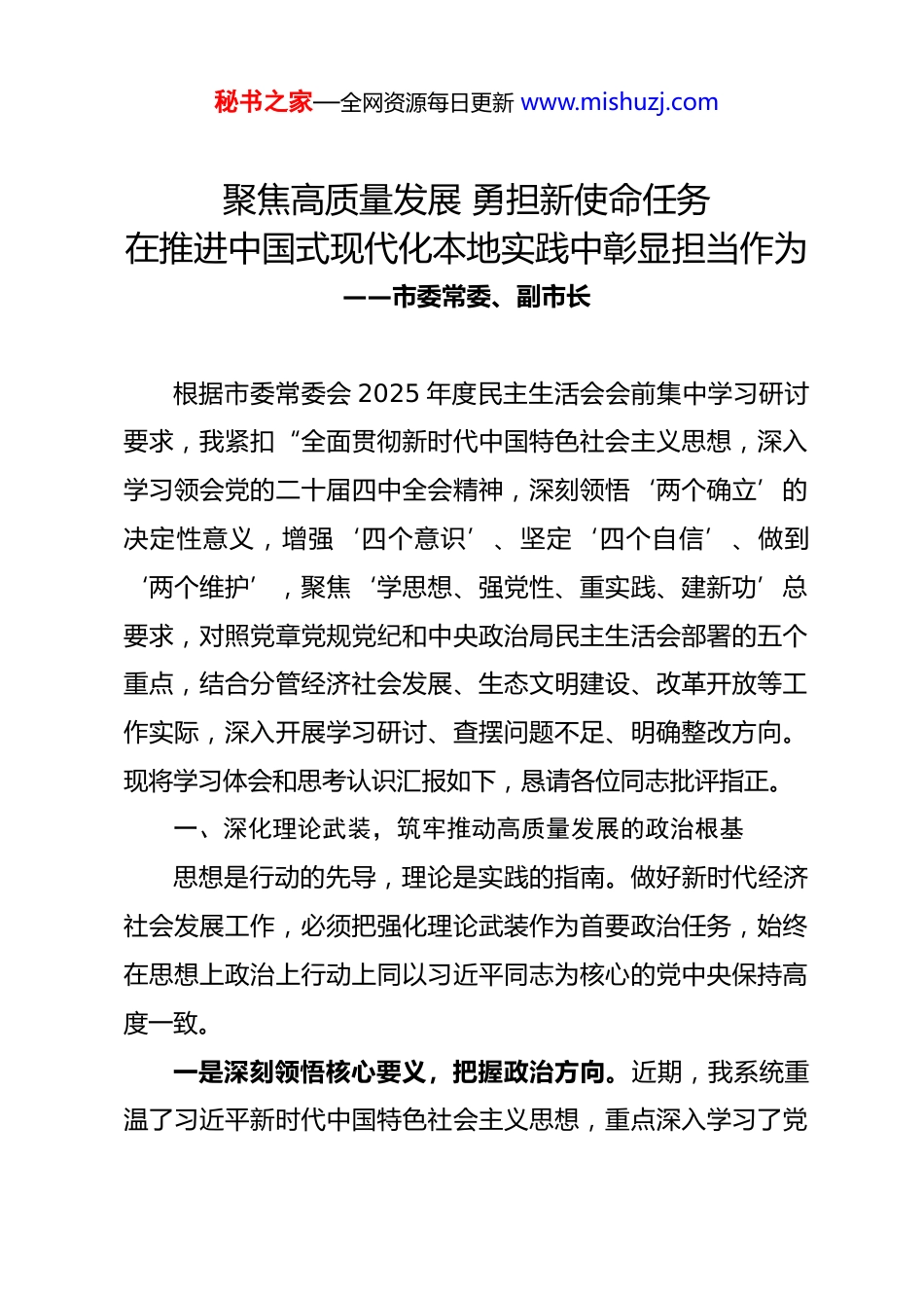 秘书之家—全网资源每日更新 www.mishuzj.com聚焦高质量发展 勇担新使命任务在推进中国式现代化本地实践中彰显担当作为——市委常委、副市长根据市委常委会 2025 年度民主生活会会前集中学习研讨要求,我紧扣“全面贯彻新时代中国特色社会主义思想,深入学习领会党的二十届四中全会精神,深刻领悟‘两个确立’的决定性意义,增强‘四个意识’、坚定‘四个自信’、做到‘两个维护’,聚焦‘学思想、强党性、重实践、建新功’总要求,对照党章党规党纪和中央政治局民主生活会部署的五个重点,结合分管经济社会发展、生态文明建设、改革开放等工作实际,深入开展学习研讨、查摆问题不足、明确整改方向。现将学习体会和思考认识汇报如下,恳请各位同志批评指正。一、深化理论武装,筑牢推动高质量发展的政治根基思想是行动的先导,理论是实践的指南。做好新时代经济社会发展工作,必须把强化理论武装作为首要政治任务,始终在思想上政治上行动上同以习近平同志为核心的党中央保持高度一致。一是深刻领悟核心要义,把握政治方向。近期,我系统重温了习近平新时代中国特色社会主义思想,重点深入学习了党秘书之家—全网资源每日更新 www.mishuzj.com的二十届四中全会精神、中央经济工作会议精神以及习近平总书记关于高质量发展、生态文明建设、改革开放等重要论述,深刻认识到“两个确立”是新时代引领党和国家事业从胜利走向新的胜利的根本政治保证,是战胜一切艰难险阻、应对一切不确定性的最大确定性、最大底气、最大保证。作为分管经济工作的领导干部,必须始终把“两个维护”作为最高政治原则和根本政治规矩,切实把思想和行动统一到党中央对经济形势的分析判断和决策部署上来,完整准确全面贯彻新发展理念,主动服务和融入新发展格局,确保本地经济社会发展始终沿着正确政治方向前进。二是精准对标中央要求,校准工作偏差。2025 年 12 月25 日至 26 日,中央政治局召开民主生活会,聚焦带头强化政治忠诚、提高政治能力,带头固本培元、增强党性等五个重点开展对照检查,为各级领导班子开好民主生活会树立了标杆、作出了示范。结合学习中央政治局民主生活会精神和省委经济工作会议部署,我深刻认识到,当前本地经济发展正处于战略地位整体跃升期、生态优势转换关键期、现代化产业体系培塑提升期,既面临全球气候治理推进、能源格局变化、国家重大战略实施带来的重大机遇,也面临经济回升基础不牢、产业结构不优、风险挑战交织等突出问题。必须以中央精神为根本遵秘书之家—全网资源每日更新 www.mishuzj.com循,主动把本地发展放到全国全省大局中谋划推进,坚决摒弃惯性思维和路径依赖,以理论清醒保证政治坚定,以思想自觉引领行动自觉,切实把学习成果转化为推动经济高质量发展的实际成效。三是坚持学用结合贯通,提升履职能力。习近平总书记在中央经济工作会议上的重要讲话,通篇贯穿马克思主义认识论、实践论、方法论,为做好当前和今后一个时期经济工作指明了方向、提供了遵循。我坚持把学习贯彻中央精神与落实市委全会部署、推动分管领域工作结合起来,一体把握、融会贯通,重点围绕构建现代化产业体系、培育新质生产力、推动生态价值转化等重大课题开展调研思考,努力把学习成效体现到把握发展规律、破解发展难题、提升发展质效上,不断增强从政治上看经济、抓经济的能力,提高运用党的创新理论指导实践、推动工作的水平。二、聚焦主责主业,盘点经济社会发展工作成效与不足2025 年以来,在市委坚强领导下,我始终坚持稳中求进工作总基调,更好统筹发展和安全,聚焦高质量发展这一首要任务,牵头推进产业升级、生态保护、改革开放、民生保障等重点工作,经济社会发展呈现稳中有进、逐绿向新、扩量提质的良好态势,但也存在一些不容忽视的问题和短板。秘书之家—全网资源每日更新 www.mishuzj.com(一)工作推进成效一是经济运行态势总体平稳。面对严峻复杂的国内外形势牵头制定稳经济一揽子政策及接续措施,强化政策协同发力,着力稳就业、稳企业、稳市场、稳预期。全年地区生产总值同比增长 X%,固定资产投资增长 X%,社会消费品零售总额增长 X%,一般公共...