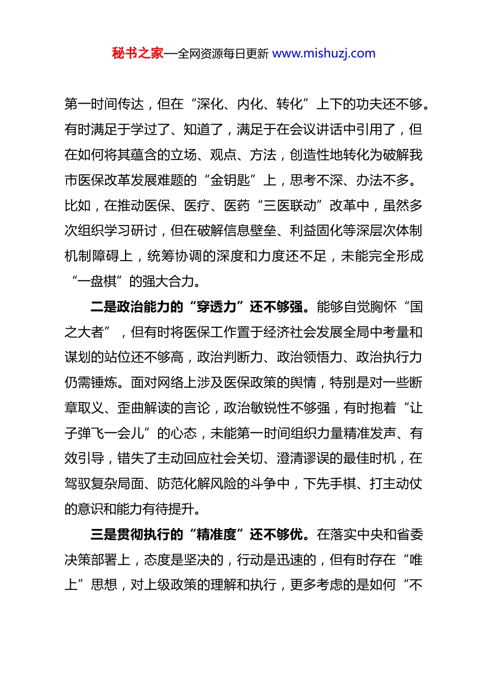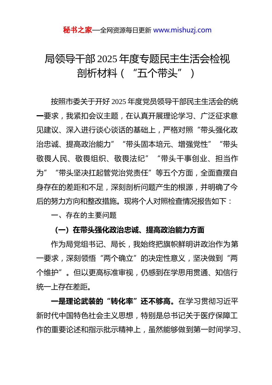 秘书之家—全网资源每日更新 www.mishuzj.com局领导干部 2025 年度专题民主生活会检视剖析材料(“五个带头”)按照市委关于开好 2025 年度党员领导干部民主生活会的统一要求,我紧扣会议主题,在认真开展理论学习、广泛征求意见建议、深入进行谈心谈话的基础上,严格对照“带头强化政治忠诚、提高政治能力”“带头固本培元、增强党性”“带头敬畏人民、敬畏组织、敬畏法纪”“带头干事创业、担当作为”“带头坚决扛起管党治党责任”等五个方面,全面查摆自身存在的差距和不足,深刻剖析问题产生的根源,并明确了今后的努力方向和整改措施。现将个人对照检查情况报告如下:一、存在的主要问题(一)在带头强化政治忠诚、提高政治能力方面作为局党组书记、局长,我始终把旗帜鲜明讲政治作为第一要求,深刻领悟“两个确立”的决定性意义,坚决做到“两个维护”。但以更高标准审视,仍感到在学思用贯通、知信行统一上存在差距。一是理论武装的“转化率”还不够高。在学习贯彻习近平新时代中国特色社会主义思想,特别是总书记关于医疗保障工作的重要论述和指示批示精神上,虽然能够做到第一时间学习、秘书之家—全网资源每日更新 www.mishuzj.com第一时间传达,但在“深化、内化、转化”上下的功夫还不够。有时满足于学过了、知道了,满足于在会议讲话中引用了,但在如何将其蕴含的立场、观点、方法,创造性地转化为破解我市医保改革发展难题的“金钥匙”上,思考不深、办法不多。比如,在推动医保、医疗、医药“三医联动”改革中,虽然多次组织学习研讨,但在破解信息壁垒、利益固化等深层次体制机制障碍上,统筹协调的深度和力度还不足,未能完全形成“一盘棋”的强大合力。二是政治能力的“穿透力”还不够强。能够自觉胸怀“国之大者”,但有时将医保工作置于经济社会发展全局中考量和谋划的站位还不够高,政治判断力、政治领悟力、政治执行力仍需锤炼。面对网络上涉及医保政策的舆情,特别是对一些断章取义、歪曲解读的言论,政治敏锐性不够强,有时抱着“让子弹飞一会儿”的心态,未能第一时间组织力量精准发声、有效引导,错失了主动回应社会关切、澄清谬误的最佳时机,在驾驭复杂局面、防范化解风险的斗争中,下先手棋、打主动仗的意识和能力有待提升。三是贯彻执行的“精准度”还不够优。在落实中央和省委决策部署上,态度是坚决的,行动是迅速的,但有时存在“唯上”思想,对上级政策的理解和执行,更多考虑的是如何“不秘书之家—全网资源每日更新 www.mishuzj.com折不扣”,而对于如何结合我市人口结构、疾病谱系、医疗资源分布等实际情况,进行“因地制宜”的精细化、差异化落实,探索不够、创新不足。在推进按疾病诊断相关分组(DRG)付费方式改革中,对部分专科医院、基层医疗机构的特殊情况考虑不够周全,导致出现了“一刀切”的倾向,影响了部分医疗机构的积极性。(二)在带头固本培元、增强党性方面我始终牢记自己的第一身份是共产党员,注重在严肃的党内政治生活中锤炼党性,但反躬自省,理想信念的“压舱石”作用发挥得还不够充分。一是党内政治生活“辣味”尚显不足。作为党组书记,在主持民主生活会、组织生活会时,带头开展批评和自我批评的表率作用发挥不够好。自我批评有时还存在“避重就轻”的现象,谈工作问题多、谈思想根源少,对班子其他同志的批评也多以工作建议代替,缺乏一些“闻过则喜、知过不讳”的胸襟和“刺刀见红”的勇气,客观上影响了党内政治生活的政治性、时代性、原则性、战斗性。二是理想信念教育“滴灌”不够经常。在日常工作中,投入大量精力抓医保基金监管、药品集中采购等具体业务,静下心来补精神之“钙”、固思想之“元”的时间相对较少。面对秘书之家—全网资源每日更新 www.mishuzj.com医保基金收支平衡的巨大压力、与医药企业谈判的艰难博弈,偶尔会产生畏难发愁的情绪,艰苦奋斗、攻坚克难的革命精神和斗争意志有所弱化。在对党员干部的教育中,讲政策、讲业务多,讲党的奋斗史、讲革命先辈的崇高精神少,理想信念教育未能真正做到春风化雨、润物无声。三是党员先锋作用“引领”不够突出。在日常工作中,对自己的要求有...