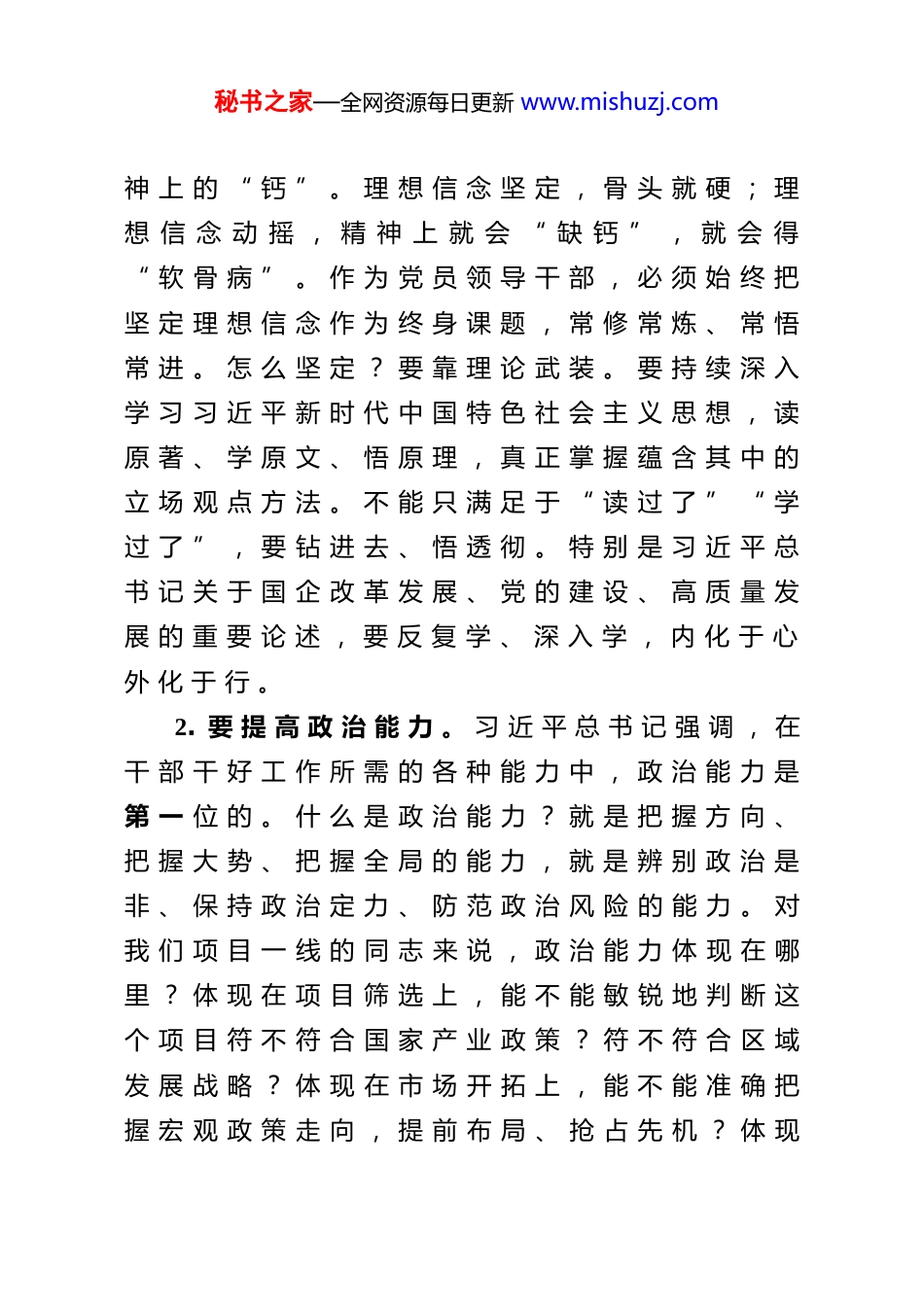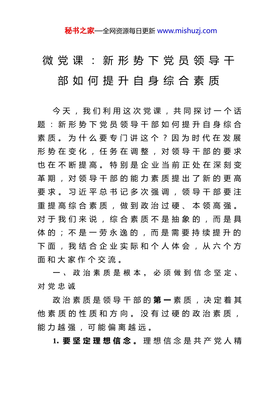 秘书之家—全网资源每日更新 www.mishuzj.com微 党 课 : 新 形 势 下 党 员 领 导 干部 如 何 提 升 自 身 综 合 素 质 今 天 , 我 们 利 用 这 次 党 课 , 共 同 探 讨 一 个 话题 : 新 形 势 下 党 员 领 导 干 部 如 何 提 升 自 身 综 合素 质 。 为 什 么 要 专 门 讲 这 个 ? 因 为 时 代 在 发 展形 势 在 变 化 , 任 务 在 调 整 , 对 领 导 干 部 的 要 求也 在 不 断 提 高 。 特 别 是 企 业 当 前 正 处 在 深 刻 变革 期 , 对 领 导 干 部 的 能 力 素 质 提 出 了 新 的 更 高要 求 。 习 近 平 总 书 记 多 次 强 调 , 领 导 干 部 要 注重 提 高 综 合 素 质 , 做 到 政 治 过 硬 、 本 领 高 强 。对 于 我 们 来 说 , 综 合 素 质 不 是 抽 象 的 , 而 是 具体 的 ; 不 是 一 劳 永 逸 的 , 而 是 需 要 持 续 提 升 的下 面 , 我 结 合 企 业 实 际 和 个 人 体 会 , 从 六 个 方面 和 大 家 作 个 交 流 。一 、 政 治 素 质 是 根 本 , 必 须 做 到 信 念 坚 定 、对 党 忠 诚政 治 素 质 是 领 导 干 部 的 第 一 素 质 , 决 定 着 其他 素 质 的 性 质 和 方 向 。 没 有 过 硬 的 政 治 素 质 ,能 力 越 强 , 可 能 偏 离 越 远 。1. 要 坚 定 理 想 信 念 。 理 想 信 念 是 共 产 党 人 精秘书之家—全网资源每日更新 www.mishuzj.com神 上 的 “ 钙 ” 。 理 想 信 念 坚 定 , 骨 头 就 硬 ; 理想 信 念 动 摇 , 精 神 上 就 会 “ 缺 钙 ” , 就 会 得“ 软 骨 病 ” 。 作 为 党 员 领 导 干 部 , 必 须 始 终 把坚 定 理 想 信 念 作 为 终 身 课 题 , 常 修 常 炼 、 常 悟常 进 。 怎 么 坚 定 ? 要 靠 理 论 武 装 。 要 持 续 深 入学 习 习 近 平 新 时 代 中 国 特 色 社 会 主 义 思 想 , 读原 著 、 学 原 文 、 悟 原 理 , 真 正 掌 握 蕴 含 其 中 的立 场 观 点 方 法 。 不 能 只 满 足 于 “ 读 过 了 ” “ 学过 了 ” , 要 钻 进 去 、 悟 透 彻 。 特 别 是 习 近 平 总书 记 关 于 国 企 改 革 发 展 、 党 的 建 设 、 高 质 量 发展 的 重 要 论 述 , 要 反 复 学 、 深 入 学 , 内 化 于 心外 化 于 行 。2. 要 提 高 政 治 能 力 。 习 近 平 总 书 记 强 调 , 在干 部 干 好 工 作 所 需 的 各 种 能 力 中 , 政 治 能 力 是第 一 位 的 。 什 么 是 政 治 能 力 ? 就 是 把 握 方 向 、把 握 大 势 、 把 握 全 局 的 能 力 , 就 是 辨 别 政 治 是非 、 保 持 政 治 定 力 、 防 范 政 治 风 险 的 能 力 。 对我 们 项 目 一 线 的 同 志 来 说 , 政 治 能 力 体 现 在 哪里 ? 体 现 在 项 目 筛 选 上 , 能 不 能 敏 锐 地 判 断 这个 项 目 符 不 符 合 国 家 产 业 政 策 ? 符 不 符 合 区 域发 展 战 略 ? 体 现 在 市 场 开 拓 上 , 能 不 能 准 确 把握 宏 观 政 策 走 向 , 提 前 布 局 、 抢 占 先 机 ? 体 现秘书之家—全网资源每日更新 www.mishuzj.com在 日 常 工 作 中 , 能 不 能 在 大 是 大 非 面 前 头 脑 清醒 、 立 场 坚 定 , 在 贯 彻 执 行 上 级 决 策 部 署 上 不打 折 扣 、 不 搞 变 通 ?3. 要 严 守 政 ...