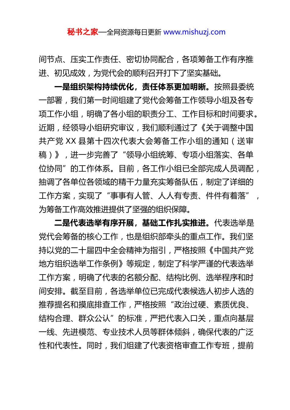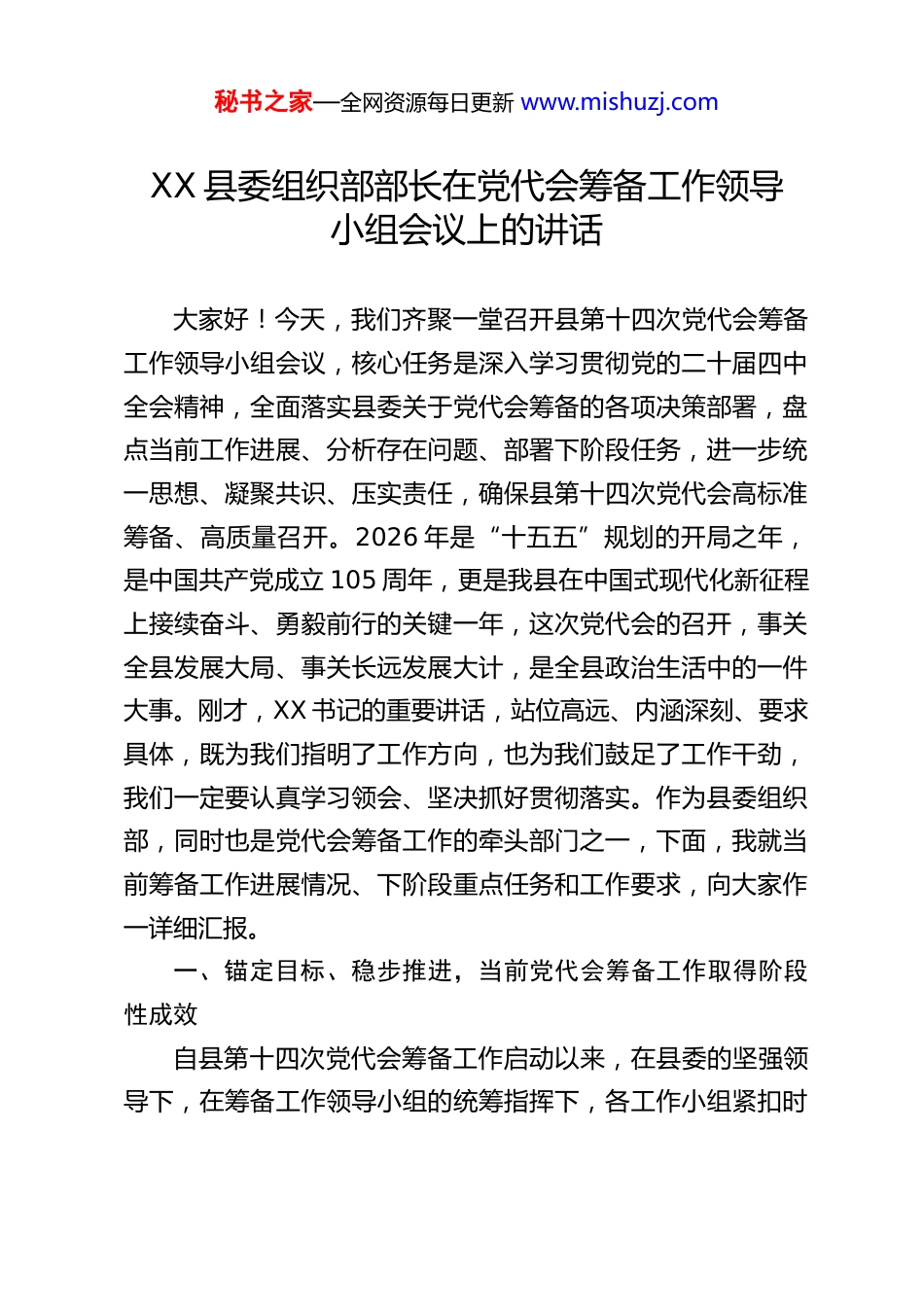 秘书之家—全网资源每日更新 www.mishuzj.comXX 县委组织部部长在党代会筹备工作领导小组会议上的讲话大家好!今天,我们齐聚一堂召开县第十四次党代会筹备工作领导小组会议,核心任务是深入学习贯彻党的二十届四中全会精神,全面落实县委关于党代会筹备的各项决策部署,盘点当前工作进展、分析存在问题、部署下阶段任务,进一步统一思想、凝聚共识、压实责任,确保县第十四次党代会高标准筹备、高质量召开。2026 年是“十五五”规划的开局之年,是中国共产党成立 105 周年,更是我县在中国式现代化新征程上接续奋斗、勇毅前行的关键一年,这次党代会的召开,事关全县发展大局、事关长远发展大计,是全县政治生活中的一件大事。刚才,XX 书记的重要讲话,站位高远、内涵深刻、要求具体,既为我们指明了工作方向,也为我们鼓足了工作干劲,我们一定要认真学习领会、坚决抓好贯彻落实。作为县委组织部,同时也是党代会筹备工作的牵头部门之一,下面,我就当前筹备工作进展情况、下阶段重点任务和工作要求,向大家作一详细汇报。一、锚定目标、稳步推进,当前党代会筹备工作取得阶段性成效自县第十四次党代会筹备工作启动以来,在县委的坚强领导下,在筹备工作领导小组的统筹指挥下,各工作小组紧扣时秘书之家—全网资源每日更新 www.mishuzj.com间节点、压实工作责任、密切协同配合,各项筹备工作有序推进、初见成效,为党代会的顺利召开打下了坚实基础。一是组织架构持续优化,责任体系更加明晰。按照县委统一部署,我们第一时间组建了党代会筹备工作领导小组及各专项工作小组,明确了各小组的职责分工、工作目标和时间要求。近期,经领导小组研究审议,我们顺利通过了《关于调整中国共产党 XX 县第十四次代表大会筹备工作小组的通知(送审稿)》,进一步完善了“领导小组统筹、专项小组落实、各单位协同”的工作体系。目前,各工作小组已全部完成人员调配,抽调了各单位各领域的精干力量充实筹备队伍,制定了详细的工作方案,实现了“事事有人管、人人有专责、件件有着落”,为筹备工作高效推进提供了坚强的组织保障。二是代表选举有序开展,基础工作扎实推进。代表选举是党代会筹备的核心工作,也是组织部牵头的重点工作。我们坚持以党的二十届四中全会精神为指引,严格按照《中国共产党地方组织选举工作条例》等规定,制定了科学严谨的代表选举工作方案,明确了代表的名额分配、结构比例、选举程序和时间安排。截至目前,各选举单位已完成代表候选人初步人选的推荐提名和摸底排查工作,严格按照“政治过硬、素质优良、结构合理、群众公认”的标准,严把代表入口关,重点向基层一线、先进模范、专业技术人员等群体倾斜,确保代表的广泛性和代表性。同时,我们组建了代表资格审查工作专班,提前秘书之家—全网资源每日更新 www.mishuzj.com介入审查工作,对候选人的政治素质、廉洁自律、履职能力等情况进行全面核查,坚决把不符合条件的人员挡在门外。三是会务筹备全面铺开,各项保障逐步到位。会务保障组后勤服务组、宣传组等各专项小组提前谋划、主动作为,各项工作有序推进。会务保障组已完成会议场地的初步选址和勘查,正在细化会场布置、座位安排、设备调试等方案,同步推进会议资料的印制、分装等前期准备;后勤服务组围绕参会人员的食宿、交通、医疗等保障工作,制定了详细的工作预案,重点做好食品安全、住宿保障等工作,确保参会人员舒心参会;宣传组结合建党 105 周年和“十五五”开局的时代背景,制定了党代会宣传工作方案,通过县融媒体中心、官方微信公众号等平台,提前营造了喜迎党代会的浓厚氛围。四是风气监督提前发力,纪律防线牢固构筑。我们始终把换届风气监督摆在突出位置,坚持严的基调、严的措施、严的氛围,把纪律和规矩挺在前面。结合学习贯彻党的二十届四中全会关于全面从严治党的部署要求,以及全党正在开展的树立和践行正确政绩观学习教育,将换届纪律教育融入其中,组织各选举单位、筹备工作人员深入学习换届纪律“十严禁”等要求,通过发放宣传手册、开展专题培训、观看警示教育片等方式,实现纪律教育全覆盖。同时,我们建立了换届风气...