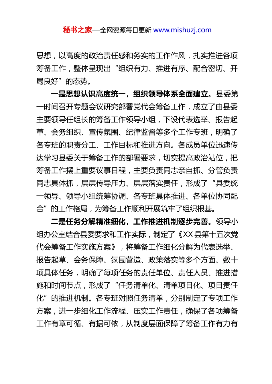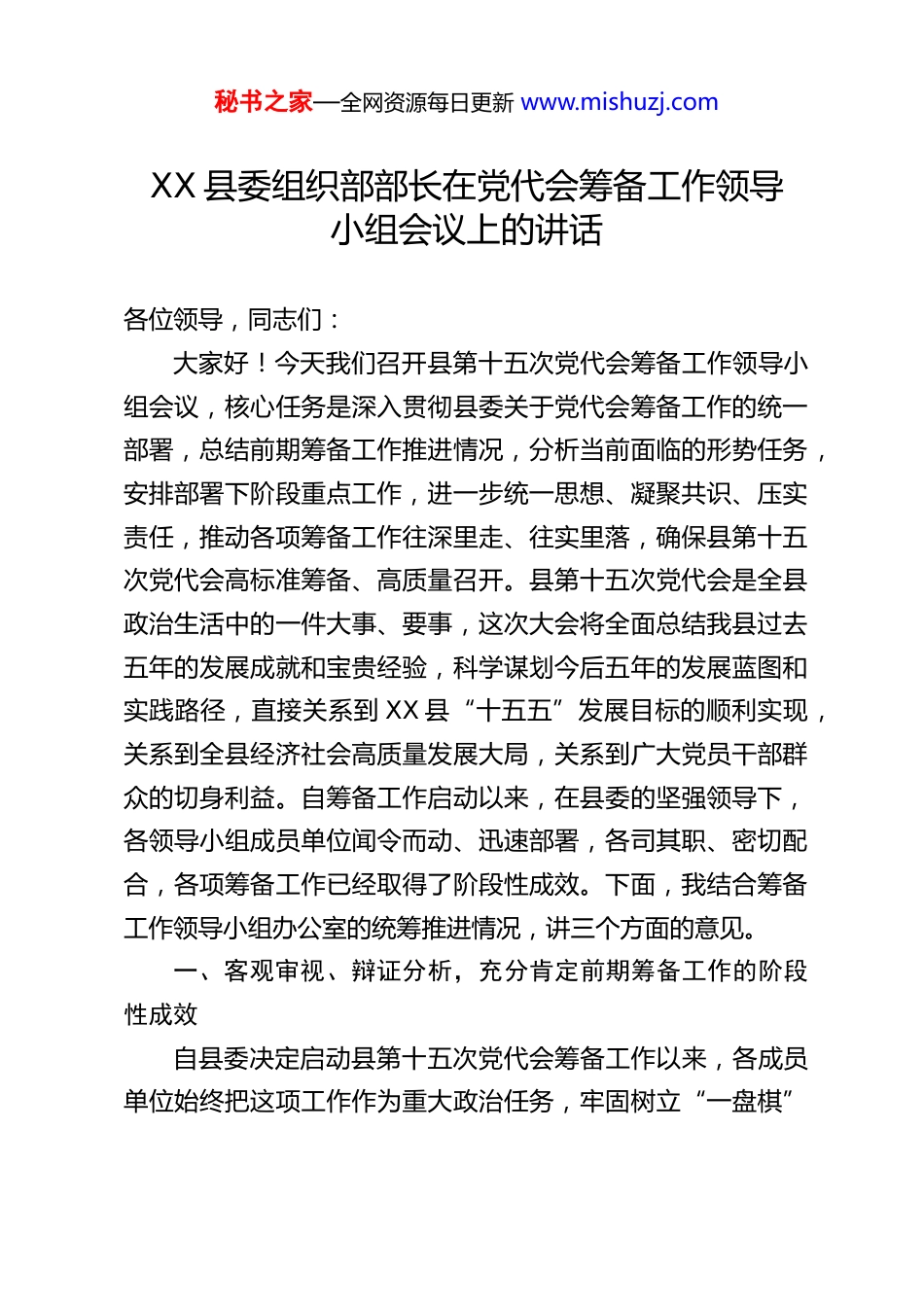 秘书之家—全网资源每日更新 www.mishuzj.comXX 县委组织部部长在党代会筹备工作领导小组会议上的讲话各位领导,同志们:大家好!今天我们召开县第十五次党代会筹备工作领导小组会议,核心任务是深入贯彻县委关于党代会筹备工作的统一部署,总结前期筹备工作推进情况,分析当前面临的形势任务,安排部署下阶段重点工作,进一步统一思想、凝聚共识、压实责任,推动各项筹备工作往深里走、往实里落,确保县第十五次党代会高标准筹备、高质量召开。县第十五次党代会是全县政治生活中的一件大事、要事,这次大会将全面总结我县过去五年的发展成就和宝贵经验,科学谋划今后五年的发展蓝图和实践路径,直接关系到 XX 县“十五五”发展目标的顺利实现,关系到全县经济社会高质量发展大局,关系到广大党员干部群众的切身利益。自筹备工作启动以来,在县委的坚强领导下,各领导小组成员单位闻令而动、迅速部署,各司其职、密切配合,各项筹备工作已经取得了阶段性成效。下面,我结合筹备工作领导小组办公室的统筹推进情况,讲三个方面的意见。一、客观审视、辩证分析,充分肯定前期筹备工作的阶段性成效自县委决定启动县第十五次党代会筹备工作以来,各成员单位始终把这项工作作为重大政治任务,牢固树立“一盘棋”秘书之家—全网资源每日更新 www.mishuzj.com思想,以高度的政治责任感和务实的工作作风,扎实推进各项筹备工作,整体呈现出“组织有力、推进有序、配合密切、开局良好”的态势。一是思想认识高度统一,组织领导体系全面建立。县委第一时间召开专题会议研究部署党代会筹备工作,成立了由县委主要领导任组长的筹备工作领导小组,下设代表选举、报告起草、会务组织、宣传氛围、纪律监督等多个工作专班,明确了各专班的职责分工、工作目标和推进方向。各成员单位迅速传达学习县委关于筹备工作的部署要求,切实提高政治站位,把筹备工作摆上重要议事日程,主要负责同志亲自抓、分管负责同志具体抓,层层传导压力、层层落实责任,形成了“县委统一领导、领导小组统筹协调、各专班具体推进、各单位协同配合”的工作格局,为筹备工作顺利开展筑牢了组织根基。二是任务分解精准细化,工作推进机制逐步完善。领导小组办公室结合县委要求和工作实际,制定了《XX 县第十五次党代会筹备工作实施方案》,将筹备工作细化分解为代表选举、报告起草、会务保障、氛围营造、政策落实等多个方面、数十项具体任务,明确了每项任务的责任单位、责任人员、推进措施和时间节点,形成了“任务清单化、清单项目化、项目责任化”的推进机制。各专班对照任务清单,分别制定了专项工作方案,进一步细化工作流程、压实工作责任,确保了各项筹备工作有章可循、有据可依,从制度层面保障了筹备工作有力有秘书之家—全网资源每日更新 www.mishuzj.com序开展。三是核心工作稳步推进,重点环节取得初步成效。作为筹备工作的核心环节,代表选举工作在组织部的牵头推进下,已完成代表名额分配、选举单位划分、代表条件明确等前期工作,各基层党委已启动代表候选人初步人选的摸底推荐工作,为后续代表选举工作奠定了坚实基础。报告起草专班已开展前期调研,深入各乡镇、各部门收集发展成就、工作经验和意见建议,初步形成了工作报告的起草框架。会务组织专班已启动会场选址、会场布置、后勤保障等前期对接工作,宣传氛围专班已制定宣传工作方案,开始梳理全县五年来的发展成就,利用县融媒体中心、微信公众号等平台开展前期宣传,纪律监督专班已制定换届纪律监督工作方案,开始开展换届纪律宣传教育。四是政策学习深入扎实,业务能力得到有效提升。各专班始终把政策学习作为筹备工作的前提和基础,组织工作人员深入学习《中国共产党章程》《中国共产党地方组织选举工作条例》等党内法规,认真传达学习省、市委关于换届工作的最新要求和具体部署,通过专题学习、业务培训、交流研讨等方式,让全体工作人员吃透政策精神、把握工作标准、熟悉操作流程。领导小组办公室定期组织各专班开展政策解读和业务交流,及时解答筹备工作中遇到的政策问题,有效提升了工作人员的业务能力和实操水平,确保筹备工作始终在政策...