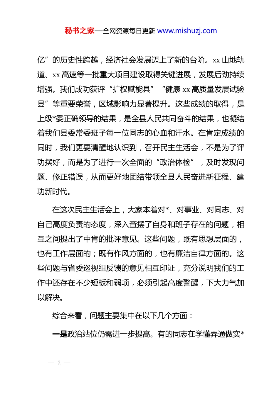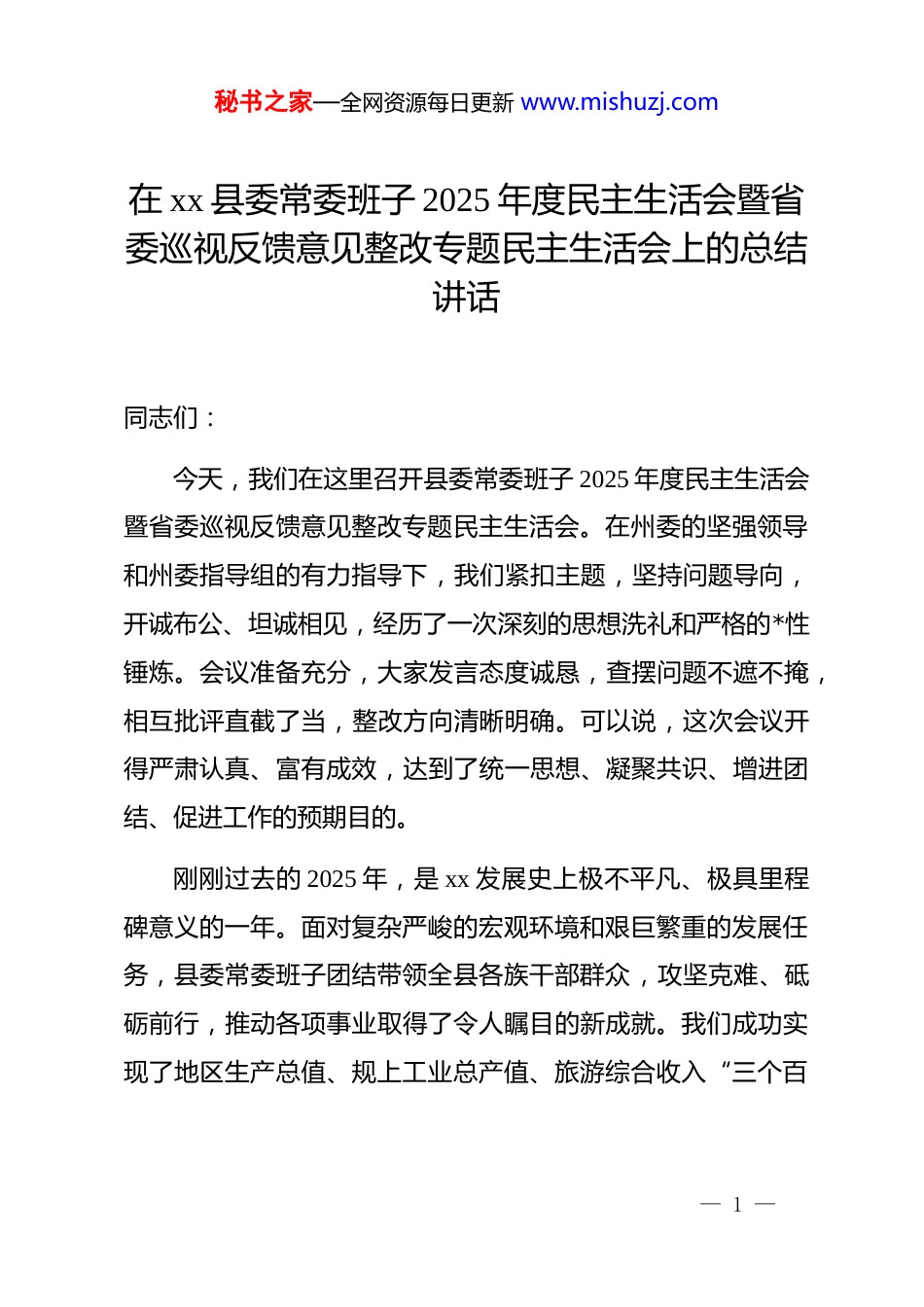秘书之家—全网资源每日更新 www.mishuzj.com在 xx 县委常委班子 2025 年度民主生活会暨省委巡视反馈意见整改专题民主生活会上的总结讲话同志们:今天,我们在这里召开县委常委班子 2025 年度民主生活会暨省委巡视反馈意见整改专题民主生活会。在州委的坚强领导和州委指导组的有力指导下,我们紧扣主题,坚持问题导向,开诚布公、坦诚相见,经历了一次深刻的思想洗礼和严格的*性锤炼。会议准备充分,大家发言态度诚恳,查摆问题不遮不掩,相互批评直截了当,整改方向清晰明确。可以说,这次会议开得严肃认真、富有成效,达到了统一思想、凝聚共识、增进团结、促进工作的预期目的。刚刚过去的 2025 年,是 xx 发展史上极不平凡、极具里程碑意义的一年。面对复杂严峻的宏观环境和艰巨繁重的发展任务,县委常委班子团结带领全县各族干部群众,攻坚克难、砥砺前行,推动各项事业取得了令人瞩目的新成就。我们成功实现了地区生产总值、规上工业总产值、旅游综合收入“三个百— 1 —秘书之家—全网资源每日更新 www.mishuzj.com亿”的历史性跨越,经济社会发展迈上了新的台阶。xx 山地轨道、xx 高速等一批重大项目建设取得关键进展,发展后劲持续增强。我们成功获评“扩权赋能县”“健康 xx 高质量发展试验县”等重要荣誉,区域影响力显著提升。这些成绩的取得,是上级*委正确领导的结果,是全县人民共同奋斗的结果,也凝结着我们县委常委班子每一位同志的心血和汗水。在肯定成绩的同时,我们更要清醒地认识到,召开民主生活会,不是为了评功摆好,而是为了进行一次全面的“政治体检”,及时发现问题、修正错误,从而更好地团结带领全县人民奋进新征程、建功新时代。在这次民主生活会上,大家本着对*、对事业、对同志、对自己高度负责的态度,深入查摆了自身和班子存在的问题,相互之间提出了中肯的批评意见。这些问题,既有思想层面的,也有工作层面的;既有作风方面的,也有廉洁自律方面的。这些问题与省委巡视组反馈的意见相互印证,充分说明我们的工作中还存在不少短板和弱项,必须引起高度警醒,下大力气加以解决。综合来看,问题主要集中在以下几个方面:一是政治站位仍需进一步提高。有的同志在学懂弄通做实*— 2 —秘书之家—全网资源每日更新 www.mishuzj.com*************思想上还不够深入,运用*的创新理论指导实践、推动工作的能力还有待加强。在贯彻落实中央、省委、州委决策部署上,有时存在结合 xx 实际不够紧密、创造性转化不足的问题,距离“不折不扣、令行禁止”的要求还有差距。二是在推动高质量发展上的担当精神仍需进一步强化。面对发展中的深层次矛盾和瓶颈制约,部分同志存在求稳怕乱的思想,敢闯敢试、敢为人先的锐气有所减弱。有的重点项目推进力度不够,攻坚克难的“钉钉子”精神有所松懈。在服务和融入新发展格局,打造民族地区高质量发展县域典范的征程中,思想解放程度、改革创新力度还需加大。三是践行以人民为中心的发展思想仍需进一步落实落细。虽然我们每年都实施了一批民生实事项目,群众的获得感、幸福感、安全感有了明显提升。但对照人民群众对美好生活的新期盼,我们的工作还有差距。有的同志深入基层、深入群众不够,对群众的急难愁盼问题体察不够深刻,解决群众反映强烈的教育、医疗、养老等问题的思路和举措还不够多、不够实。四是全面从严治*的主体责任仍需进一步压紧压实。省委巡视反馈指出的问题,很多都与管*治*不严不实有关。常委班子在履行“一岗双责”上还存在薄弱环节,对分管领域的干部教— 3 —秘书之家—全网资源每日更新 www.mishuzj.com育、管理和监督不够严格。形式主义、官僚主义在一定范围内仍然存在,个别领域的不正之风和腐败问题仍有发生的风险,*风廉政建设和反腐败斗争的形势依然严峻复杂。同志们,查摆问题是基础,解决问题才是关键。民主生活会的成果,最终要体现在整改落实的成效上,体现在推动发展的实绩上。借此机会,我代表县委常委会,对加强班子自身建设、抓好问题整改,讲几点意见,与大家共勉。第一,要在对*忠诚、锤炼政治品格上作表率。作为县委常委,讲政治是第一位的要求。我们必...
