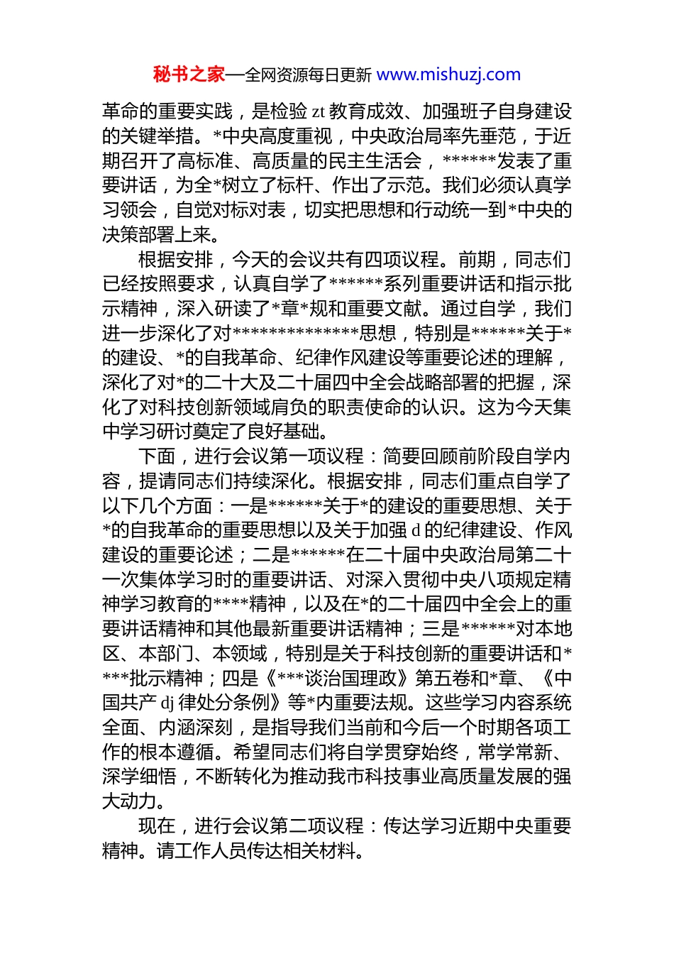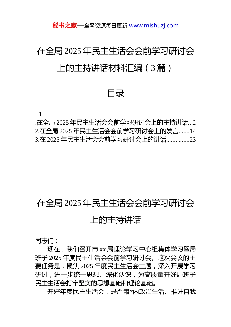 秘书之家—全网资源每日更新 www.mishuzj.com在全局 2025 年民主生活会会前学习研讨会上的主持讲话材料汇编(3 篇)目录1.在全局 2025 年民主生活会会前学习研讨会上的主持讲话...22.在全局 2025 年民主生活会会前学习研讨会上的发言.......143.在 2025 年民主生活会会前学习研讨会上的讲话...............23在全局 2025 年民主生活会会前学习研讨会上的主持讲话同志们:现在,我们召开市 xx 局理论学习中心组集体学习暨局班子 2025 年度民主生活会会前学习研讨会。这次会议的主要任务是:聚焦 2025 年度民主生活会主题,深入开展学习研讨,进一步统一思想、深化认识,为高质量开好局班子民主生活会打牢坚实的思想基础和理论基础。开好年度民主生活会,是严肃*内政治生活、推进自我秘书之家—全网资源每日更新 www.mishuzj.com革命的重要实践,是检验 zt 教育成效、加强班子自身建设的关键举措。*中央高度重视,中央政治局率先垂范,于近期召开了高标准、高质量的民主生活会,******发表了重要讲话,为全*树立了标杆、作出了示范。我们必须认真学习领会,自觉对标对表,切实把思想和行动统一到*中央的决策部署上来。根据安排,今天的会议共有四项议程。前期,同志们已经按照要求,认真自学了******系列重要讲话和指示批示精神,深入研读了*章*规和重要文献。通过自学,我们进一步深化了对**************思想,特别是******关于*的建设、*的自我革命、纪律作风建设等重要论述的理解,深化了对*的二十大及二十届四中全会战略部署的把握,深化了对科技创新领域肩负的职责使命的认识。这为今天集中学习研讨奠定了良好基础。下面,进行会议第一项议程:简要回顾前阶段自学内容,提请同志们持续深化。根据安排,同志们重点自学了以下几个方面:一是******关于*的建设的重要思想、关于*的自我革命的重要思想以及关于加强 d 的纪律建设、作风建设的重要论述;二是******在二十届中央政治局第二十一次集体学习时的重要讲话、对深入贯彻中央八项规定精神学习教育的****精神,以及在*的二十届四中全会上的重要讲话精神和其他最新重要讲话精神;三是******对本地区、本部门、本领域,特别是关于科技创新的重要讲话和****批示精神;四是《***谈治国理政》第五卷和*章、《中国共产 dj 律处分条例》等*内重要法规。这些学习内容系统全面、内涵深刻,是指导我们当前和今后一个时期各项工作的根本遵循。希望同志们将自学贯穿始终,常学常新、深学细悟,不断转化为推动我市科技事业高质量发展的强大动力。现在,进行会议第二项议程:传达学习近期中央重要精神。请工作人员传达相关材料。秘书之家—全网资源每日更新 www.mishuzj.com(传达学习环节)刚才,我们共同学习了******在 2025 年度中共中央政治局民主生活会上的重要讲话精神、《中共中央办公厅关于锲而不舍落实中央八项规定精神推进作风建设常态化长效化的意见》(中办发〔2025〕xx 号),以及《求是》杂志发表的******重要文章《扩大内需是战略之举》。这些内容极其重要,具有极强的政治性、指导性和现实针对性。………………现在,进行会议第三项议程:请局班子成员围绕“深入学习贯彻**************思想,聚焦民主生活会主题,结合思想和工作实际”进行交流发言。发言请重点谈认识谈体会、谈差距、谈打算。(班子成员依次交流发言)刚才,几位班子成员都做了很好的发言。大家的发言紧扣主题,思考深入,能够联系科技创新实际和分管领域工作,既有理论层面的认识升华,也有对存在问题的初步反思,还有改进工作的思路举措,达到了学习研讨、交流思想、共同提高的目的。总体来看,通过集中学习和交流研讨,我们对开好本次民主生活会的重大意义认识更加深刻,对需要把握的重点方向和关键环节理解更加透彻,为下一步深入查摆问题、开展批评与自我批评营造了良好氛围。下一步,要在此基础上,进一步深化学习,进一步梳理问题,为撰写对照检查材料、开一个高质量的民主生活会做好充分准备。下面,我就贯彻落实******在 2025 年度中共中央政治局民主生活会上的重要讲话精神,切实开展好市 xx 局班子 2025 年度...