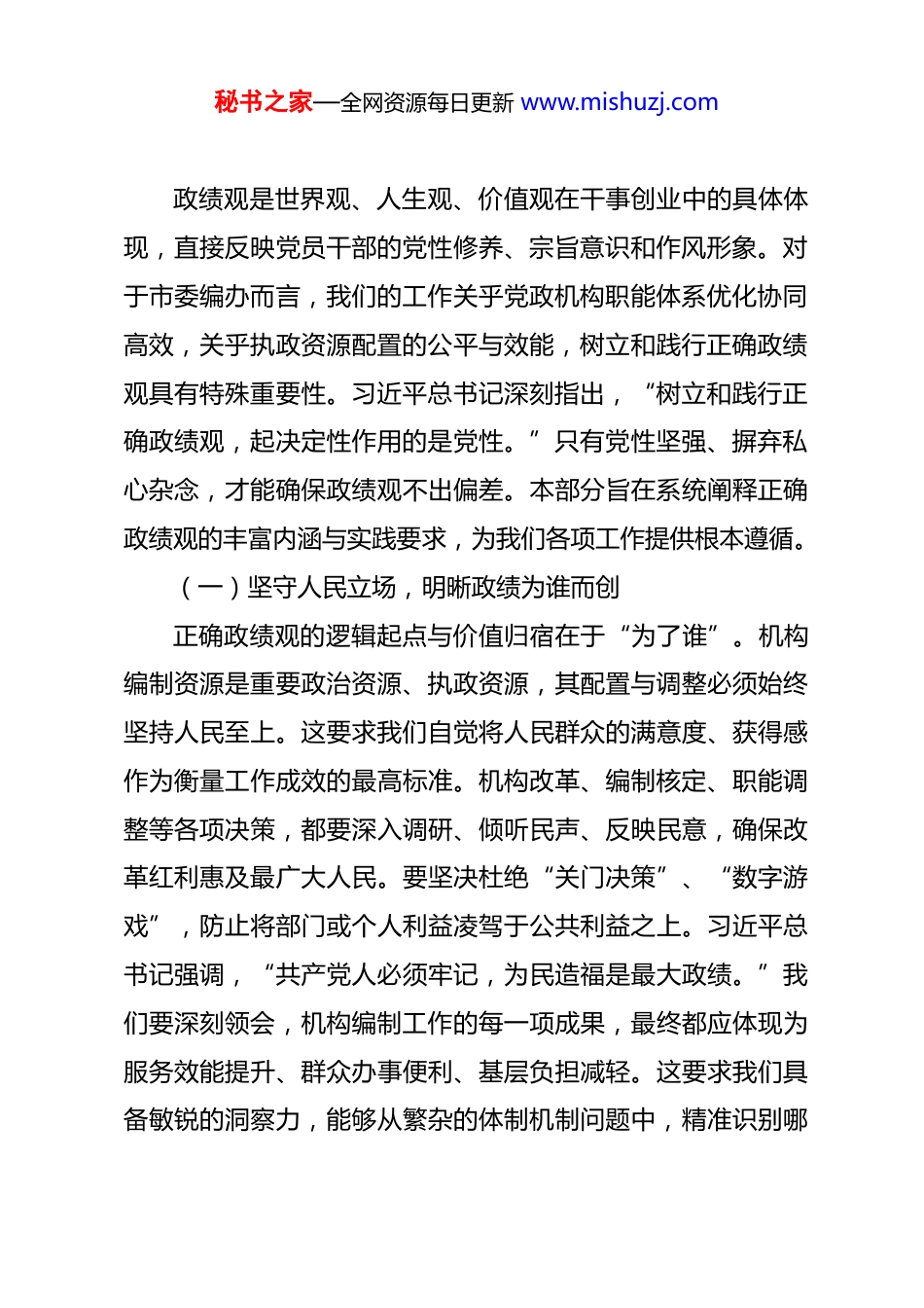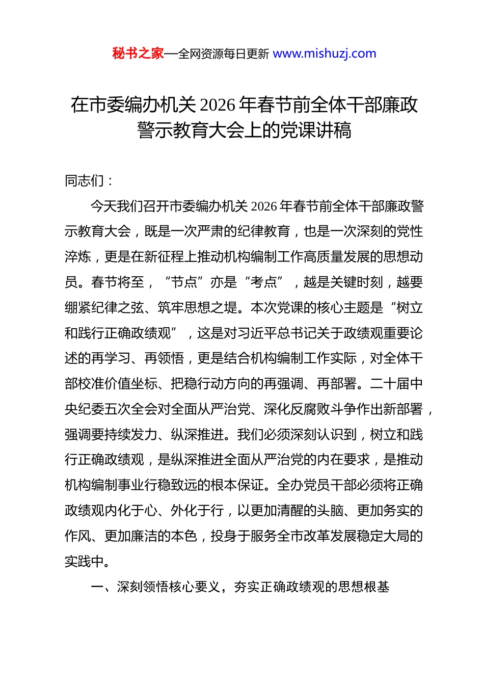秘书之家—全网资源每日更新 www.mishuzj.com在市委编办机关 2026 年春节前全体干部廉政警示教育大会上的党课讲稿 同志们:今天我们召开市委编办机关 2026 年春节前全体干部廉政警示教育大会,既是一次严肃的纪律教育,也是一次深刻的党性淬炼,更是在新征程上推动机构编制工作高质量发展的思想动员。春节将至,“节点”亦是“考点”,越是关键时刻,越要绷紧纪律之弦、筑牢思想之堤。本次党课的核心主题是“树立和践行正确政绩观”,这是对习近平总书记关于政绩观重要论述的再学习、再领悟,更是结合机构编制工作实际,对全体干部校准价值坐标、把稳行动方向的再强调、再部署。二十届中央纪委五次全会对全面从严治党、深化反腐败斗争作出新部署,强调要持续发力、纵深推进。我们必须深刻认识到,树立和践行正确政绩观,是纵深推进全面从严治党的内在要求,是推动机构编制事业行稳致远的根本保证。全办党员干部必须将正确政绩观内化于心、外化于行,以更加清醒的头脑、更加务实的作风、更加廉洁的本色,投身于服务全市改革发展稳定大局的实践中。一、深刻领悟核心要义,夯实正确政绩观的思想根基秘书之家—全网资源每日更新 www.mishuzj.com政绩观是世界观、人生观、价值观在干事创业中的具体体现,直接反映党员干部的党性修养、宗旨意识和作风形象。对于市委编办而言,我们的工作关乎党政机构职能体系优化协同高效,关乎执政资源配置的公平与效能,树立和践行正确政绩观具有特殊重要性。习近平总书记深刻指出,“树立和践行正确政绩观,起决定性作用的是党性。”只有党性坚强、摒弃私心杂念,才能确保政绩观不出偏差。本部分旨在系统阐释正确政绩观的丰富内涵与实践要求,为我们各项工作提供根本遵循。(一)坚守人民立场,明晰政绩为谁而创正确政绩观的逻辑起点与价值归宿在于“为了谁”。机构编制资源是重要政治资源、执政资源,其配置与调整必须始终坚持人民至上。这要求我们自觉将人民群众的满意度、获得感作为衡量工作成效的最高标准。机构改革、编制核定、职能调整等各项决策,都要深入调研、倾听民声、反映民意,确保改革红利惠及最广大人民。要坚决杜绝“关门决策”、“数字游戏”,防止将部门或个人利益凌驾于公共利益之上。习近平总书记强调,“共产党人必须牢记,为民造福是最大政绩。”我们要深刻领会,机构编制工作的每一项成果,最终都应体现为服务效能提升、群众办事便利、基层负担减轻。这要求我们具备敏锐的洞察力,能够从繁杂的体制机制问题中,精准识别哪秘书之家—全网资源每日更新 www.mishuzj.com些是影响群众切身利益、制约高质量发展的堵点难点,并以此为突破口谋划改革、推动工作。例如,在优化营商环境相关的机构职能配置中,必须紧紧围绕市场主体和人民群众的需求,打破隐性壁垒,推动服务流程再造,而不能仅仅满足于机构“物理整合”的表面文章。要始终胸怀“国之大者”,心系“民之关切”,确保我们创造的每一项“政绩”,都经得起历史、实践和人民的检验,都厚植党的执政根基。(二)聚焦发展大局,把准政绩取向之舵正确的政绩观必须融入时代洪流,紧扣发展脉搏。当前,我国正着力推动高质量发展,全面建设社会主义现代化国家。市委编办的工作必须自觉服从服务于这一中心大局。要深刻理解新发展阶段、新发展理念、新发展格局对机构职能体系提出的新要求,使机构编制工作与经济社会发展同频共振。这意味着,我们的政绩不能局限于简单的“管住编制”、“守住盘子”,而应体现在如何通过精准科学的资源配置和体制机制创新,为全市贯彻新发展理念、构建新发展格局、推动高质量发展提供坚强的制度和组织保障。要围绕重大战略实施、重点领域改革、基层治理现代化等关键任务,前瞻性研究机构编制保障方案,做到市委决策部署到哪里,机构编制服务和保障就跟进到哪里。要坚决反对脱离实际、盲目攀比的“形象工程”,秘书之家—全网资源每日更新 www.mishuzj.com摒弃那些华而不实、浪费资源的所谓“创新”。必须清醒认识到,只有那些紧扣发展急需、符合客观规律、能够持续释放改革效应的机构编制调整,才是真正的、有价值的政绩。这要求我们不断提升...