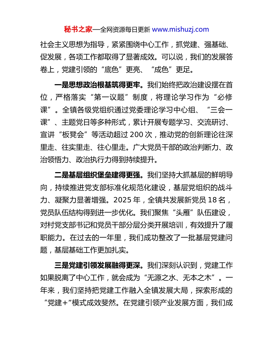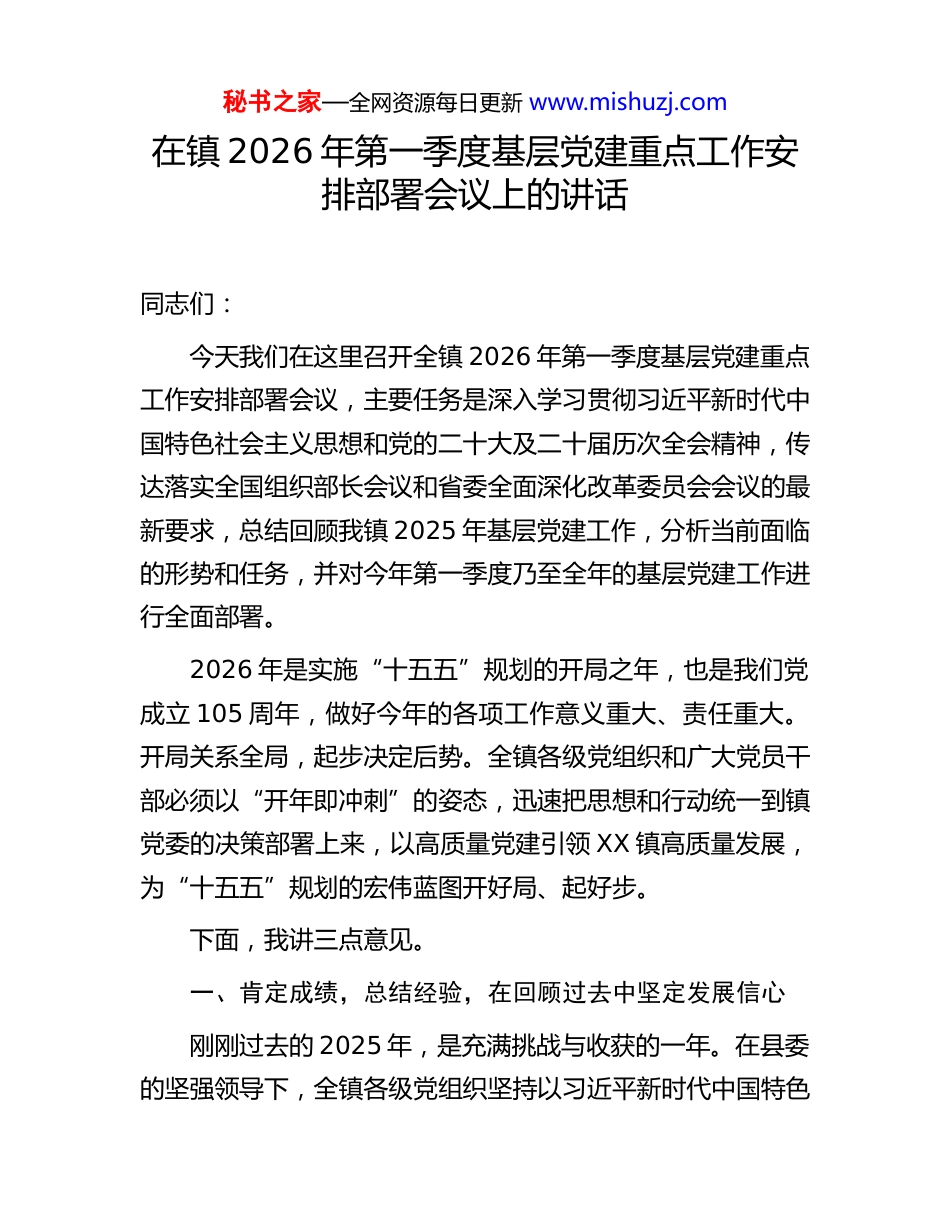 秘书之家—全网资源每日更新 www.mishuzj.com在镇 2026 年第一季度基层党建重点工作安排部署会议上的讲话同志们:今天我们在这里召开全镇 2026 年第一季度基层党建重点工作安排部署会议,主要任务是深入学习贯彻习近平新时代中国特色社会主义思想和党的二十大及二十届历次全会精神,传达落实全国组织部长会议和省委全面深化改革委员会会议的最新要求,总结回顾我镇 2025 年基层党建工作,分析当前面临的形势和任务,并对今年第一季度乃至全年的基层党建工作进行全面部署。2026 年是实施“十五五”规划的开局之年,也是我们党成立 105 周年,做好今年的各项工作意义重大、责任重大。开局关系全局,起步决定后势。全镇各级党组织和广大党员干部必须以“开年即冲刺”的姿态,迅速把思想和行动统一到镇党委的决策部署上来,以高质量党建引领 XX 镇高质量发展,为“十五五”规划的宏伟蓝图开好局、起好步。下面,我讲三点意见。一、肯定成绩,总结经验,在回顾过去中坚定发展信心刚刚过去的 2025 年,是充满挑战与收获的一年。在县委的坚强领导下,全镇各级党组织坚持以习近平新时代中国特色秘书之家—全网资源每日更新 www.mishuzj.com社会主义思想为指导,紧紧围绕中心工作,抓党建、强基础、促发展,各项工作都取得了显著成效。可以说,我们的发展答卷上,党建引领的“底色”更亮、“成色”更足。一是思想政治根基筑得更牢。我们始终把政治建设摆在首位,严格落实“第一议题”制度,将理论学习作为“必修课”。全镇各级党组织通过党委理论学习中心组、“三会一课”、主题党日等多种形式,累计开展专题学习、交流研讨、宣讲“板凳会”等活动超过 200 次,推动党的创新理论往深里走、往实里走、往心里走。广大党员干部的政治判断力、政治领悟力、政治执行力得到持续提升。二是基层组织堡垒建得更强。我们坚持大抓基层的鲜明导向,持续推进党支部标准化规范化建设,基层党组织的战斗力、凝聚力显著增强。2025 年,全镇共发展新党员 18 名,党员队伍结构得到进一步优化。我们聚焦“头雁”队伍建设,对村党支部书记和党员干部分层分类开展培训,有效提升了履职能力。在过去的一年里,我们成功整改了一批基层党建问题,基层基础工作更加扎实。三是党建引领发展融得更深。我们深刻认识到,党建工作如果脱离了中心工作,就会成为“无源之水、无本之木”。一年来,我们坚持把党建工作融入全镇发展大局,探索形成的“党建+”模式成效斐然。在党建引领产业发展方面,我们成秘书之家—全网资源每日更新 www.mishuzj.com功打造了半夏、羊肚菌、草莓等特色种植产业,其中仅半夏种植一项,年产值就超过了 5000 万元,有力带动了群众增收致富。我们积极推广“党支部+合作社+基地+农户”的发展模式,将党组织的政治优势、组织优势转化为产业发展的强大动能。截至 2025 年底,全镇村集体经济平均值达到了 64.2 万元,人均纯收入实现了 5.9%的稳健增长这些数据背后,是党建引领下实实在在的发展成果。四是服务群众渠道通得更畅。我们始终把人民群众的“急难愁盼”放在心上,将党建工作的落脚点放在为民服务上。我们持续深化和用好 XX 民事直说“1234”工作法这一党建品牌,全年累计收集并高效办结群众反映的各类事项超过百件,办结率达到 99%成功化解了各类矛盾纠纷 42 件,让群众切身感受到了党组织的温暖和力量。同时,我们广泛开展了对生活困难党员、老党员的走访慰问活动,传递了组织的关怀,增强了党员的归属感和荣誉感。这些成绩的取得,是上级党委正确领导的结果,是全镇各级党组织和广大党员干部群众团结拼搏、共同努力的结果。在此,我代表镇党委,向大家表示衷心的感谢和崇高的敬意!在肯定成绩的同时,我们也要清醒地看到工作中存在的不足,比如,个别党组织的政治功能和组织功能发挥还不够充分,党建与业务工作的融合深度和广度还有待拓展,少数党员的先锋模范作用体现得还不够明显。对于这些问题,我们必须高度重秘书之家—全网资源每日更新 www.mishuzj.com视,在今后的工作中采取有力措施,切实加以解决。二、认清形势,把握机遇,在精准研判中明确前...