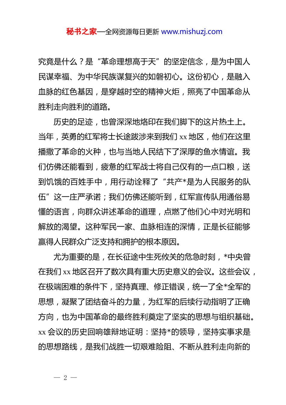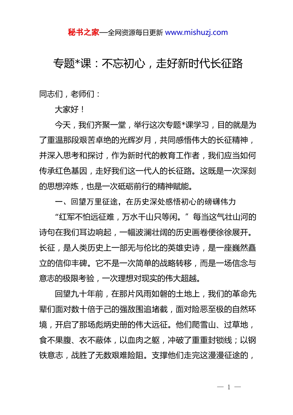 秘书之家—全网资源每日更新 www.mishuzj.com专题*课:不忘初心,走好新时代长征路同志们,老师们:大家好!今天,我们齐聚一堂,举行这次专题*课学习,目的就是为了重温那段艰苦卓绝的光辉岁月,共同感悟伟大的长征精神,并深入思考和探讨,作为新时代的教育工作者,我们应当如何传承红色基因,走好我们这一代人的长征路。这既是一次深刻的思想淬炼,也是一次砥砺前行的精神赋能。一、回望万里征途,在历史深处感悟初心的磅礴伟力“红军不怕远征难,万水千山只等闲。”每当这气壮山河的诗句在我们耳边响起,一幅波澜壮阔的历史画卷便徐徐展开。长征,是人类历史上一部无与伦比的英雄史诗,是一座巍然矗立的信仰丰碑。它不是一次简单的战略转移,而是一场信念与意志的极限考验,一次理想对现实的伟大超越。回望九十年前,在那片风雨如磐的土地上,我们的革命先辈们面对数十倍于己的强敌围追堵截,面对险恶至极的自然环境,开启了那场彪炳史册的伟大远征。他们爬雪山、过草地,食不果腹、衣不蔽体,以血肉之躯,冲破了重重封锁线;以钢铁意志,战胜了无数艰难险阻。支撑他们走完这漫漫征途的,— 1 —秘书之家—全网资源每日更新 www.mishuzj.com究竟是什么?是“革命理想高于天”的坚定信念,是为中国人民谋幸福、为中华民族谋复兴的如磐初心。这份初心,是融入血脉的红色基因,是穿越时空的精神火炬,照亮了中国革命从胜利走向胜利的道路。历史的足迹,也曾深深地烙印在我们脚下的这片热土上。当年,英勇的红军将士长途跋涉来到我们 xx 地区,他们在这里播撒了革命的火种,也与当地人民结下了深厚的鱼水情谊。我们仿佛还能看到,疲惫的红军战士将自己仅有的一点口粮,送到饥饿的百姓手中,用行动诠释了“共产*是为人民服务的队伍”这一庄严承诺;我们仿佛还能听到,红军宣传队用通俗易懂的语言,向群众讲述革命的道理,点燃了他们心中对光明和解放的渴望。这种军民一家、血脉相连的深情,正是长征能够赢得人民群众广泛支持和拥护的根本原因。尤为重要的是,在长征途中生死攸关的危急时刻,*中央曾在我们 xx 地区召开了数次具有重大历史意义的会议。这些会议,在极端困难的条件下,坚持真理、修正错误,统一了全*全军的思想,凝聚了团结奋斗的力量,为红军的后续行动指明了正确方向,也为中国革命的最终胜利奠定了坚实的思想与组织基础。xx 会议的历史回响雄辩地证明:坚持*的领导,坚持实事求是的思想路线,是我们战胜一切艰难险阻、不断从胜利走向新的— 2 —秘书之家—全网资源每日更新 www.mishuzj.com胜利的根本保证。同志们,长征的硝烟早已散尽,但长征精神却如浩瀚星辰永远闪耀在历史的天空。它不是尘封的档案,不是遥远的故事,而是融入我们民族血脉的红色基因,是激励我们不断前行的强大精神动力。回望这段历史,就是要让我们在抚今追昔中,深刻理解我们从哪里来、往哪里去,深刻感悟那份为人民、为民族的初心所蕴含的磅礴伟力。二、解码精神谱系,从长征精神汲取立德树人的不竭动能伟大的实践孕育伟大的精神。在长征的伟大斗争中,中国共产*人和红军将士培育了“乐于吃苦、勇于战斗、重于求实、善于团结”的伟大长征精神。这十六个字,字字千钧,深刻揭示了长征胜利的精神密码,也为我们今天从事教书育人事业,提供了取之不尽、用之不竭的精神滋养。第一,乐于吃苦,是新时代教师的奉献底色长征的苦,是人类生存极限的挑战。但红军将士却以革命乐观主义精神战胜了它。新时代的我们,早已告别了物质的极端匮乏,但“吃苦”的精神内涵却历久弥新。对于我们教师而言,“乐于吃苦”不是一种被动的承受,而是一种主动的价值选择和精神追求。它是扎根乡村、默默耕耘的坚守。面对城乡教育资源的差距,面对乡村的寂寞与清贫,我们选择留下,选— 3 —秘书之家—全网资源每日更新 www.mishuzj.com择坚守,这本身就是一种“吃苦”。它是潜心钻研、精益求精的执着。为了备好一堂课,我们熬灯苦战;为了转化一个后进生,我们苦口婆心。这种为事业的付出,就是新时代的“吃苦”。更是甘为人梯、成就学生的幸福。当我们看到孩子们求知的眼神,看到他们点滴的进步,看到...