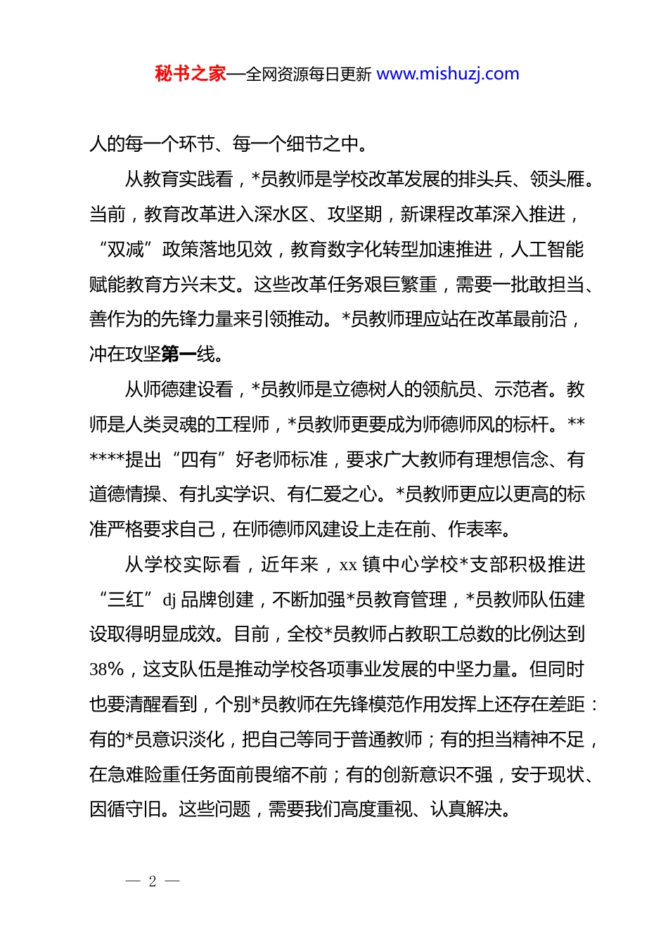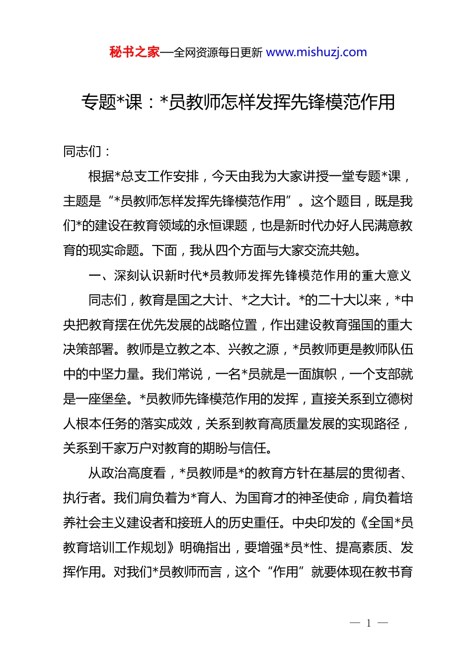 秘书之家—全网资源每日更新 www.mishuzj.com专题*课:*员教师怎样发挥先锋模范作用同志们:根据*总支工作安排,今天由我为大家讲授一堂专题*课,主题是“*员教师怎样发挥先锋模范作用”。这个题目,既是我们*的建设在教育领域的永恒课题,也是新时代办好人民满意教育的现实命题。下面,我从四个方面与大家交流共勉。一、深刻认识新时代*员教师发挥先锋模范作用的重大意义同志们,教育是国之大计、*之大计。*的二十大以来,*中央把教育摆在优先发展的战略位置,作出建设教育强国的重大决策部署。教师是立教之本、兴教之源,*员教师更是教师队伍中的中坚力量。我们常说,一名*员就是一面旗帜,一个支部就是一座堡垒。*员教师先锋模范作用的发挥,直接关系到立德树人根本任务的落实成效,关系到教育高质量发展的实现路径,关系到千家万户对教育的期盼与信任。从政治高度看,*员教师是*的教育方针在基层的贯彻者、执行者。我们肩负着为*育人、为国育才的神圣使命,肩负着培养社会主义建设者和接班人的历史重任。中央印发的《全国*员教育培训工作规划》明确指出,要增强*员*性、提高素质、发挥作用。对我们*员教师而言,这个“作用”就要体现在教书育— 1 —秘书之家—全网资源每日更新 www.mishuzj.com人的每一个环节、每一个细节之中。从教育实践看,*员教师是学校改革发展的排头兵、领头雁。当前,教育改革进入深水区、攻坚期,新课程改革深入推进,“双减”政策落地见效,教育数字化转型加速推进,人工智能赋能教育方兴未艾。这些改革任务艰巨繁重,需要一批敢担当、善作为的先锋力量来引领推动。*员教师理应站在改革最前沿,冲在攻坚第一线。从师德建设看,*员教师是立德树人的领航员、示范者。教师是人类灵魂的工程师,*员教师更要成为师德师风的标杆。******提出“四有”好老师标准,要求广大教师有理想信念、有道德情操、有扎实学识、有仁爱之心。*员教师更应以更高的标准严格要求自己,在师德师风建设上走在前、作表率。从学校实际看,近年来,xx 镇中心学校*支部积极推进“三红”dj 品牌创建,不断加强*员教育管理,*员教师队伍建设取得明显成效。目前,全校*员教师占教职工总数的比例达到38%,这支队伍是推动学校各项事业发展的中坚力量。但同时也要清醒看到,个别*员教师在先锋模范作用发挥上还存在差距:有的*员意识淡化,把自己等同于普通教师;有的担当精神不足,在急难险重任务面前畏缩不前;有的创新意识不强,安于现状、因循守旧。这些问题,需要我们高度重视、认真解决。— 2 —秘书之家—全网资源每日更新 www.mishuzj.com二、做理想信念的“播种者”,在培根铸魂中彰显*员本色理想信念是共产*人精神上的“钙”。对*员教师而言,理想信念不仅是个人精神追求,更是立德树人的根本所在。我们要做好三个层面的“播种者”。要在理论武装上做学生的“播种者”。*员教师必须把学习贯彻**************思想作为首要政治任务,系统学习*的创新理论,做到学深悟透、融会贯通。要把理论学习与教育教学紧密结合起来,用*的创新理论武装头脑、指导实践、推动工作。2025 年,我校*员教师累计开展理论学习、研讨实践 24 次,撰写心得体会 186 篇,理论学习的深度和广度都有新的提升。要把理论学习成果转化为教书育人的生动实践,在课堂上讲好中国故事、传播中国声音,让*的创新理论“飞入寻常百姓家”,在学生心中播下信仰的种子。要在价值引领上做学生的“播种者”。青少年阶段是人生的“拔节孕穗期”,最需要精心引导和栽培。*员教师要善于将社会主义核心价值观融入教育教学全过程,把爱国主义教育、理想信念教育、品德教育贯穿于学科教学和日常管理之中。要帮助学生扣好人生第一粒扣子,树立正确的世界观、人生观、价值观,培养学生爱*爱国爱社会主义的真挚情感。一年来,我校*员教师组织开展“传承红色基因、争做时代新人”等 zt 教育— 3 —秘书之家—全网资源每日更新 www.mishuzj.com活动 36 场次,参与学生达 2800 余人次,有效激发了学生的爱国热情和奋斗精神。要在精神传承上做学生的“播种者”。我们 xx 镇是一片有着光荣革命传统的热土,红...